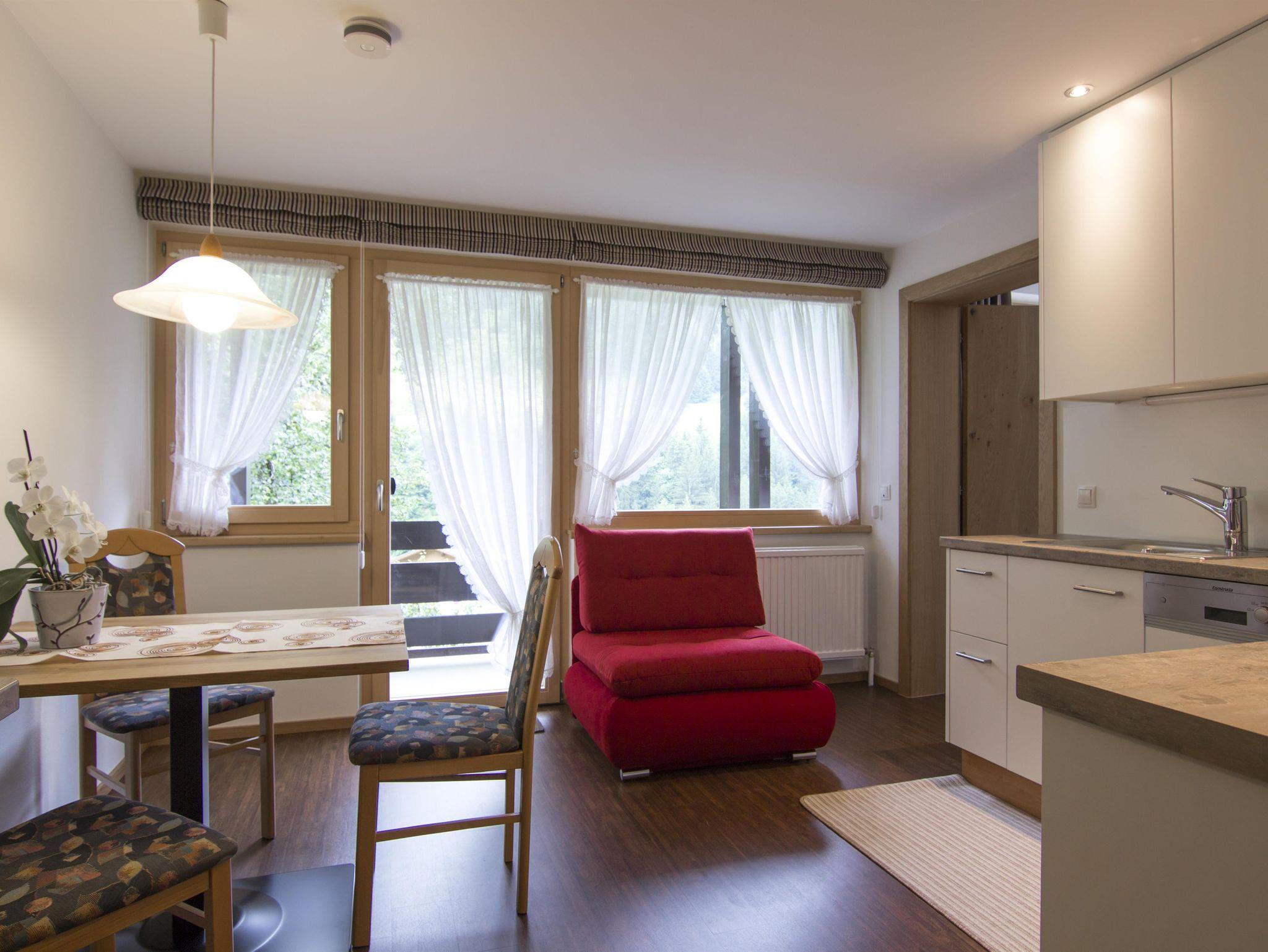 Wohnung 2 mit 33m² für 2 Personen, verfügt über ein Doppelzimmer, einem Badezimmer mit Dusche/WC, einer Küche mit Esstisch, kleine Sitzcouch und einem Südbalkon. Die Küche ist komplett ausgestattet mit 4 Platten E-Herd, Backofen, Geschirrspülmaschine, Filterkaffeemaschine, Soda Stream, Wasserkocher und Toaster. Weitere Details findet ihr auf unserer Homepage