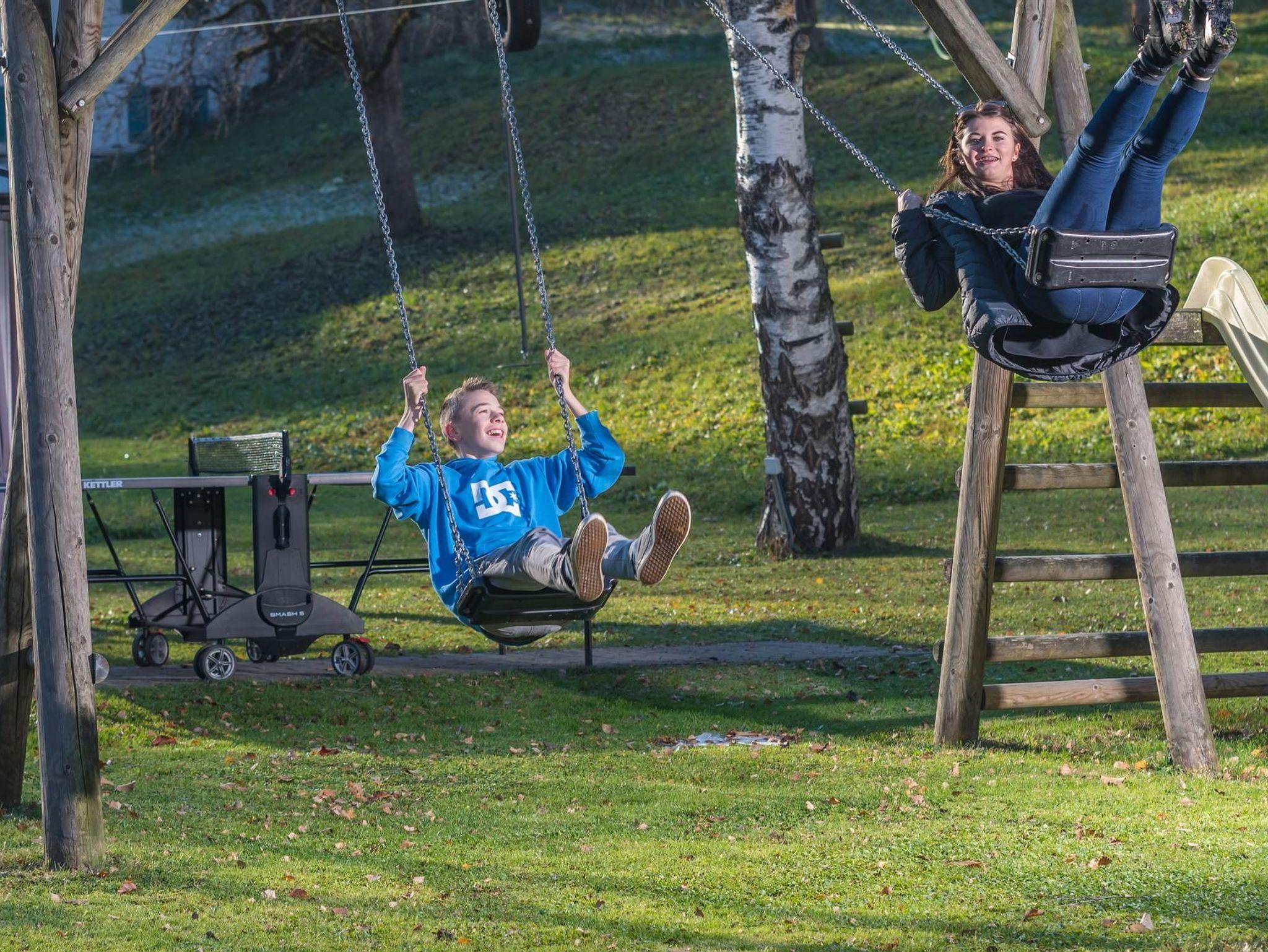 Spielplatz mit Grillplatz, Gorillarutsche, Schaukeln, Rutschbahn, Tischtennis sowie Sandkasten und Riesentrampolin. Allwetterbad Aquarena sowie der beleuchtete Radweg sind in wenigen Schritten erreichbar.