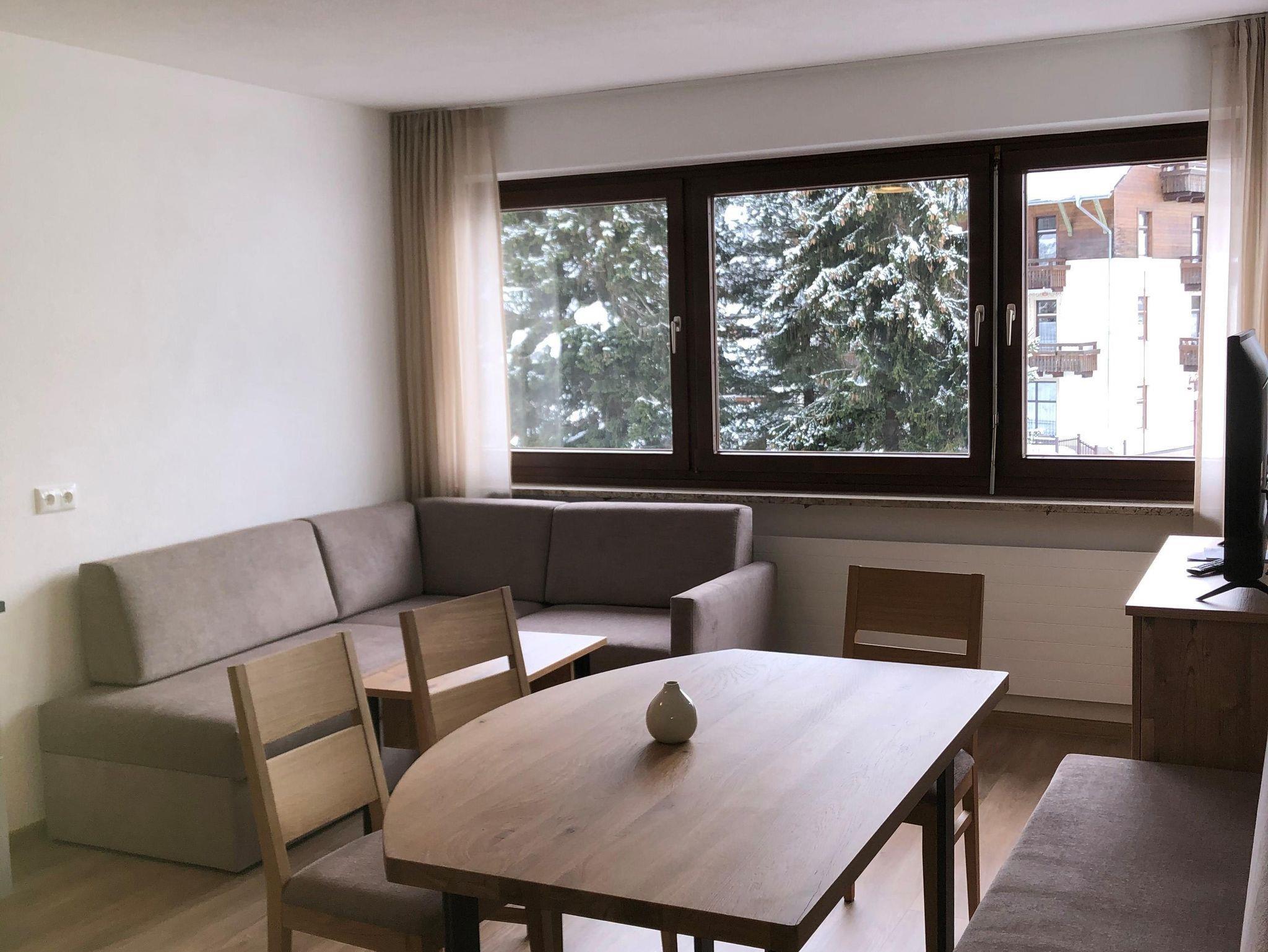 28 m², neu saniertes Appartement mit Wohn-Schlafraum, Doppelbett, Küche - komplett eingerichtet, Geschirrspüler, Kühlschrank, E-Herd, Mikrowelle, HD-Flat TV, Balkon m. Bergblick, Vorraum, Garderobe mit Sitzgelegenheit, gratis W-Lan, Tresor.