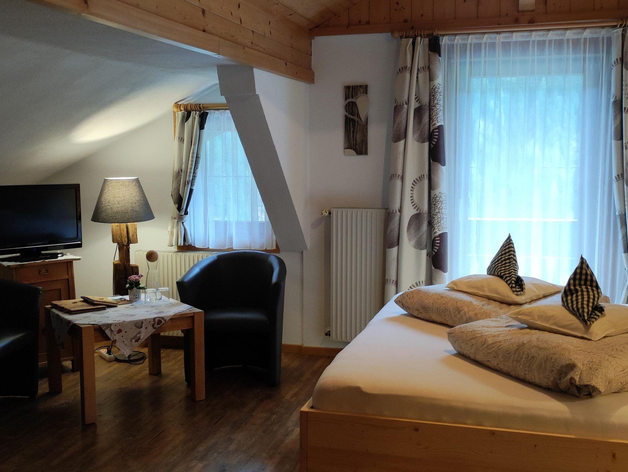Sehr großes,nach Süden gerichtetes Zimmer Aussicht auf den Fluss und Wald mit Balkon.Eine Sitzecke mit Couch für gemütliche Stunden,um den Tag revue passieren zu lassen.Glaskrug mit Bergqellwasser jeden Tag frisch gefüllt.