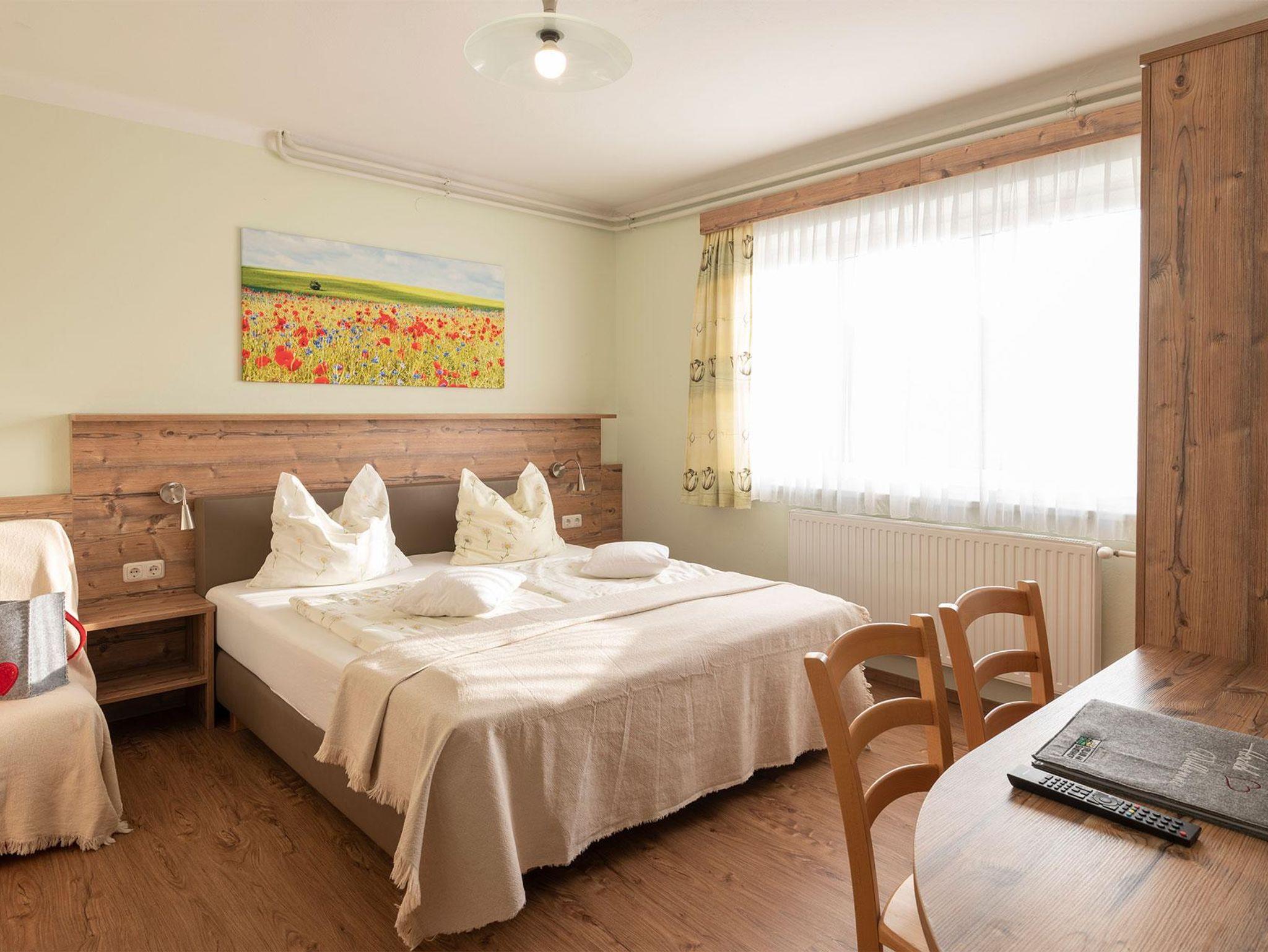 Das Vierbettzimmer inklusive Bad und WC ist mit Doppelbett und Stockbett ausgestattet – also ideal für Familien mit zwei Kindern. Weiters steht den Urlaubern eine gemütliche Sitzecke mit Tisch zur Verfügung.