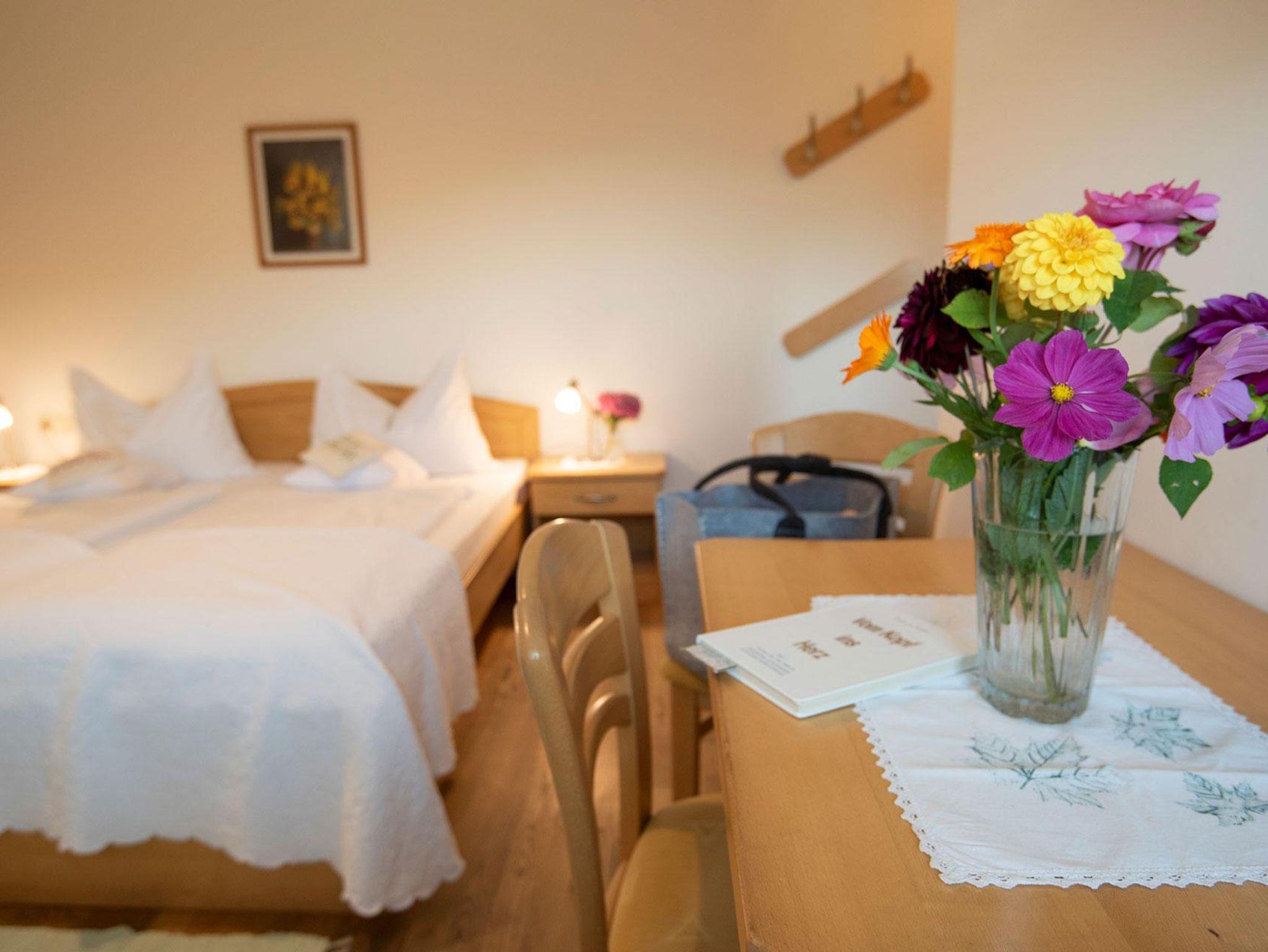 In zwei von den Doppelzimmern gibt es eine ausziehbare Couch. Im Erlen- und im Fichten-Zimmer haben Sie eine Aussicht auf die weitreichende Blumenwiese und den angrenzenden Wald. Im Erlen-Zimmer blicken Sie sogar auf die Fischbacher Alpen.