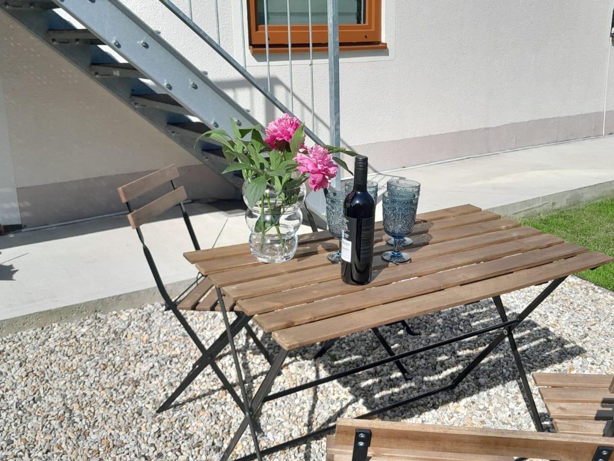 Ein kleiner Garten mit Sitzgelegenheit befindet sich direkt neben dem privaten Eingang.