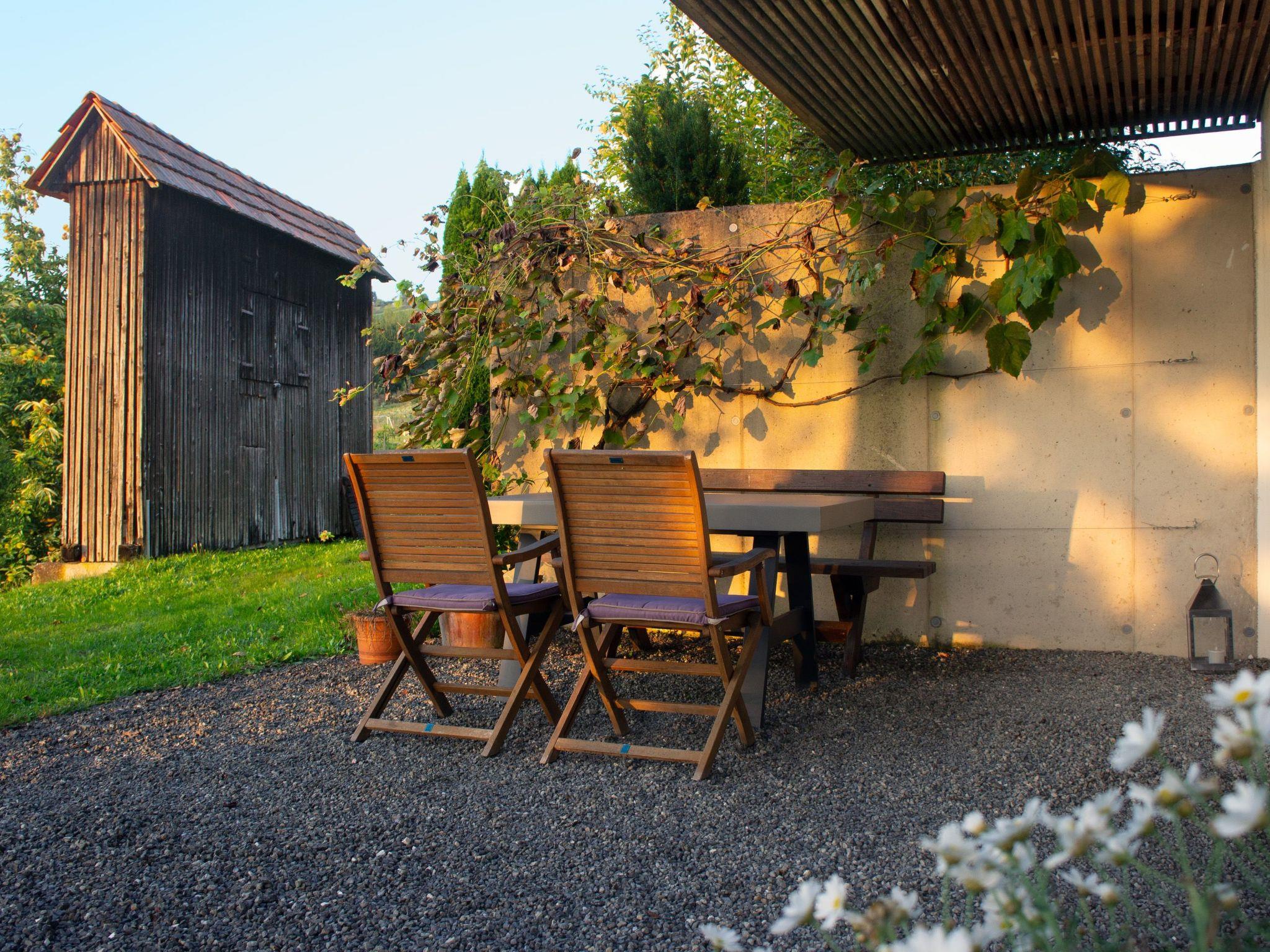 Im Gartenbereich können Sie sich ausruhen. Gartenmöbel ermöglichen Ihnen im Freien zu speisen. Auf den Liegestühlen können Sie ein Sonnenbad nehmen. Einen Gaumenschmaus bereitet das selbstgpflückte Obst der Obstbäume und Weinreben.