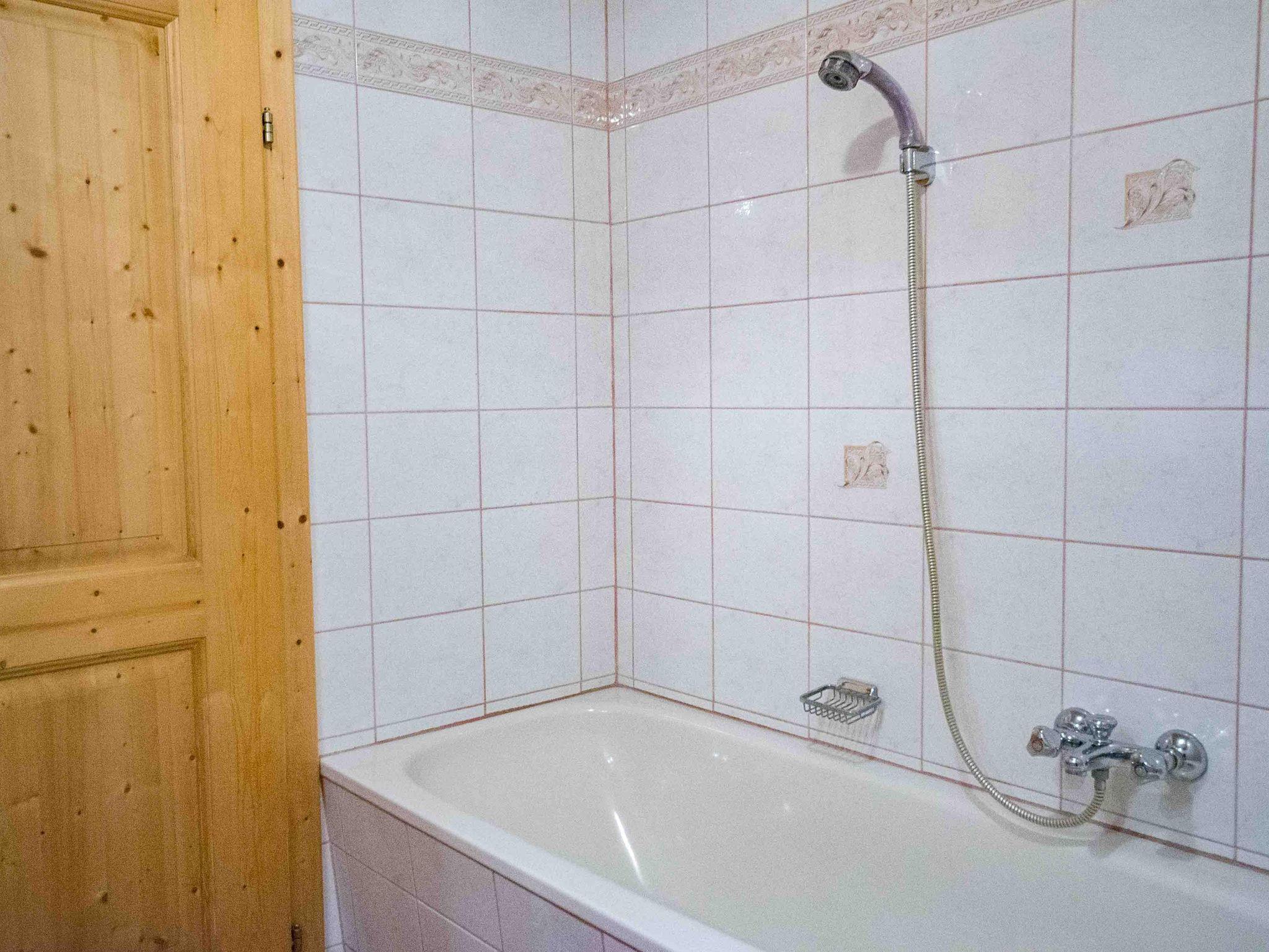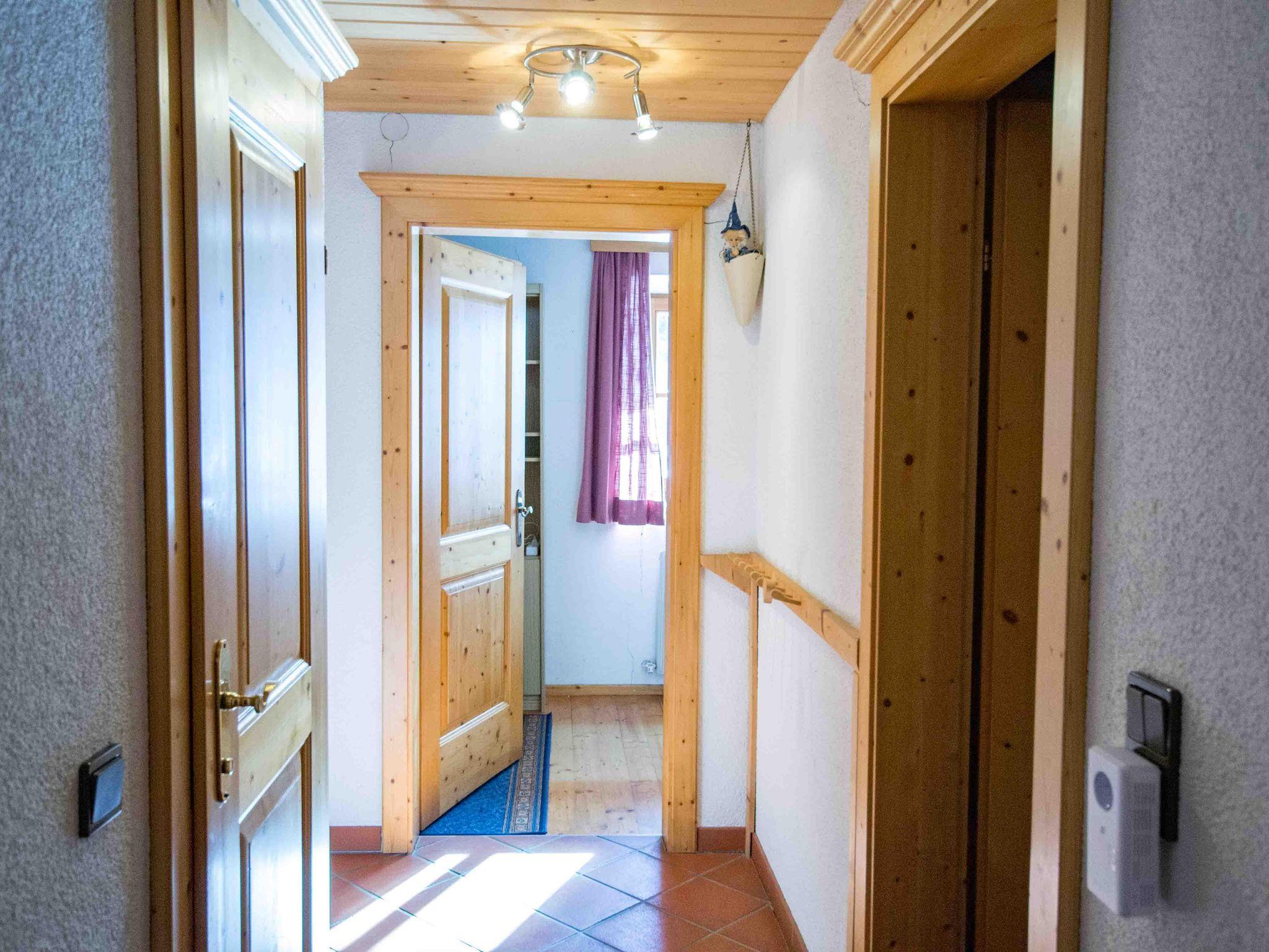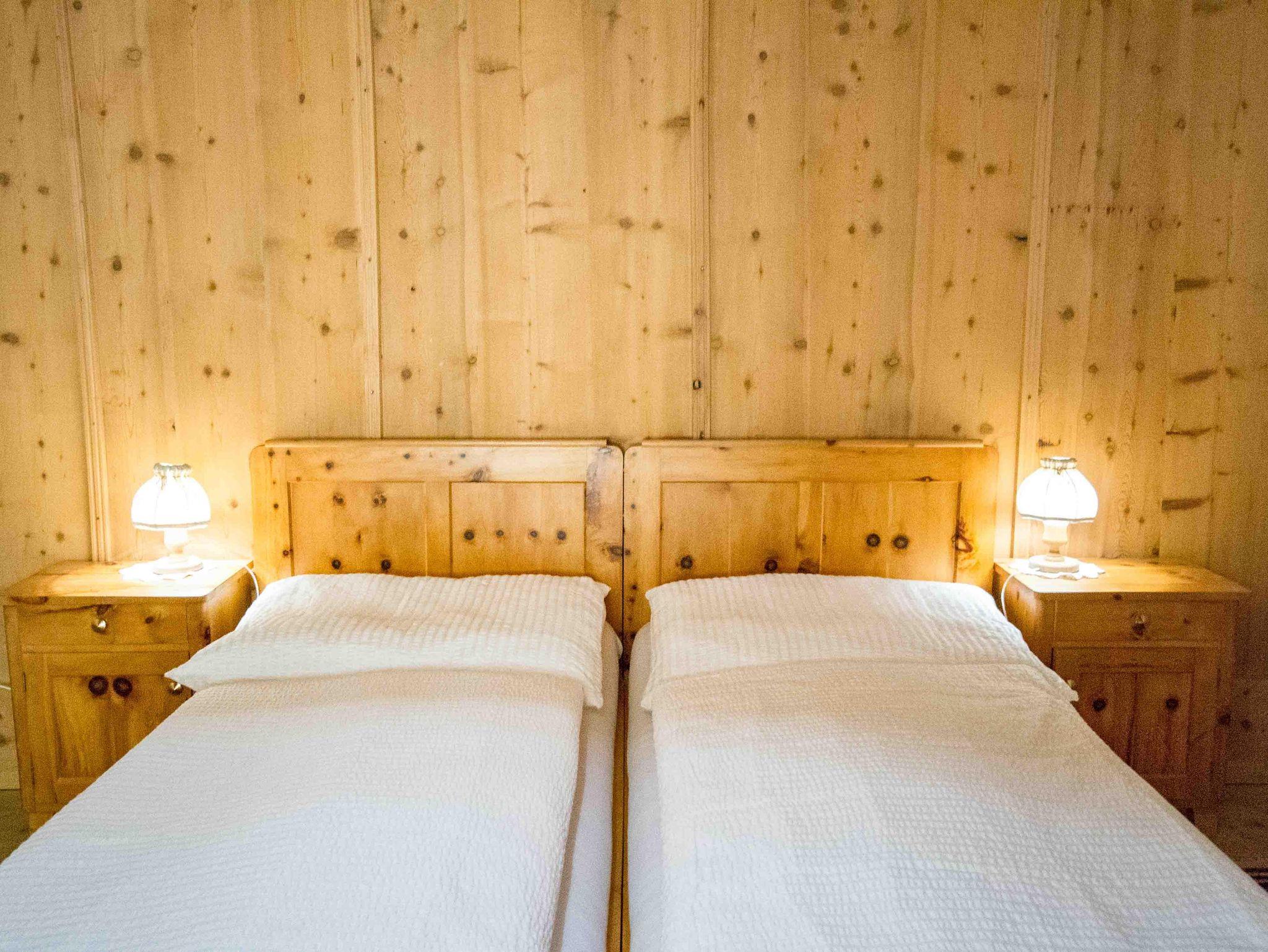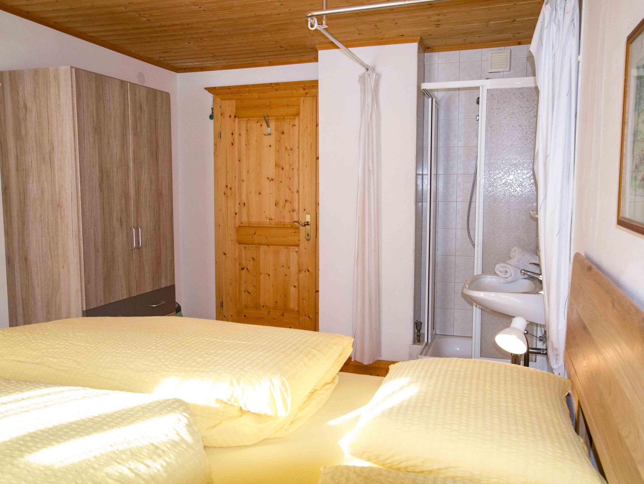Die große Ferienwohnung im ersten Stock besteht aus drei Schlafzimmern, einer Küche und einem Badezimmer mit getrennter Toilette. Vom Schlafzimmer und der Küche gibt es eine Tür zum Balkon mit herrlichem Ausblick nach Osten auf den höchsten Berg der Region, dem Olperer und nach Süden talauswärts. Das große Schlafzimmer mit Doppelbett ist komplett in Holz getäfelt und mit Zirbenmöbeln ausgestattet. Auf Anfrage kann noch ein weiteres Doppelzimmer im selben Stock gemietet werden.
