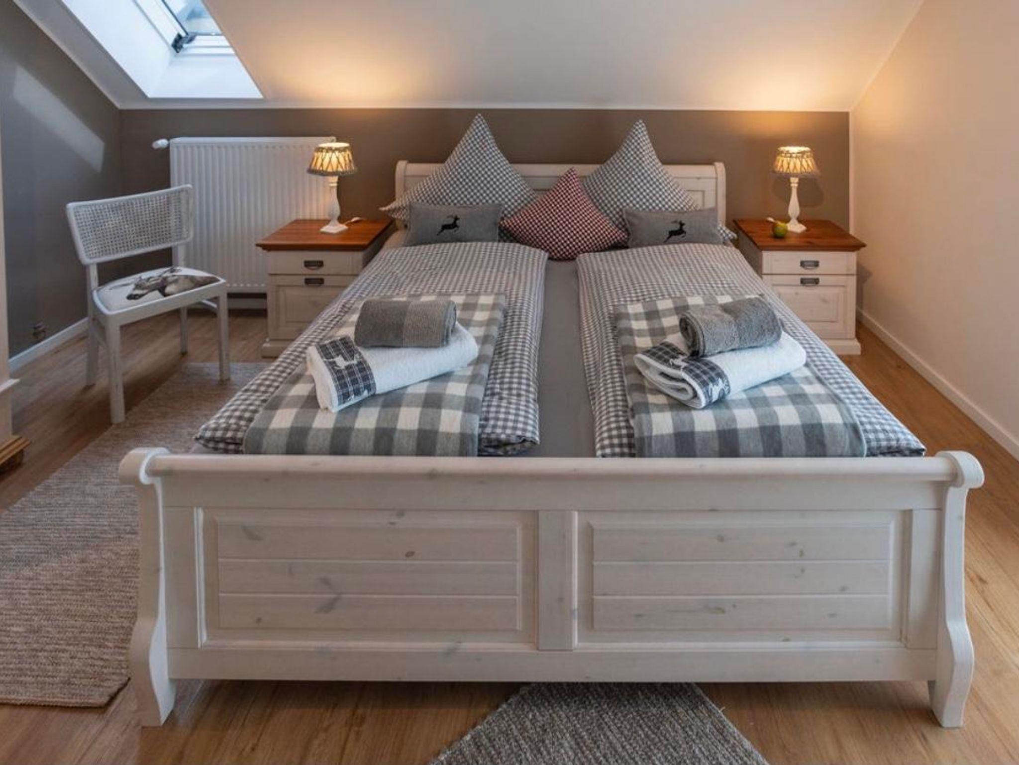 Im Obergeschoss drei Schlafzimmer im Landhausstil mit Holzbodenoptik, Vollholzmöbeln und Doppelbett, liebevollen Details und Mansarde – allesamt mit Balkon, zwei davon mit einem Velux - Dachflächenfenster; Jalousien /Außen - Rollläden bei allen Fenstern zum Verdunkeln, zusätzliches WC mit Waschbecken