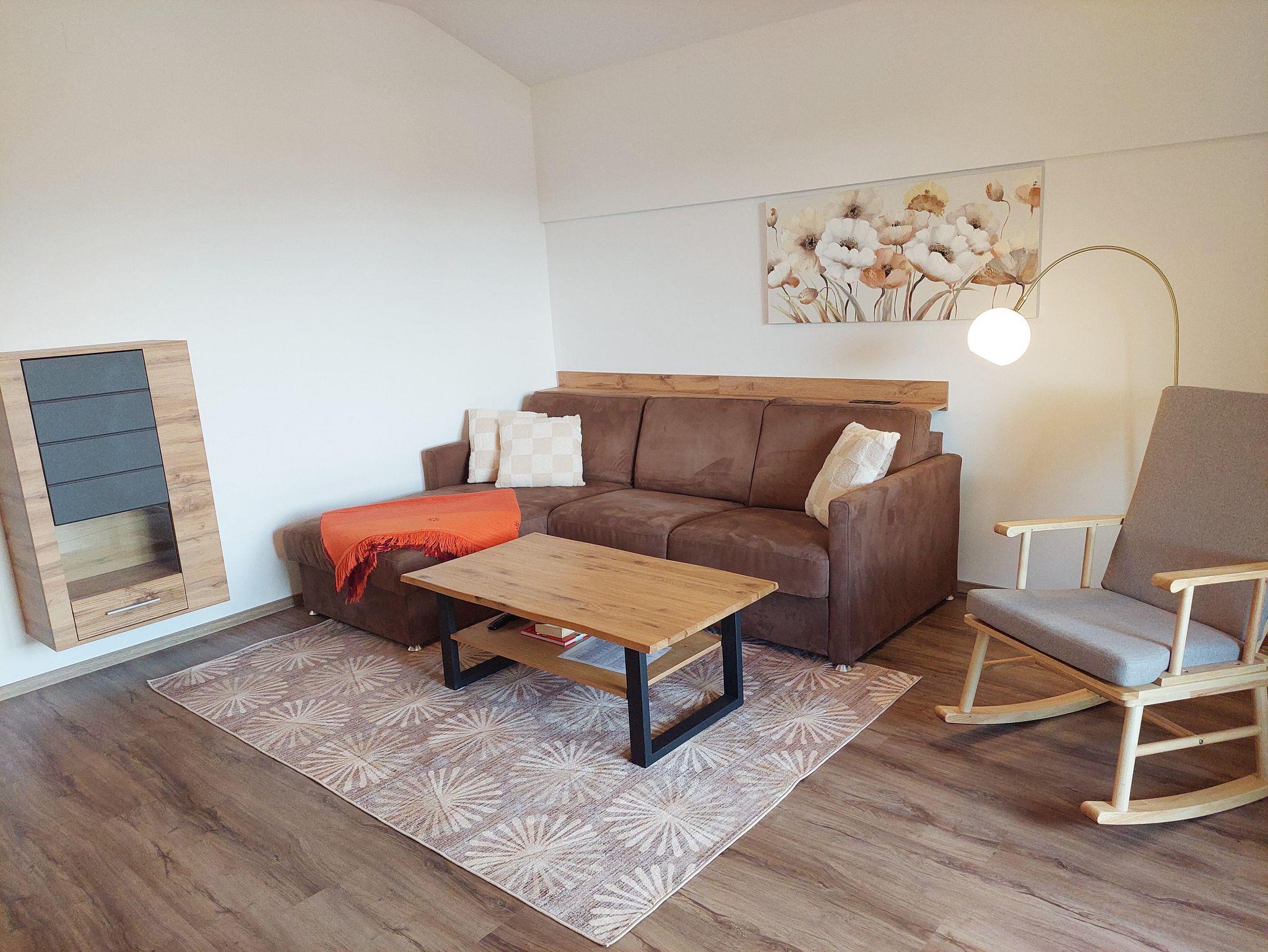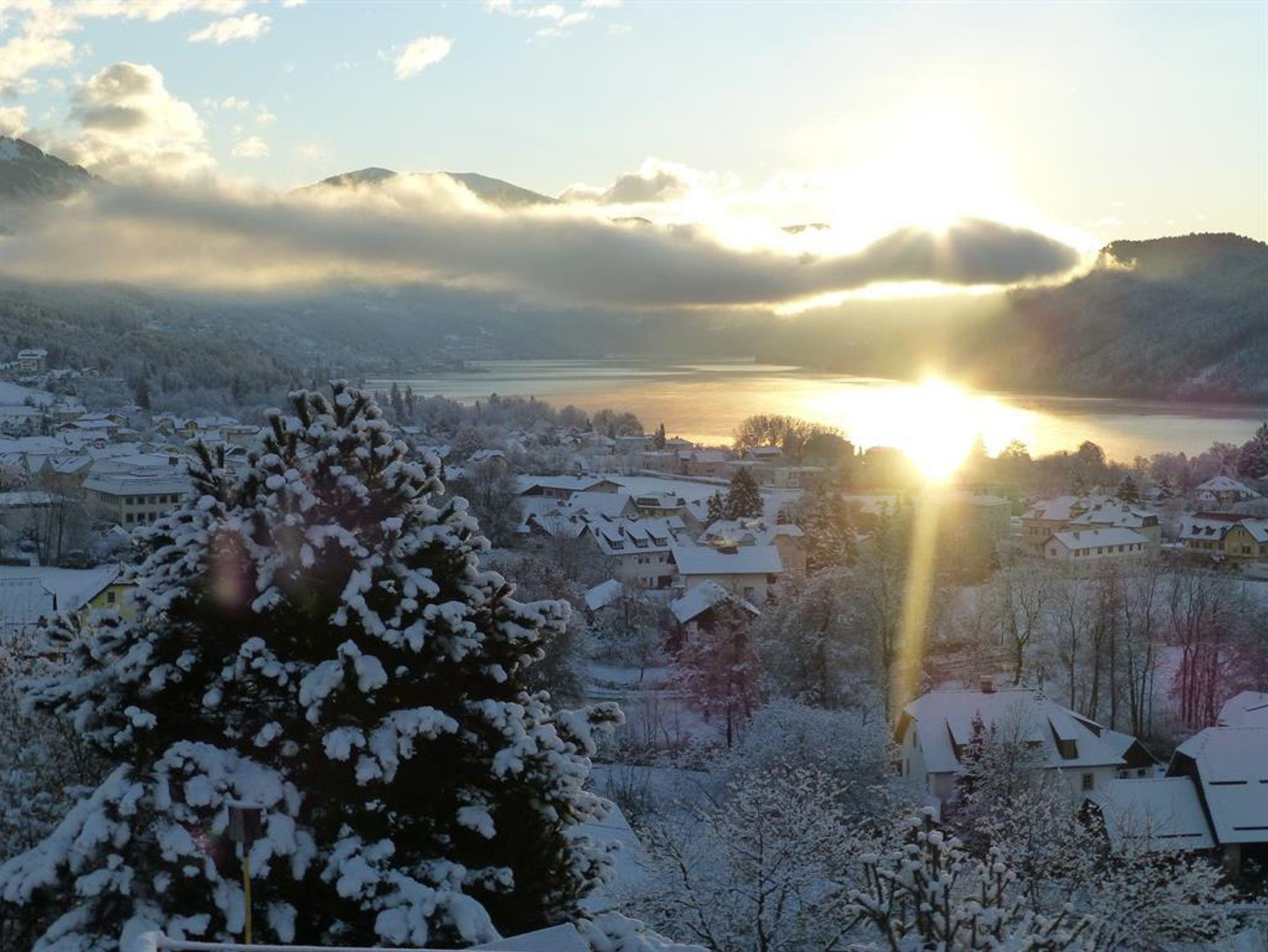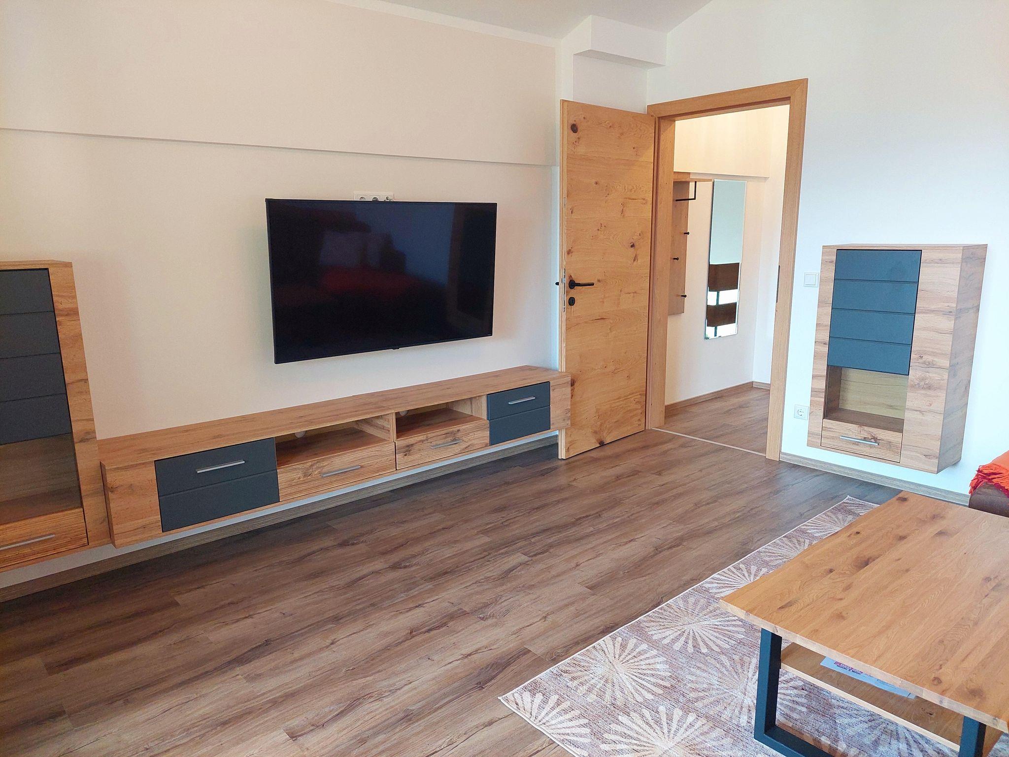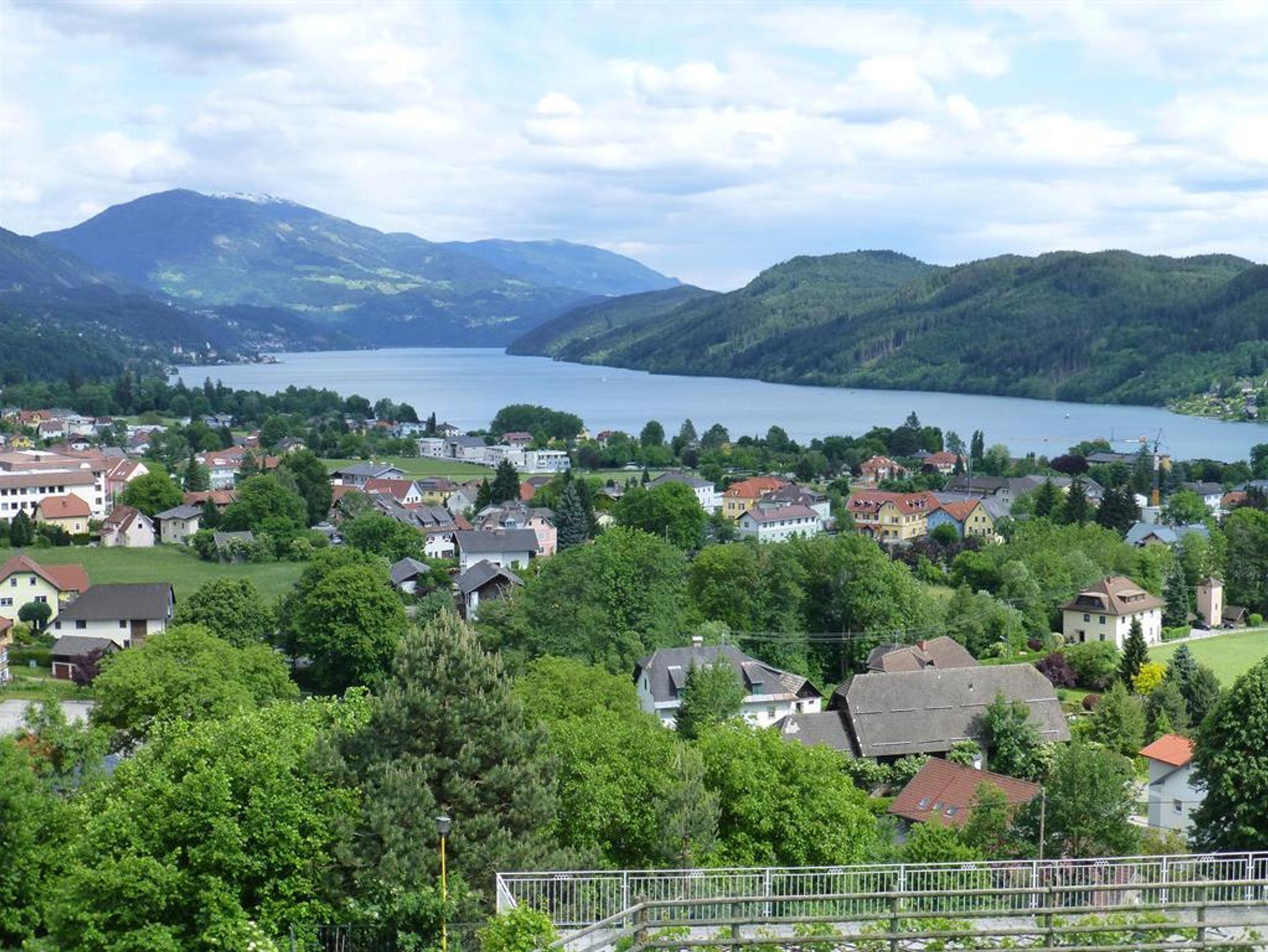 Wohnzimmer mit SAT-TV, W-LAN und Bad (Dusche, WC), Haar Föhn sowie ein Balkon (Ost) mit spektakulären Blick über den ganzen Millstätter See, den Ort und die umliegende Berglandschaft und ein Balkon (Süd) mit Blick auf das Goldeck.