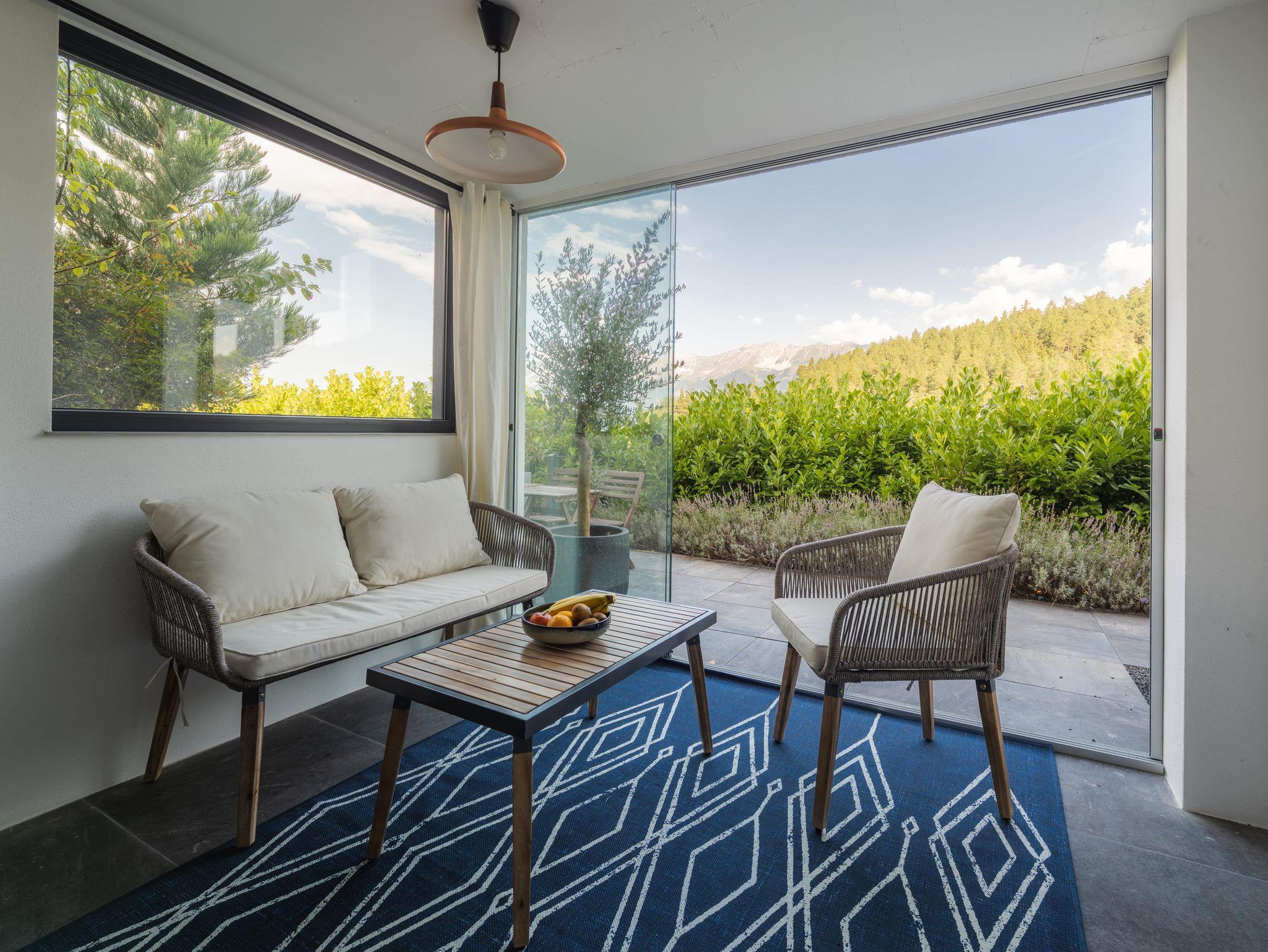 Die sonnige Terrasse (neu) bietet einen wundervollen Blick auf die umliegende Bergkette. Vor allem in den Abendstunden gibt es nichts schöneres, als der untergehenden Sonne bei einem Gläschen Wein zuzuschauen.