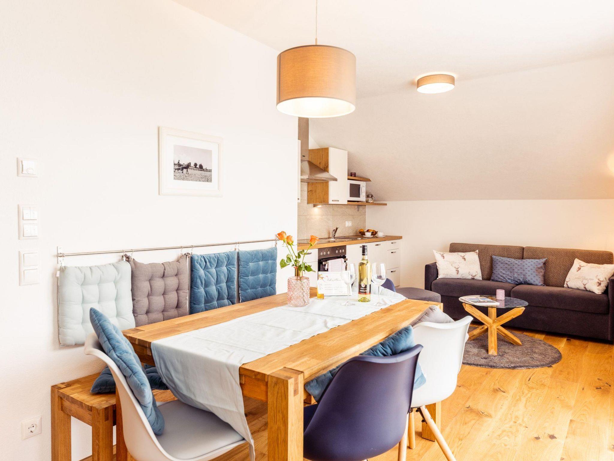 Unsere Apartment Sonnegger See ist ideal für größere Familien mit bis zu 4 Kindern oder Freundesgruppen. Hier genießt ihr einen kleinen West-Balkon sowie einen hellen Wohn-Essbereich mit einer großen Ausziehcouch, zwei separate Schlafzimmer mit zusätzlich Platz für ein Gitterbett. Überdies ist die Küche voll ausgestattet. In den Schlafzimmern finden sie Zirben-Vollholzmöbel.