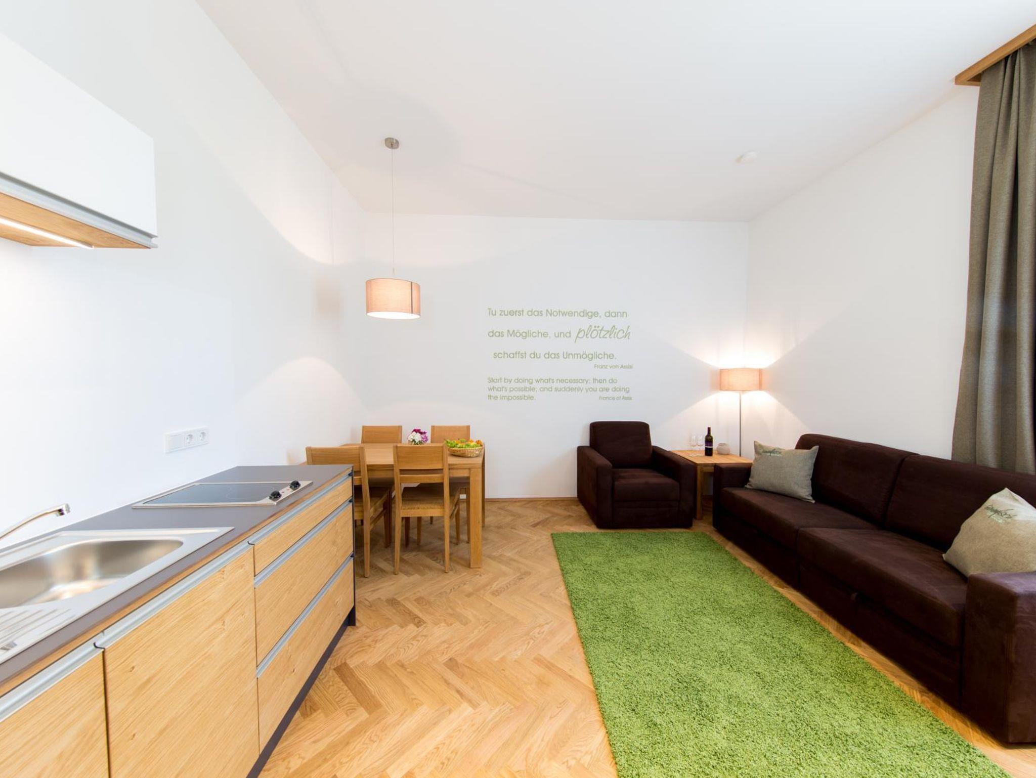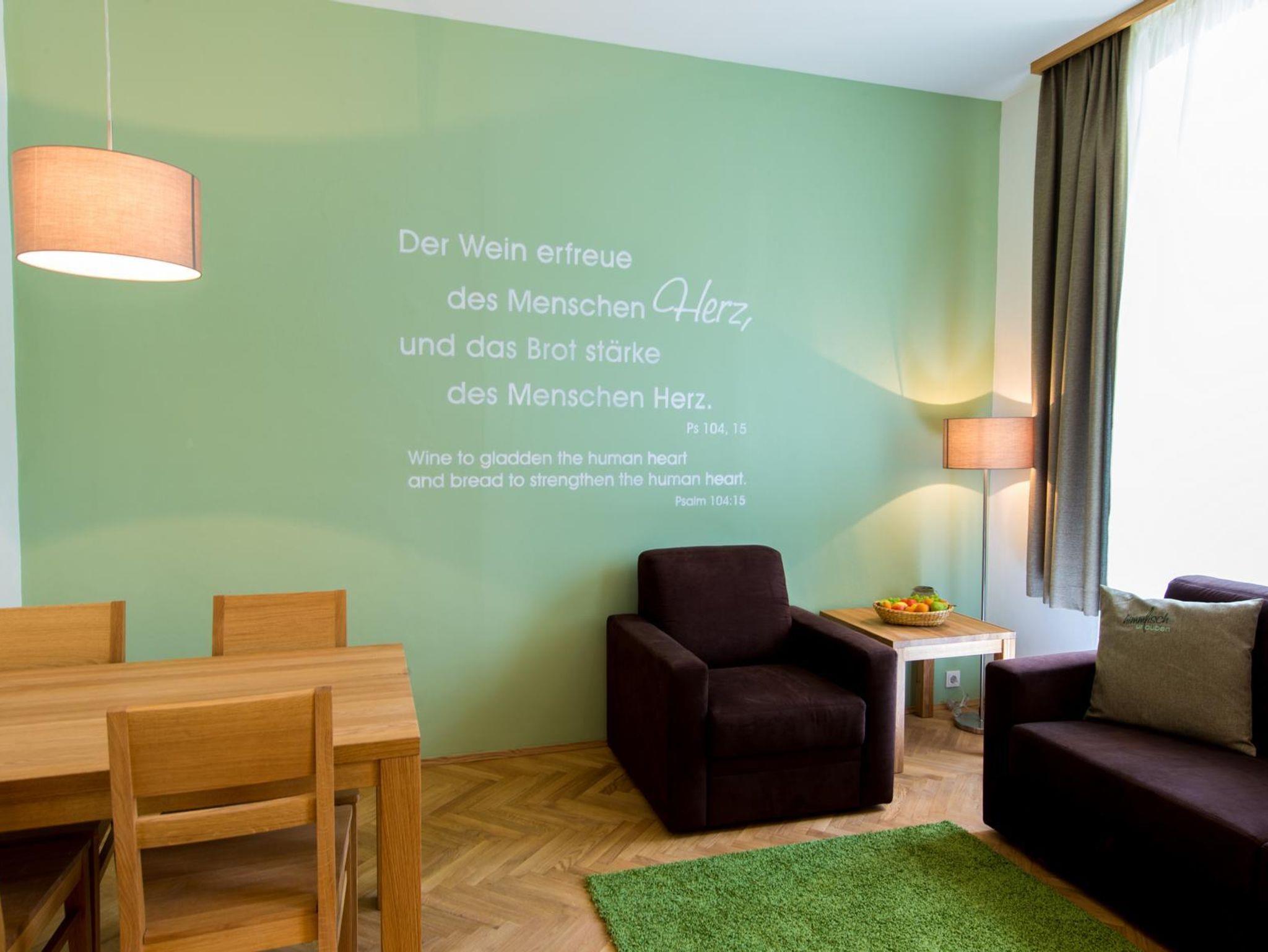 Von diesem Appartement haben Sie einen einzigartigen Ausblick: Direkt vom Wohnzimmer blicken Sie auf den Altar der angrenzenden Kirche. Viel Holz und natürliche Farben prägen das Appartement, das nach dem Pfarrpatron benannt ist. Ihre Unterkunft befindet sich im 1. Obergeschoss und bietet Ihnen eine ruhige, besinnliche Atmosphäre für zwei, maximal drei Personen.