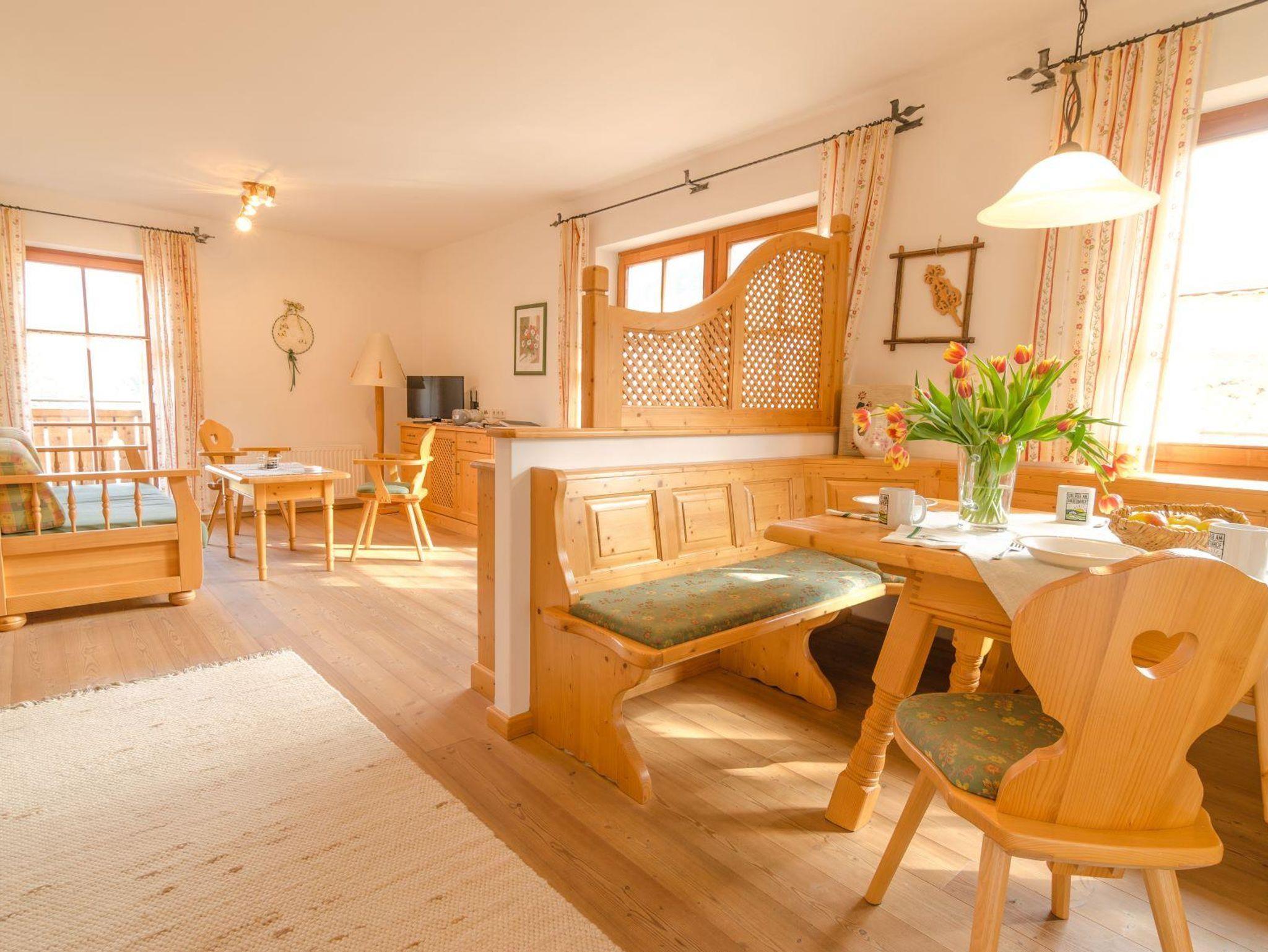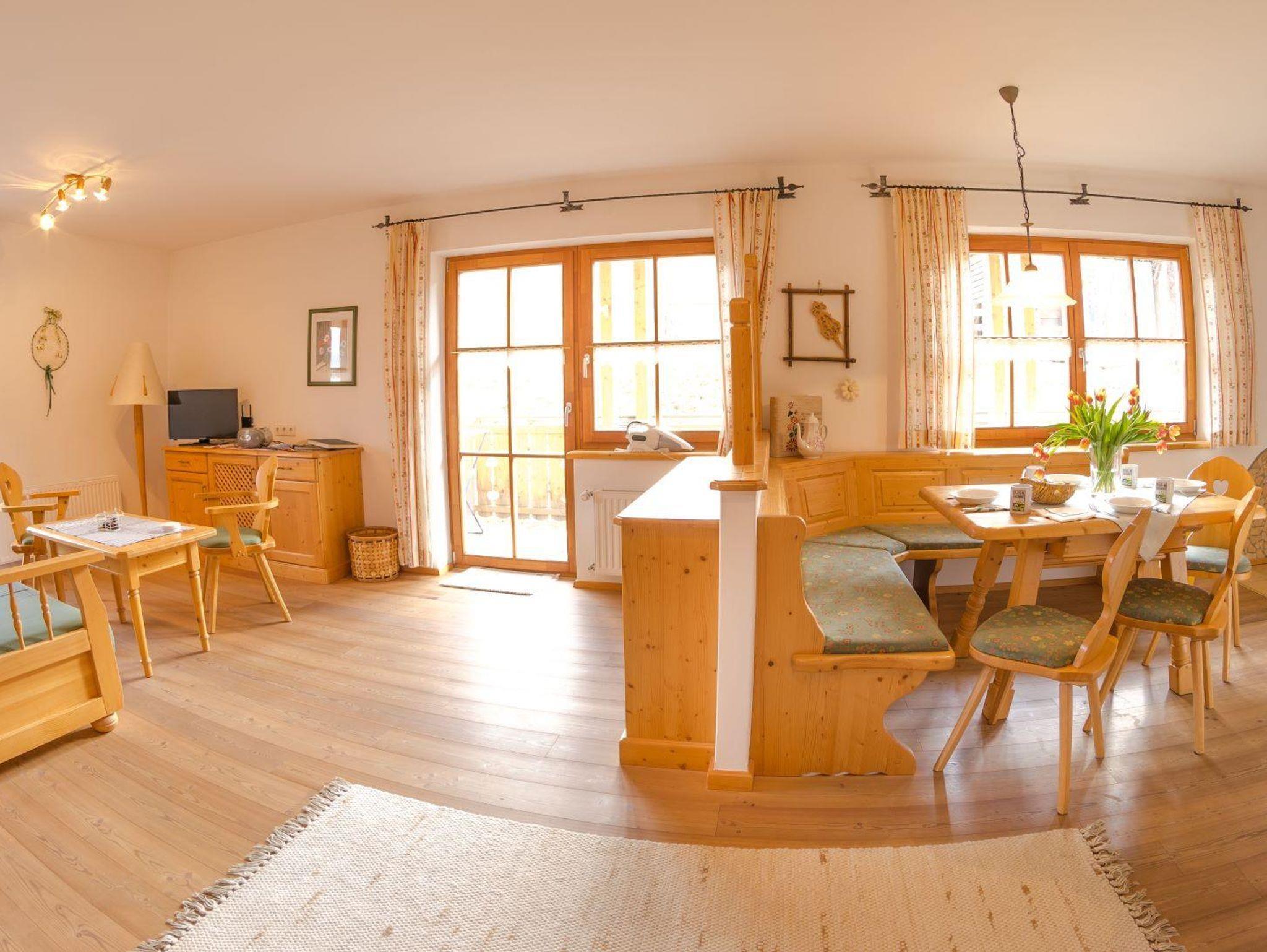 Die Appartements “Gänseblümchen” und “Adlerhorst” im Ferienhaus “Gretl” sind mit je 68m² etwas größer und jeweils mit einem 2- und 3-Bettzimmer ausgestattet. Heimelige, gemütliche, komfortable Vollholzmöbel-Wohnung mit viel Liebe zum Detail eingerichtet. Vorraum mit Garderobe, Wohnbereich mit SAT-TV, W-LAN, Radio, Couch, Couchtisch, Kleinküche mit Essecke für maximal 6 Personen, Geschirrspüler, Wasserkocher, Mikrowelle, Kaffeefiltermaschine, E-Herd mit 4 Platten, Kühlschrank mit Gefrierfach, Koch- und Essgeschirr, u.s.w. Zwei getrennte Schlafzimmer (3- und 2-Bett Zimmer), Dusche mit doppeltem Waschbecken, WC getrennt. Balkon nach Süden mit Blick auf die Bergwiesen und nach Osten zu den Pferden.