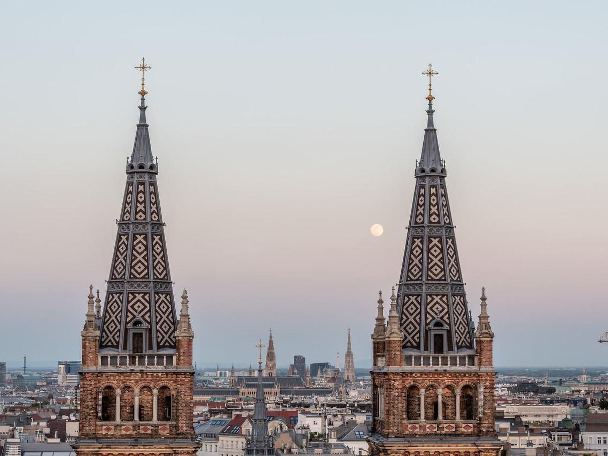 Der Außenbereich des Apartments im 11. Stock bietet einen atemberaubenden Blick über Wien, mit Direktblick auf den Stephansdom, das Riesenrad, die Votivkirche und viele weitere Sehenswürdigkeiten. Dank der Lage 45 m über dem Stadtniveau können Sie sich über eine unvergleichliche Aussicht auf über hundert markierte Punkte, Türme, Schlösser und Burgen in der Nähe freuen.