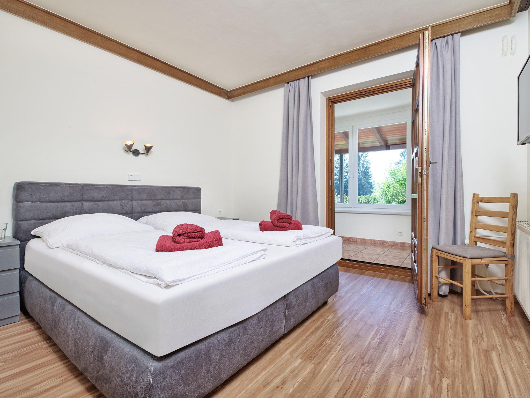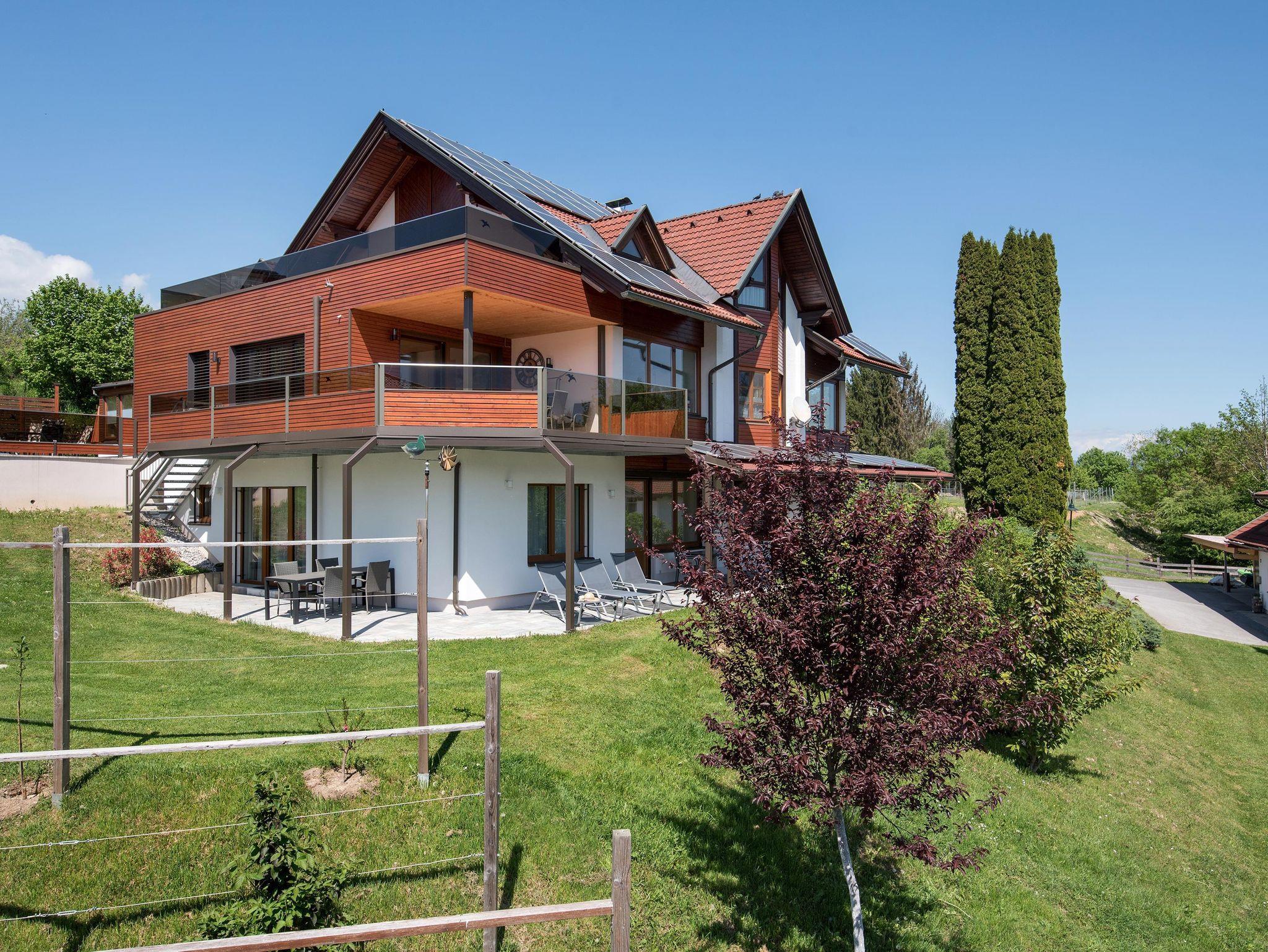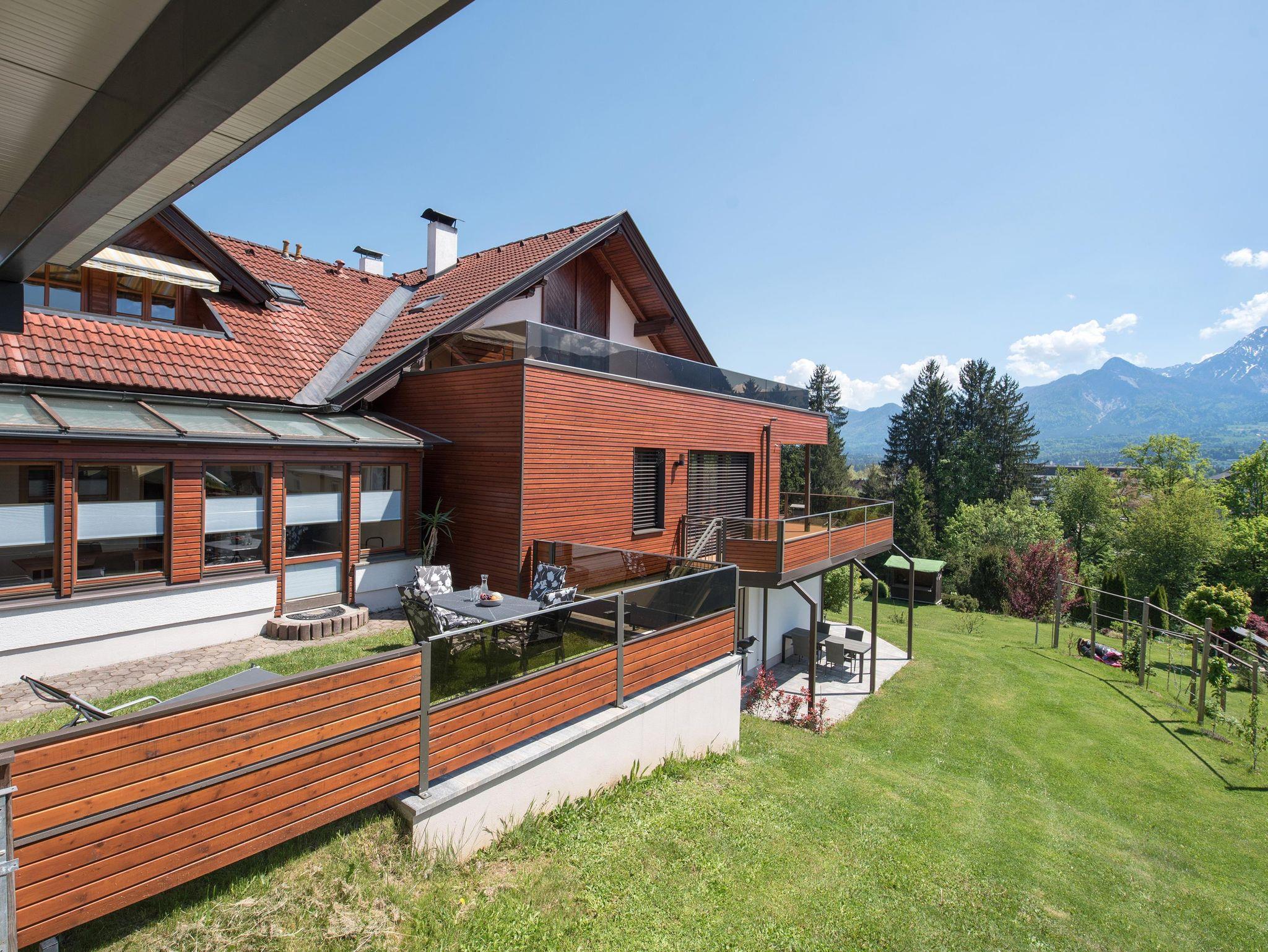 Appartement mit Schlafzimmer (Boxspringbett), separatem Schlafzimmer (drei Einzelbetten), Wohnzimmer mit großzügiger Couch und Wohnküche mit Backrohr, Geschirrspüler, Geschirr für max. 7 Personen. SAT-TV, Bad mit zwei Waschbecken, D/WC, Terrasse mit Gartenbereich mit herrlichem Blick auf die Gebirgswelt der Karawanken in südlicher Lage.