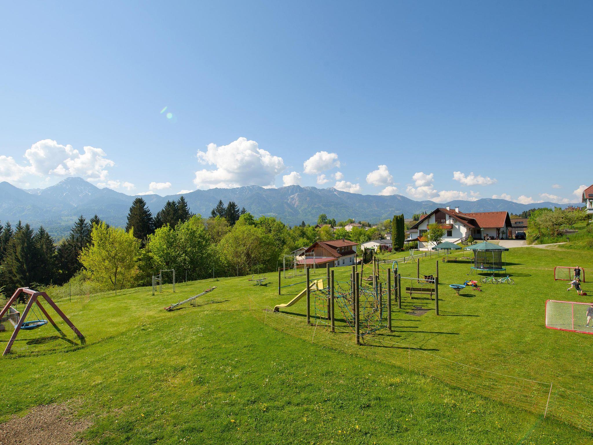 Unser familienfreundliches Appartementhaus Drobollach liegt in ruhiger, sonniger Lage mit einem sehr großen Kinderspielplatz und Blick auf den Faaker See und die Gebirgskette der Karawanken.