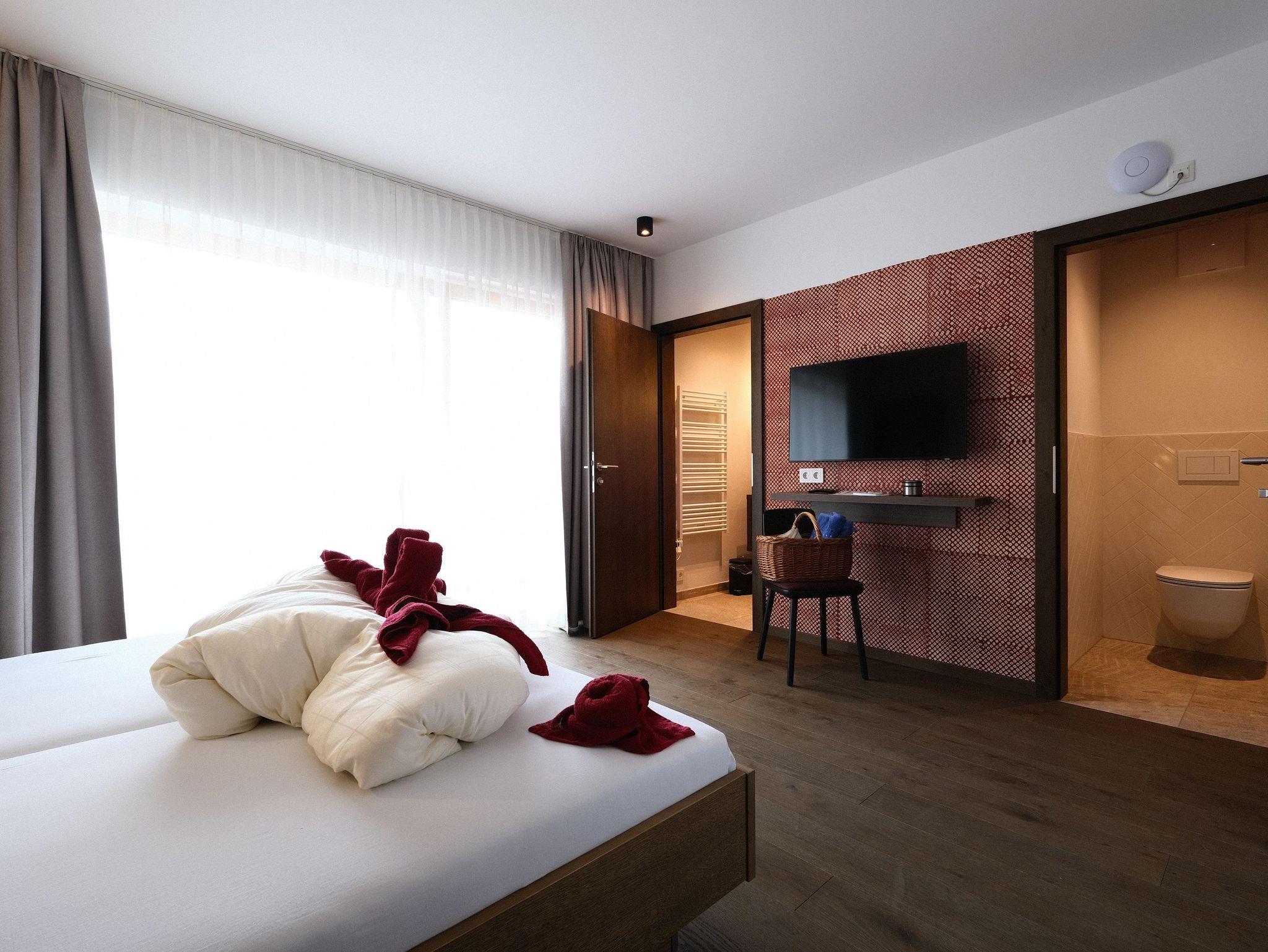 Das Zimmer ist modern eingerichtet und verfügt über ein separates Badezimmer mit Dusche, Waschbecken und Kosmetikspiegel sowie ein separates WC. Ein Flat-TV sorgt für Unterhaltung, während Verdunkelungsvorhänge erholsamen Schlaf garantieren. Hand- und Duschtücher sowie Bettwäsche sind selbstverständlich inklusive.