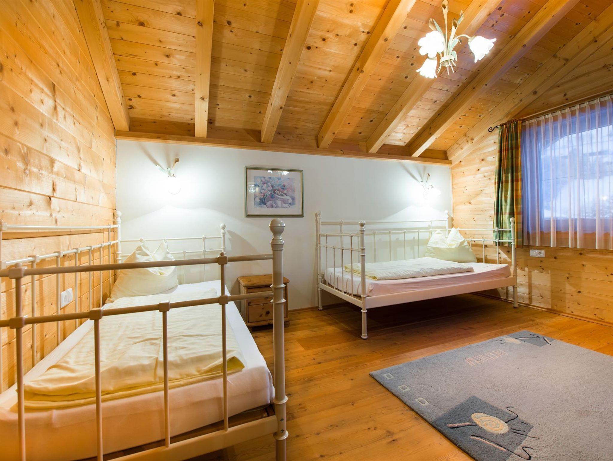 Über eine schöne Holztreppe erreichen Sie die drei Schlafzimmer, 2 x mit Doppelbett und Balkon und 1 x mit 2 getrennten Betten und SAT-TV. Weiters finden Sie im ersten Stock ein Badezimmer mit Badewanne/Dusche und ein extra WC.