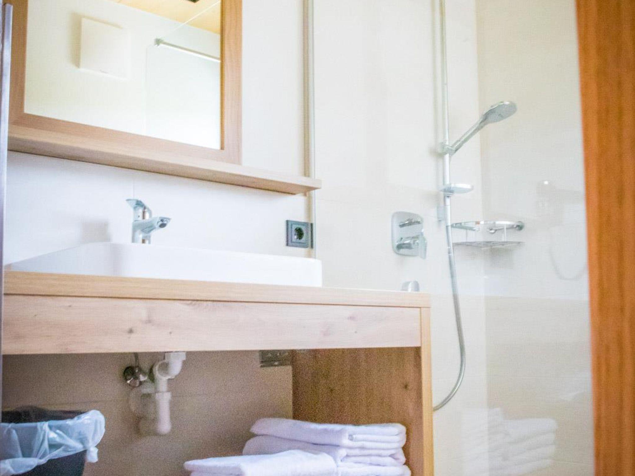 schönes großes Wohlfühl-Badezimmer mit Dusche, Handtücher und Föhn, getrenntes WC