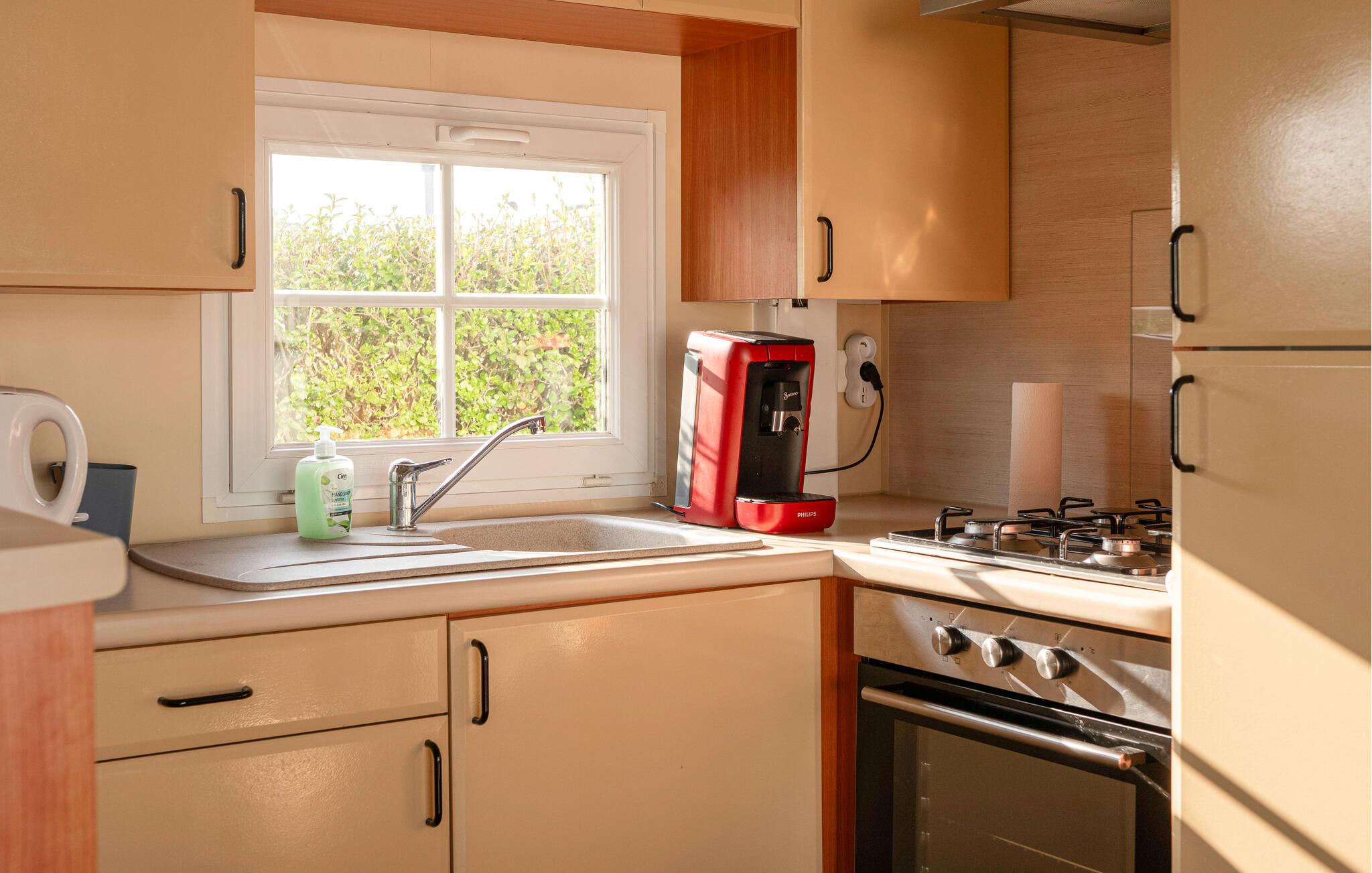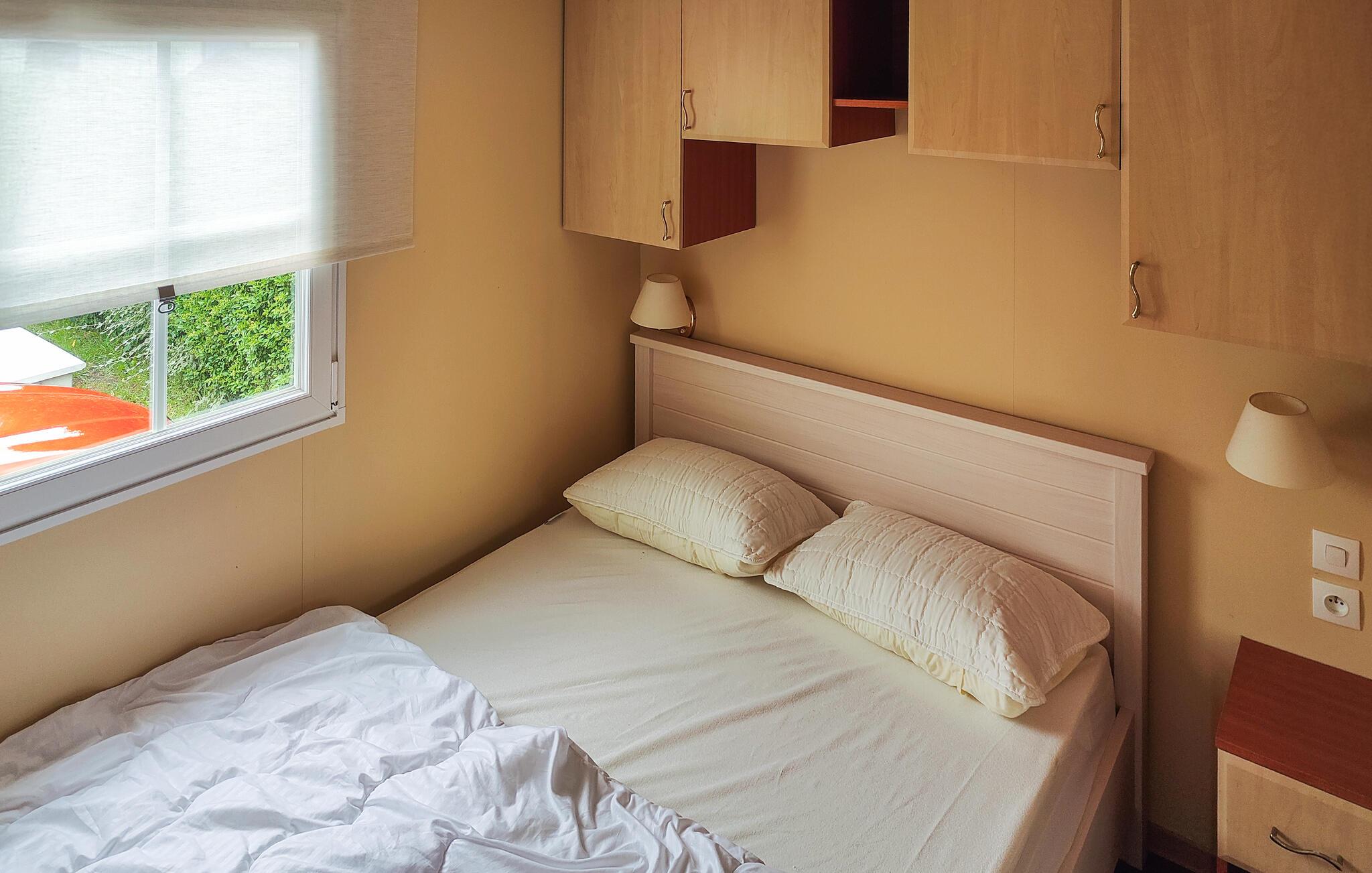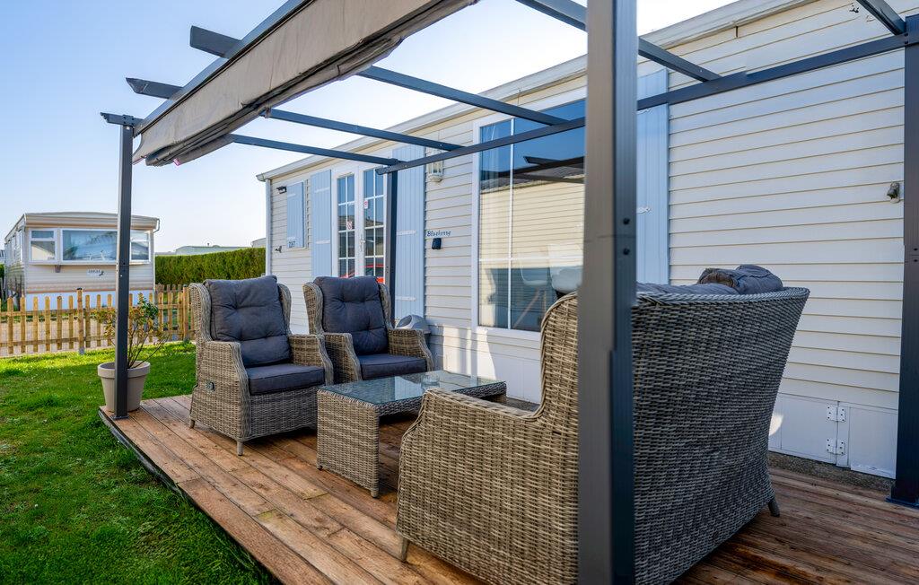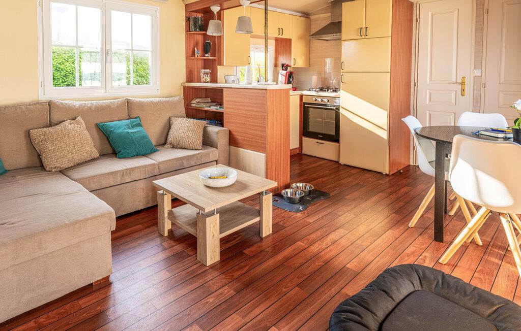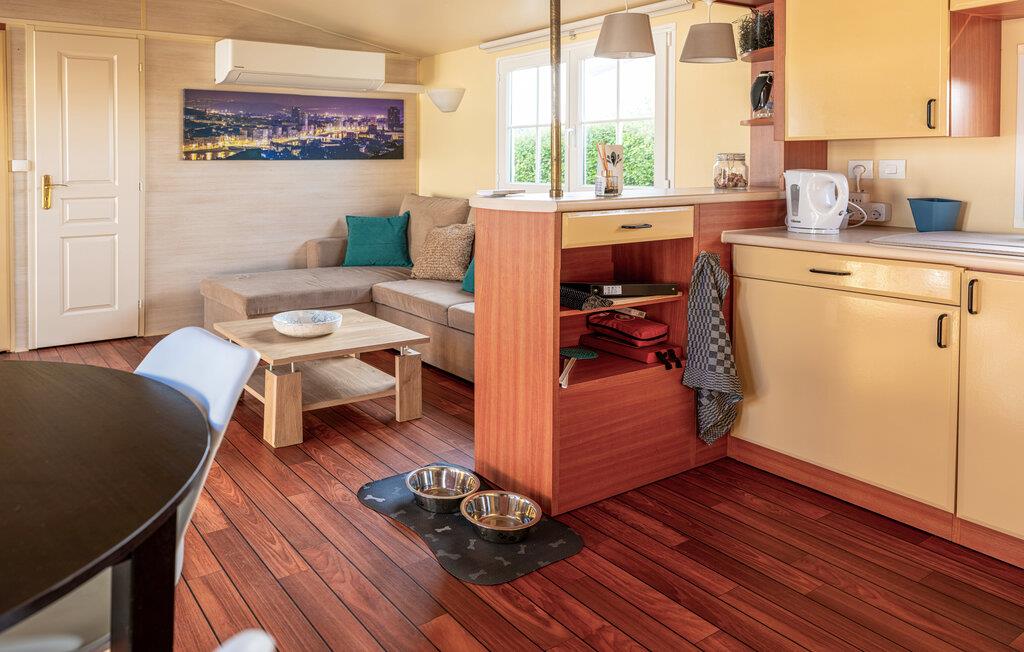 Dieses kompakte und praktisch eingerichtetes Ferienhaus enthält die wichtigsten Elemente für einen angenehmen Aufenthalt. Es befindet sich auf einem gepflegten Campingplatz mit einem großen Spielplatz und einem See zum Angeln in Gehweite. Starten Sie den Tag in der Küche und bereiten Sie das Familienfrühstück zu. Die gemütliche Sofaecke ist ideal für lustige Spielrunden oder entspannte Filmabende. Draußen können Sie auf der gemütlichen Terrasse fröhliche Abende in geselliger Runde verbringen oder bei einer Tasse Kaffee die freie Urlaubszeit genießen.