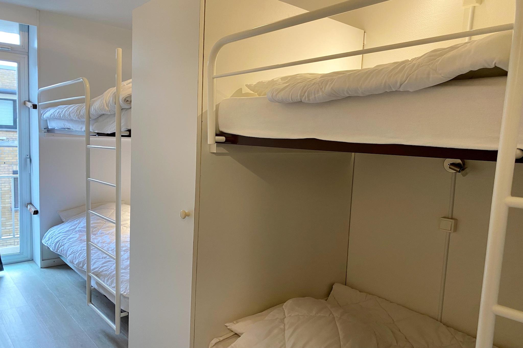 In der 5. Etage: (offene Küche(Kochplatte(elektrisch), Dunstabzugshaube, Kaffeemaschine, Kombi-Mikrowelle, Spülmaschine, Kühlschrank), Wohn/Esszimmer(TV(digital), Esstisch, Sitzecke, Balkon oder Terrasse), Schlafzimmer(Doppelbett(Doppelbettdecke, 140 x 200 cm)), Schlafzimmer(Etagenbett(Bettdecke), Etagenbett(Bettdecke)), Badezimmer(Dusche, Waschbecken), Toilette(Toilette), Abstellraum(Bügelbrett, Bügeleisen)) Souterrain: (Abstellraum) Aufzug