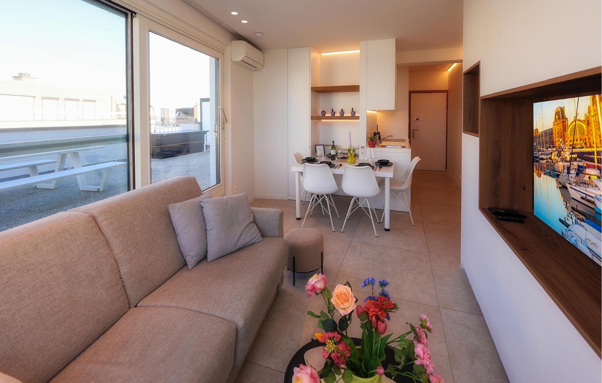 Diese gemütliche und traumhafte Ferienwohnung bietet Ihnen auf kompakten Raum einen hervorragenden Rahmen für Ihren Erholungsurlaub in Oostende. Die schöne Ferienwohnung wird durch eine umlaufende Dachterrasse erweitert, die Ihnen ein besonderes Erlebnis verschafft. Verbringen Sie die meiste Zeit an der frischen Luft, nehmen Sie Ihre Mahlzeit hier ein und entspannen sich auf den hochwertigen Terrassenmöbeln. Planen Sie mit Blick auf den Strand und das Meer Ihre Tagesaktivitäten.