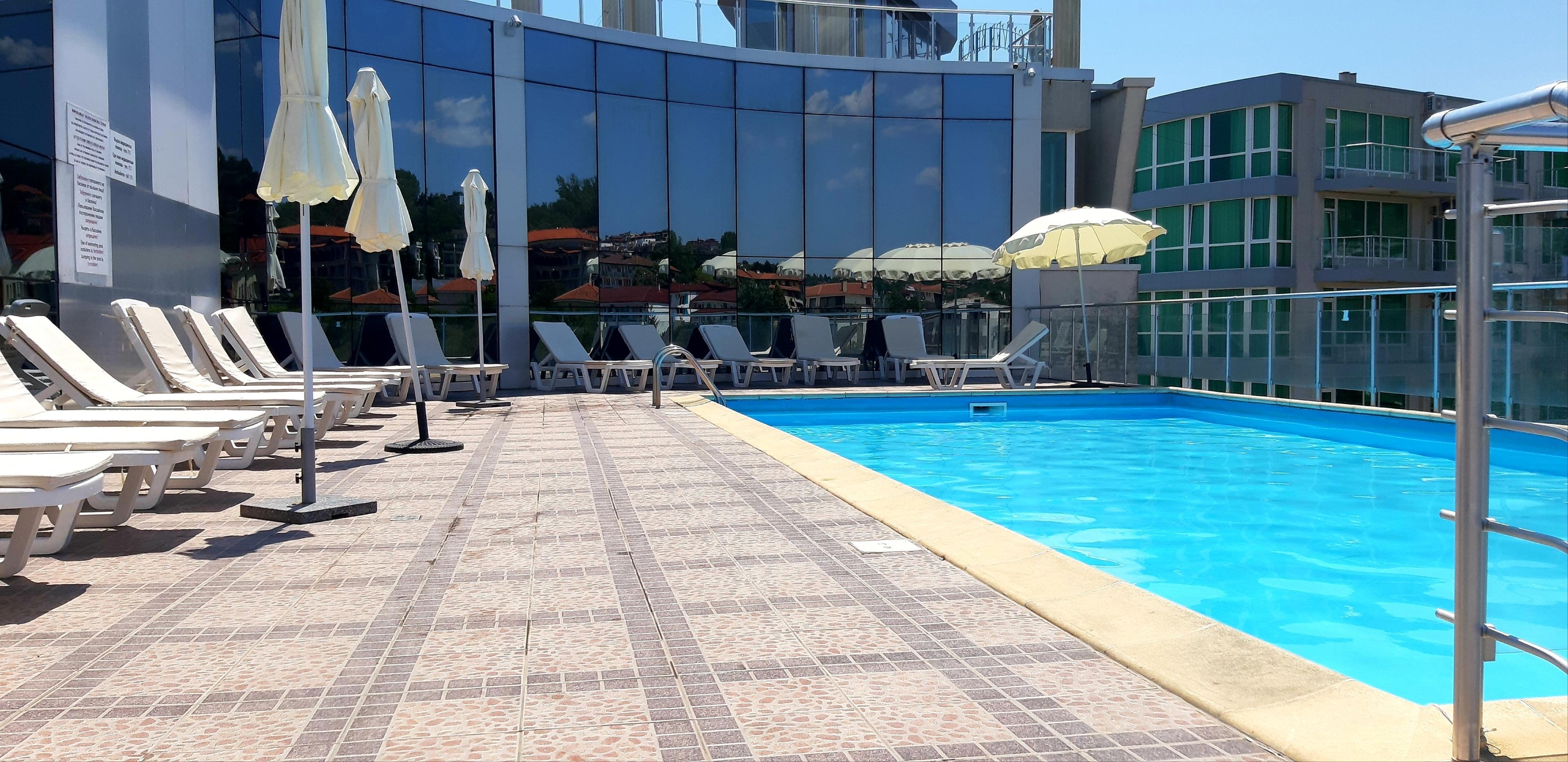2x Pool inkl. Liegen und Sonnenschirmen. Ein Pool