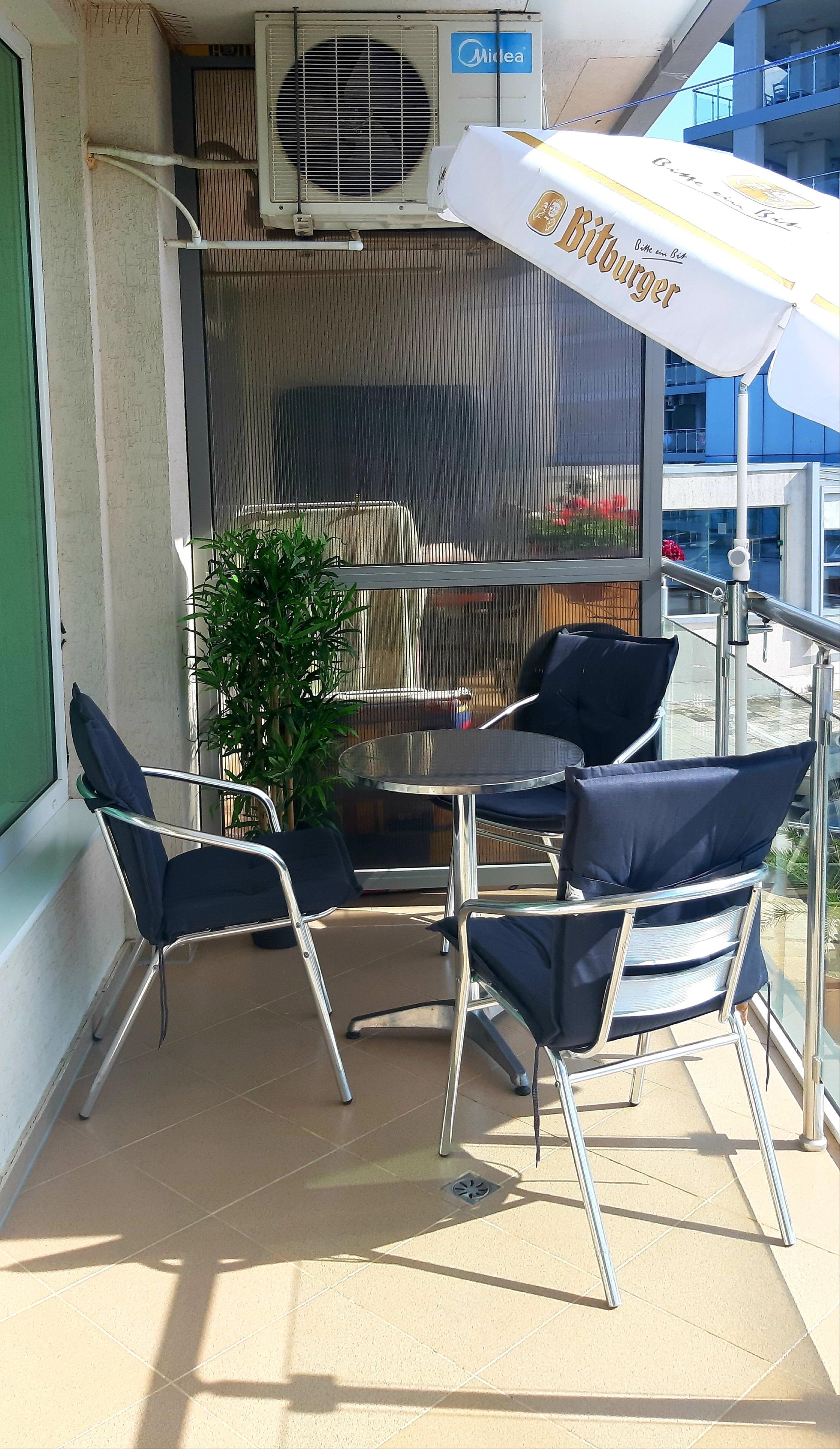 Einen Balkon inkl. Balkonmöbel. Bettwäsche und Handtücher.