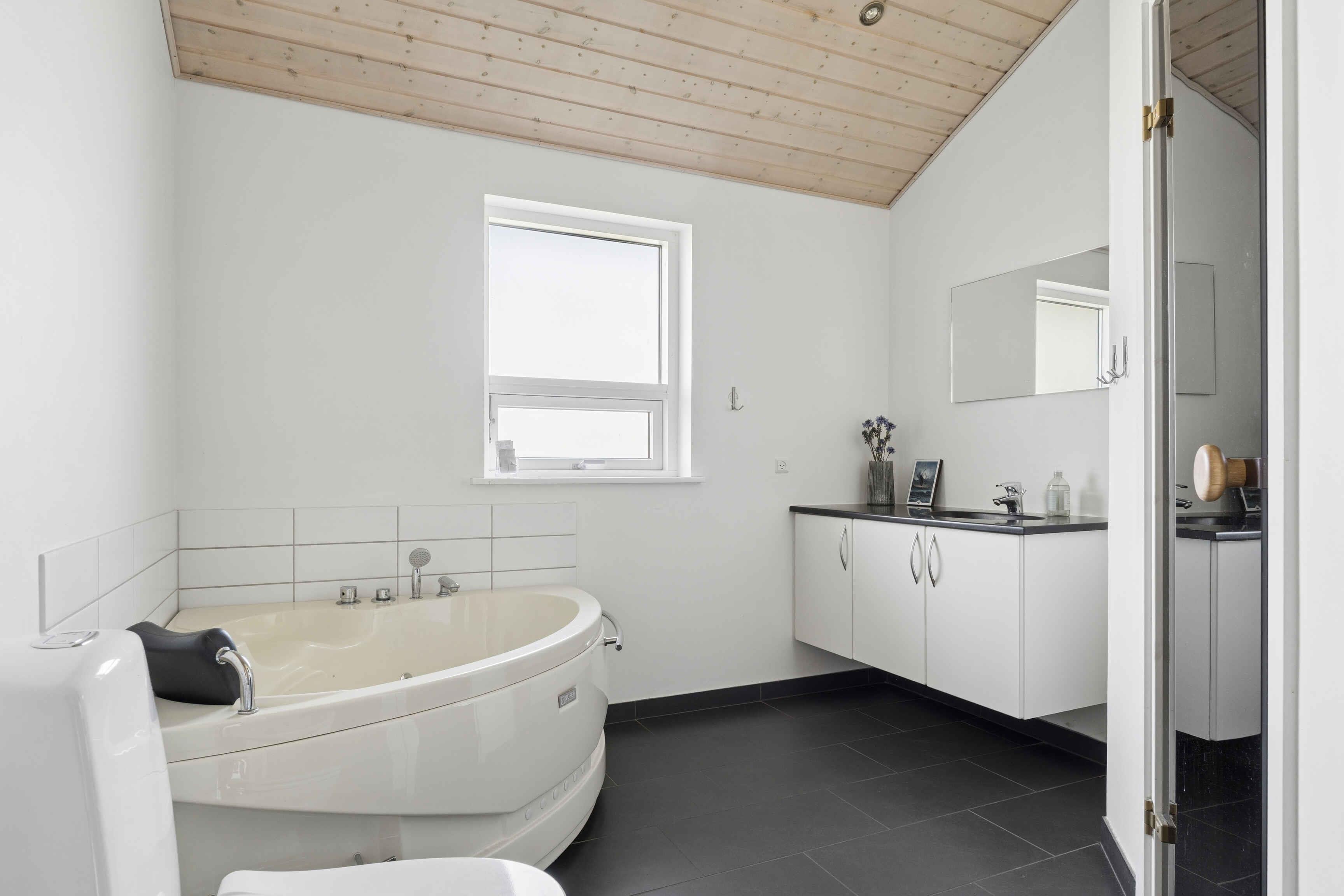 Modernes Ferienhaus mit Meerblick, Spa, Kaminofen und Platz für die ganze Familie in ruhiger Lage nahe Kiesstrand.