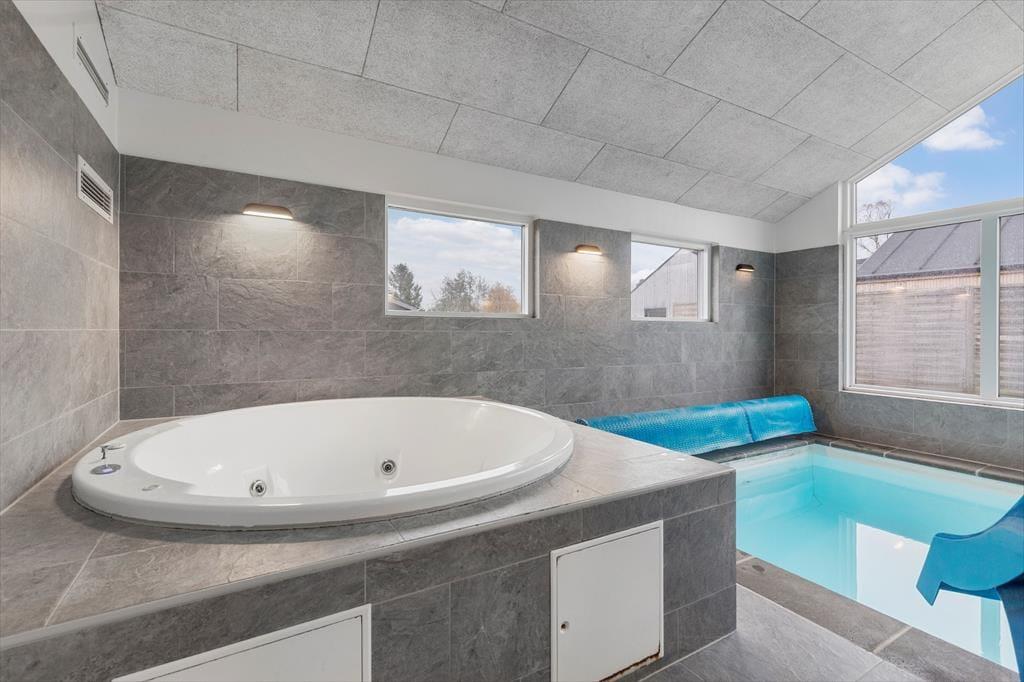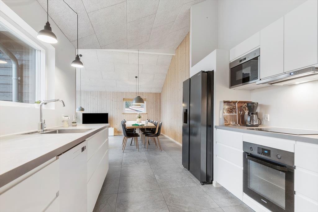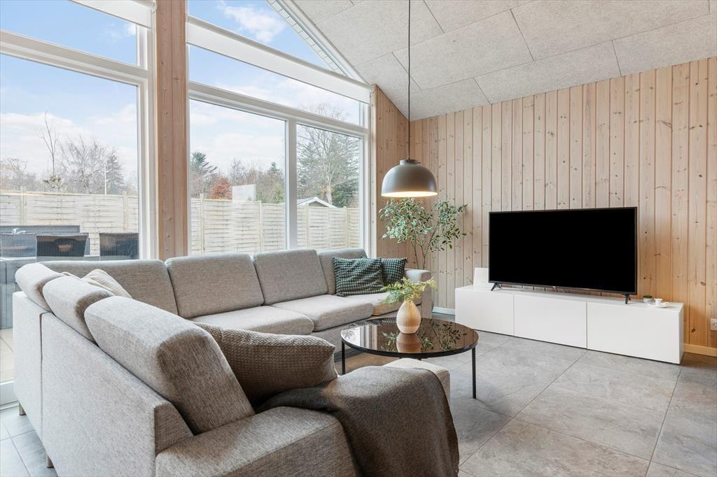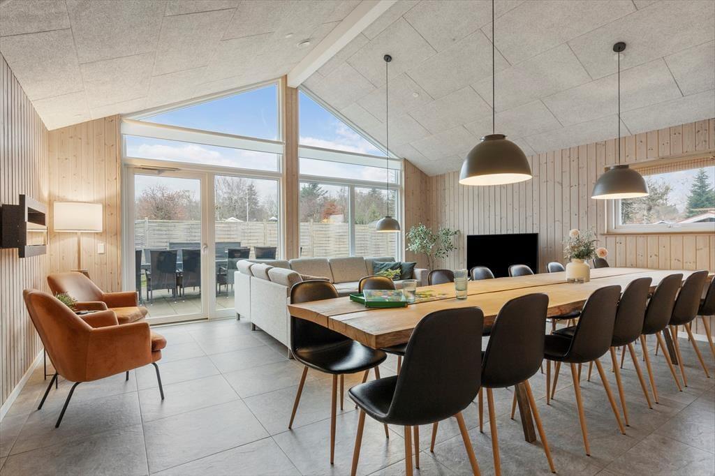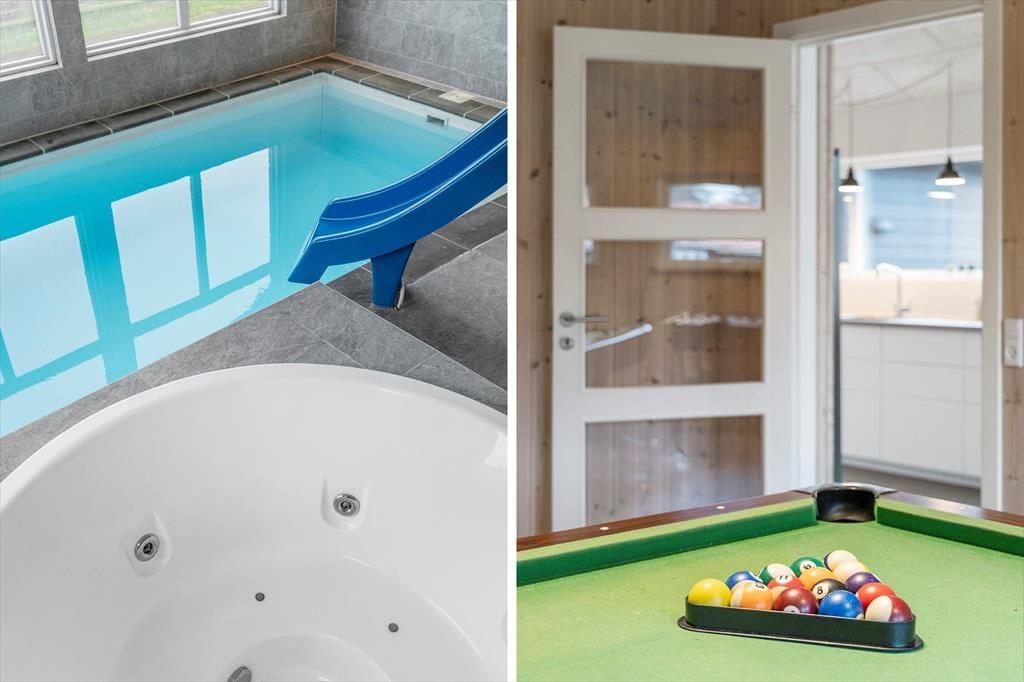 Stelle dir vor, wie dein Auto auf die Auffahrt rollt und die Vorfreude in dir wächst. Vor dir steht das schöne schwarze Holzhaus, erbaut im Jahr 2020. Modern und einladend bietet es die Basis für deinen Ferienhausurlaub: einen Ort, an dem Kinder, Erwachsene, Familie und Freunde entspannen, spielen und gemeinsame Zeit genießen können. Im Haus erwartet euch der wunderbare Wellnessbereich, der zu Spiel, Spaß und Schwimmzügen im glitzernden Wasser einlädt, während Sauna und Whirlpool euch das volle Spa-Programm schenken. Vom Pool gibt es einen direkten Zugang zu einem Bad mit WC, damit es einfach ist, wenn ihr nass und fröhlich aus dem Wasser kommt. Ein zusätzliches Badezimmer mit Wickeltisch, sowie Waschmaschine und Trockner sorgt für noch mehr Komfort. Die Küche ist liebevoll eingerichtet und gut ausgestattet, sodass das Kochen zu einem gemütlichen Teil eures Urlaubs wird. Am langen Esstisch kommt ihr zu leckeren Mahlzeiten, Brettspielen und viel fröhlicher Gemeinschaft zusammen, während das Wohnzimmer mit seiner weichen Sofagruppe und dem TV der perfekte Ort zum Entspannen nach den Erlebnissen des Tages ist. Von hier aus gelangt ihr auf die schöne Terrasse, auf der die Ferienstimmung richtig aufblüht. Wenn ihr entscheiden wollt, wer fürs Frühstück machen zuständig ist und euch der Wettbewerbsgeist packt, - wartet der Aktivitätsraum mit Billard, Tischfußball und Nintendo Switch - und fertig los! Am Abend verteilt ihr euch auf fünf schöne Schlafzimmer, von denen zwei jeweils mit einem Doppelbett ausgestattet sind, zwei mit je zwei Einzelbetten und das letzte Zimmer mit zwei Etagenbetten bietet Platz für bis zu vier Kinder. Auf dem Hems, einem sogenannten "Schlafboden" findet ihr nochmals vier nebeneinander liegende Matratzen, perfekt für größere Kinder oder zusätzliche Gäste. Alles in allem ist dies ein Ferienhaus, in dem das Urlaubsgefühl ganz von selbst entsteht – ein Ort voller Gemütlichkeit, Nähe und kleiner Sternstunden, die ihr lange nach eurer Heimreise mit euch tragt.