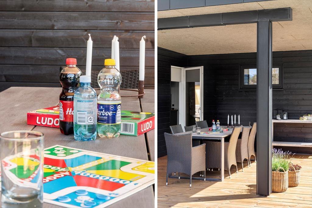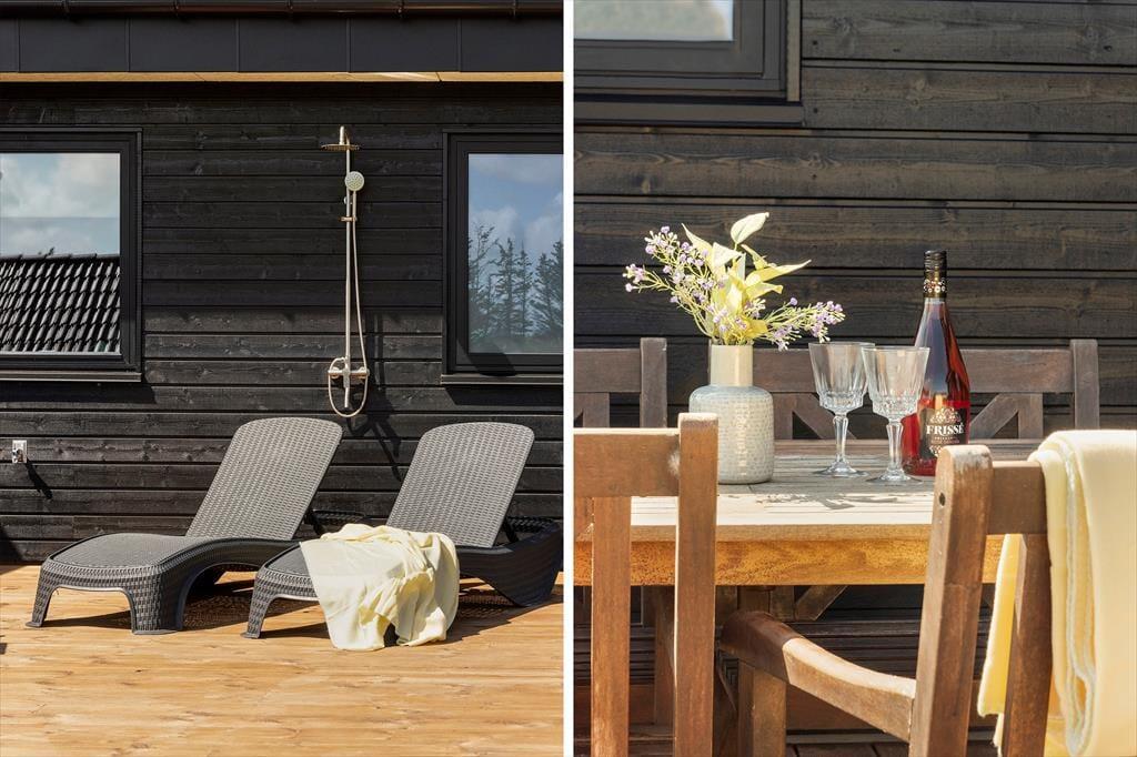 Wenn die Sonne scheint und das Wetter einlädt, lockt die große Terrasse, die sich fast um das gesamte Ferienhaus zieht. Hier findest du den ganzen Tag über sowohl Sonne als auch windgeschützte Ecken – ganz gleich, ob du dein Frühstück im Freien genießen, in einem Liegestuhl entspannen oder einen Grillabend unter dem Sternenhimmel verbringen möchtest. Die große Rasenfläche bietet reichlich Platz für Ballspiele, Wikingerschach oder einfach für entspannte Stunden in der Natur. Kinder und Vierbeiner werden das großzügige Gelände lieben.
