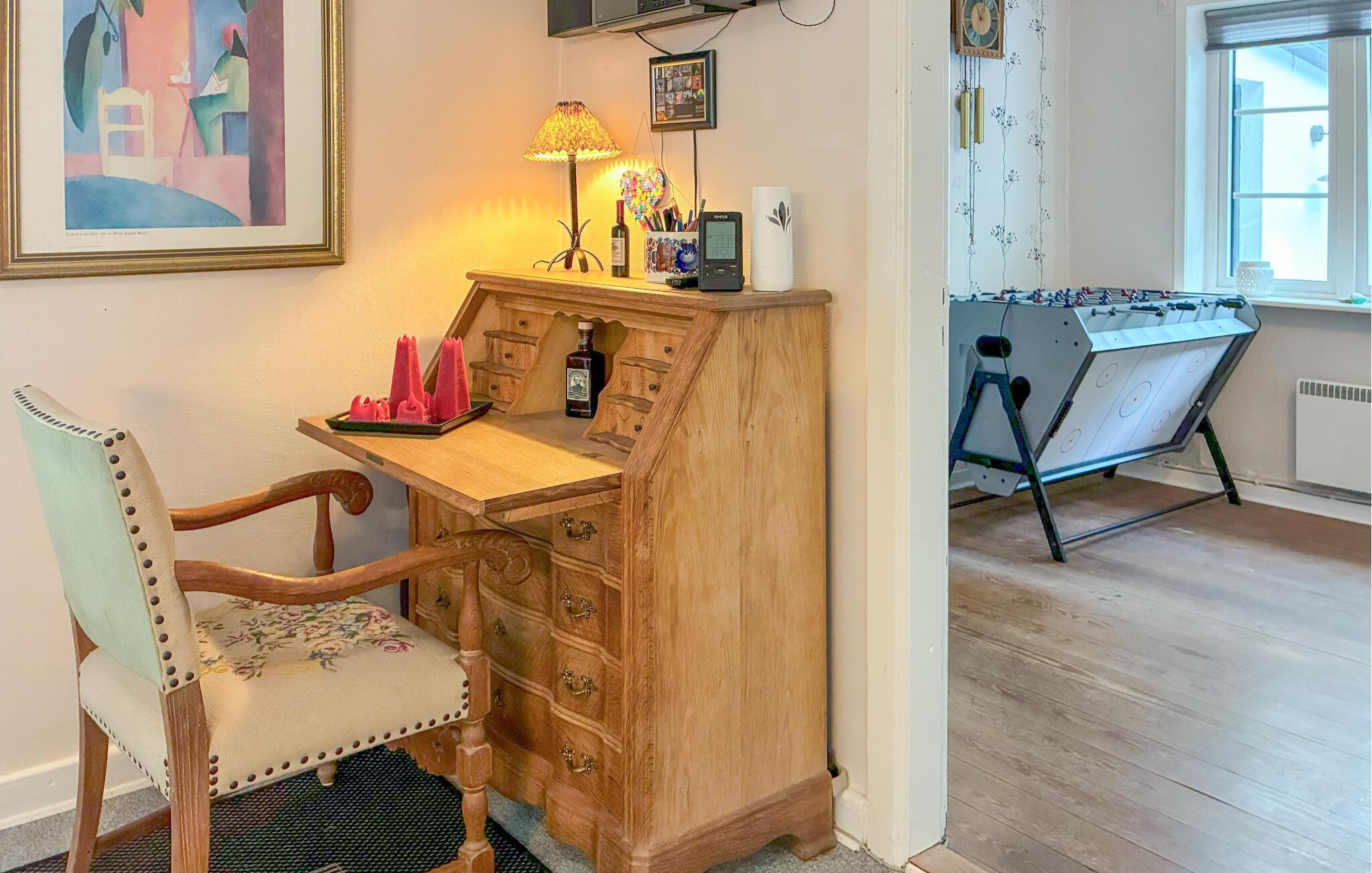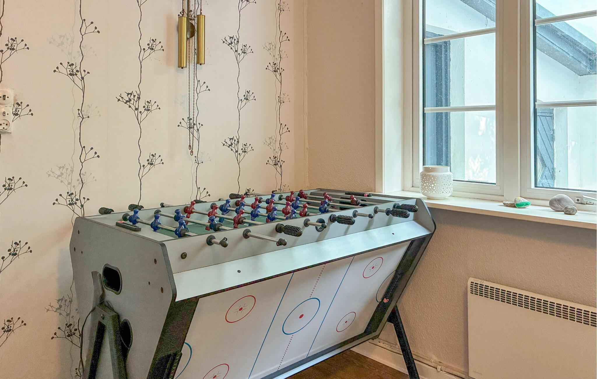 Hier finden Sie Ruhe und zahlreiche Möglichkeiten, um Ihre Urlaubstage abwechslungsreich zu gestalten. Machen Sie es sich im gemütlichen Wohnzimmer vor dem Kaminofen bequem. Entspannen Sie in den bequemen Sesseln oder auf dem Sofa und genießen Sie gemeinsame Stunden bei einem guten Film. Nutzen Sie den Essbereich für ausgedehnte Mahlzeiten mit der Familie oder Freunden und bereiten Sie Ihre Speisen in der praktischen Küche zu, die mit verschiedenen Geräten ausgestattet ist. Entdecken Sie auch den Aktivitätsbereich mit Tischkicker und Spielen, der besonders Kindern viel Freude bereitet.