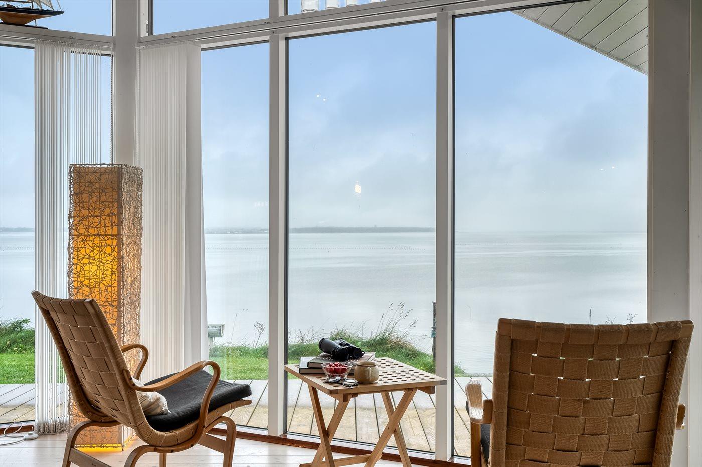 Dieses moderne Ferienhaus in Roslev bietet Panoramablick auf den Limfjord und direkten Zugang zum Wasser.