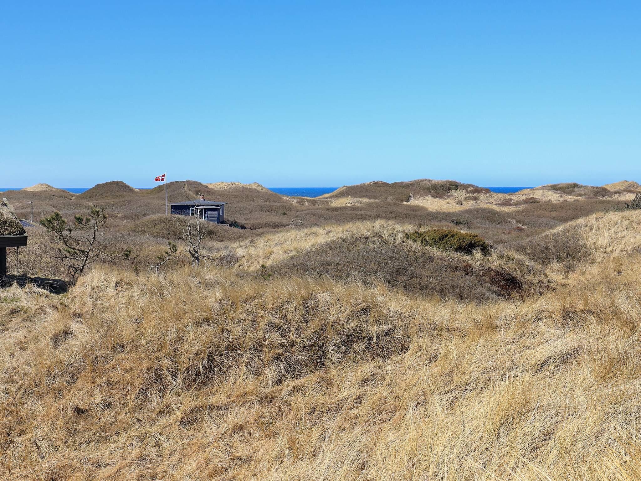 In erhöhter Lage findet man dieses Ferienhaus mit Panoramaaussicht zu Dünenlandschaft und Meer von Wohnzimmer und Terrasse. Vom sehr hügeligen Dünengrundstück führt ein kl. Trampelpfad direkt hinunter an den herrlichen Nordseestrand. Das Haus wurde im dänischen Stil eingerichtet, mit Wohnküche, drei Schlafzimmern und einem Bad. Darüber hinaus gibt es vier Terrassen; je eine nach Osten, Süden, Westen und Norden.