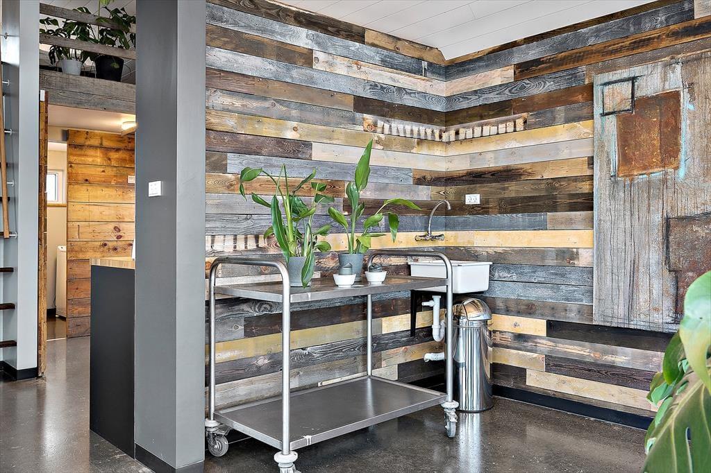 Die Akzentwand des Ateliers wurde mit wiederverwendeten Verpackungshölzern aus der Werft im Hafen versehen. Auch die Schiebetüren wurden aus gebrauchten Palettenrahmen zusammengetischlert. Selbst für die Fensterbänke, die Bank, die Treppenstufen und die Regale wurde recyceltes Holz verwendet.