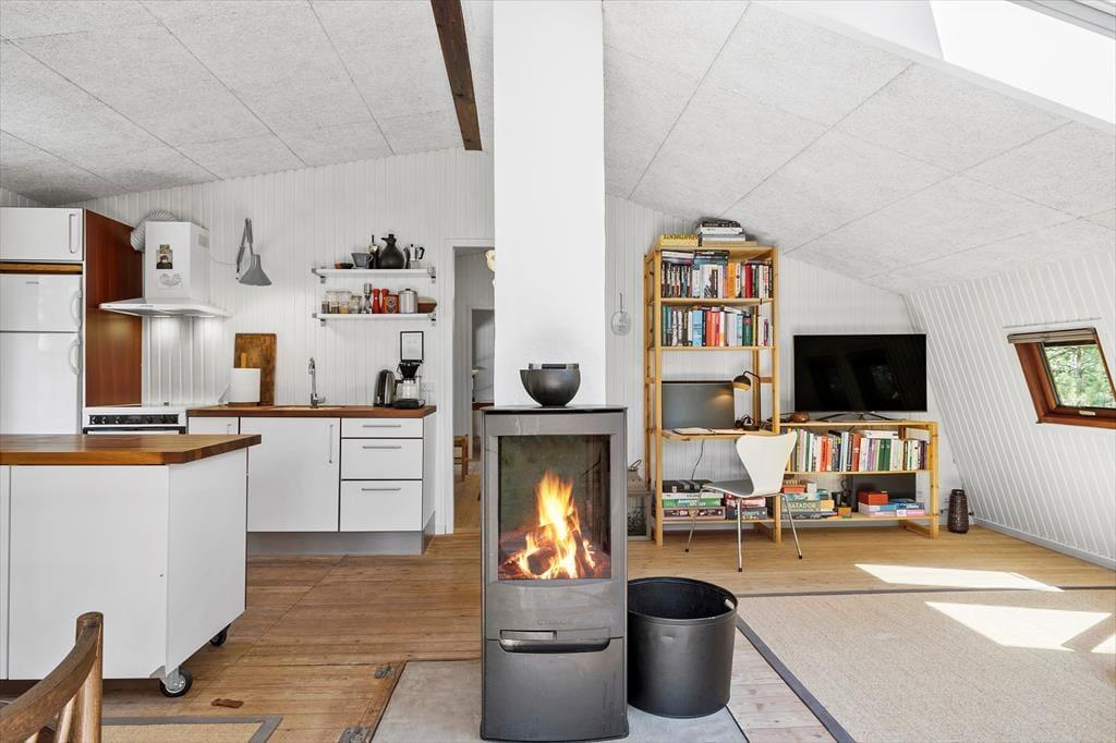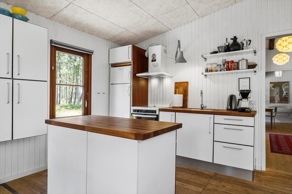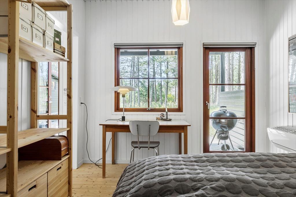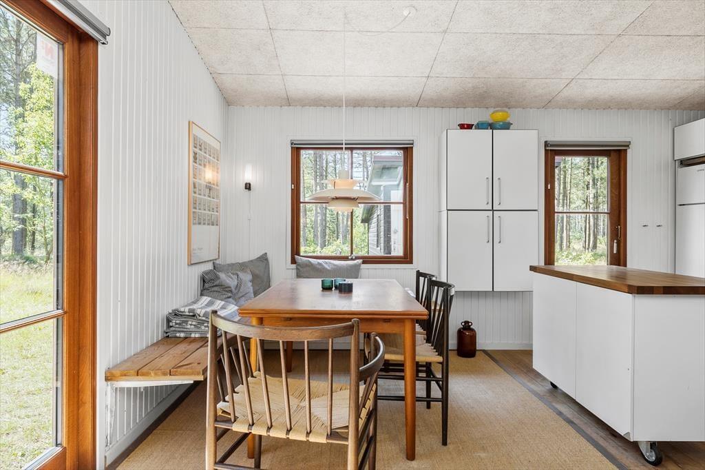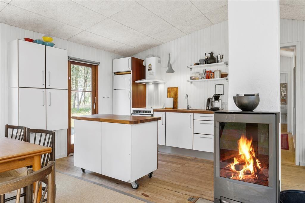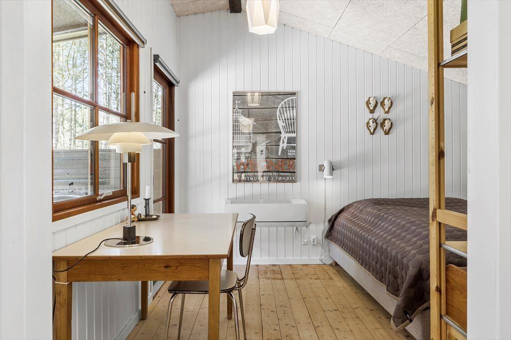 Das schwarz gestrichene Holzhaus steht seit 1961 mitten in der Natur und wurde 2017 erfolgreich modernisiert, sodass es innen hell und einladend ist, während die Räume eine klassische Sommerhausgemütlichkeit ausstrahlen. Selbst wenn du drinnen entspannst, hast du guten Kontakt zur Natur, denn durch die Fenster kannst du auf die hohen Bäume des Grundstücks blicken – und vielleicht siehst du sogar ein Reh oder anderes Wild, das vorsichtig vorbeitrippelt, während du deinen Morgenkaffee am Esstisch genießt. Im Wohnzimmer sorgen Dachfenster dafür, dass viel Sonne hereinkommt, und der Kaminofen trägt zu einer warmen und gemütlichen Atmosphäre bei, während die offene Küche dir einen funktionalen Rahmen für die Essenszubereitung bietet. Ein Duschbad und zwei schöne Schlafzimmer befinden sich ebenfalls im Ferienhaus, und wenn du und deine Lieben mehr Platz benötigen, gibt es ein zusätzliches Schlafzimmer mit Einzelbett und eine Gästetoilette im Nebengebäude.