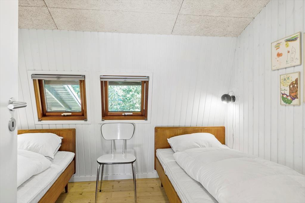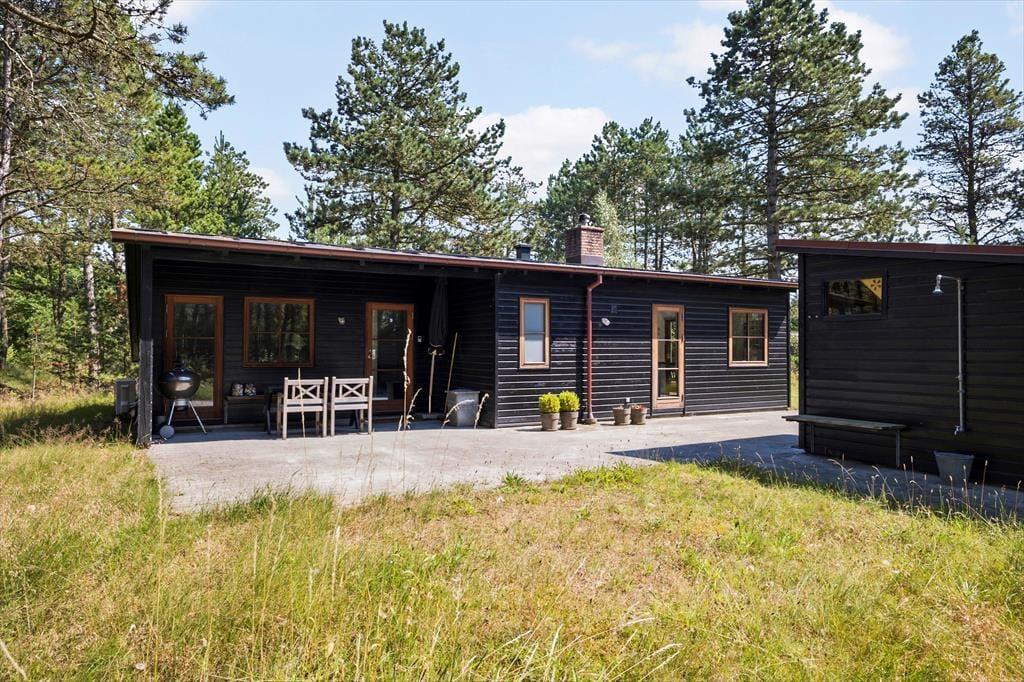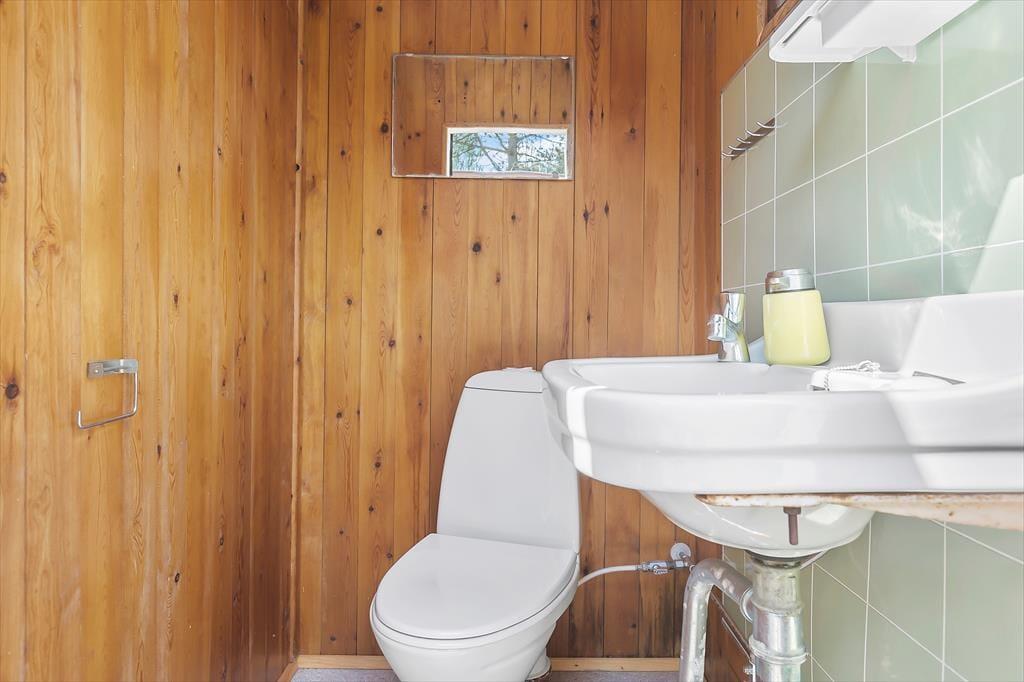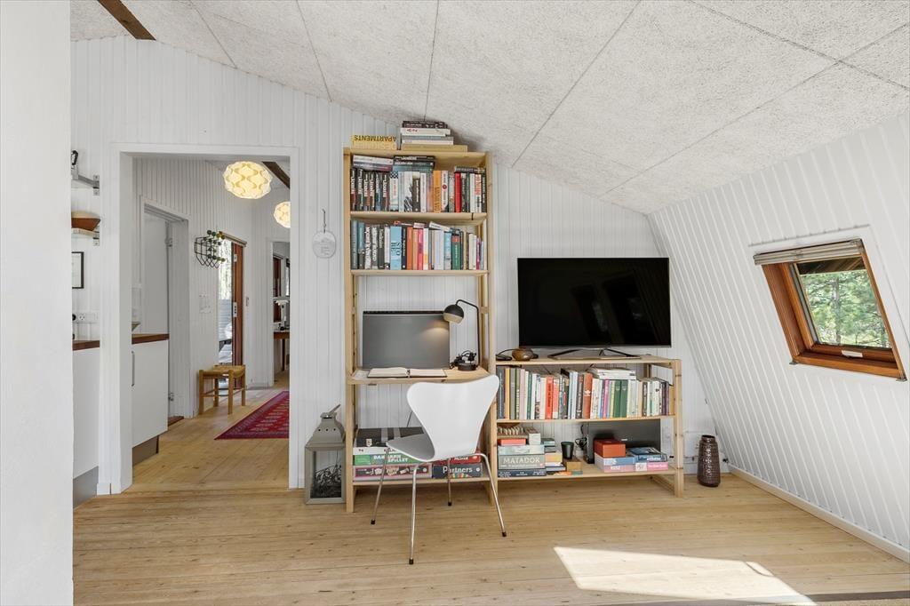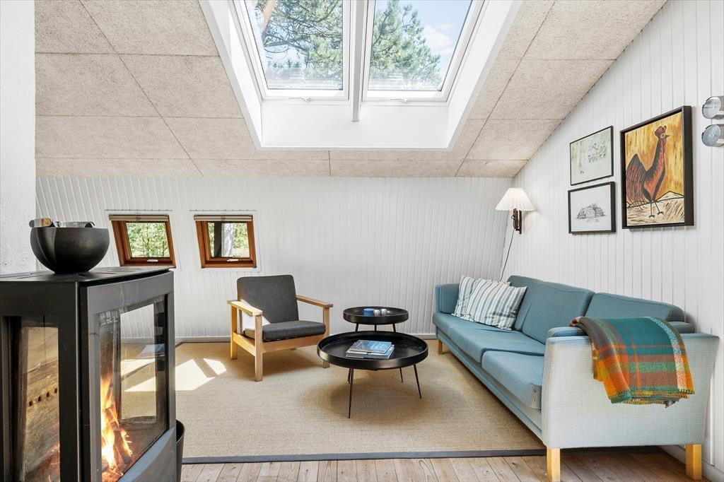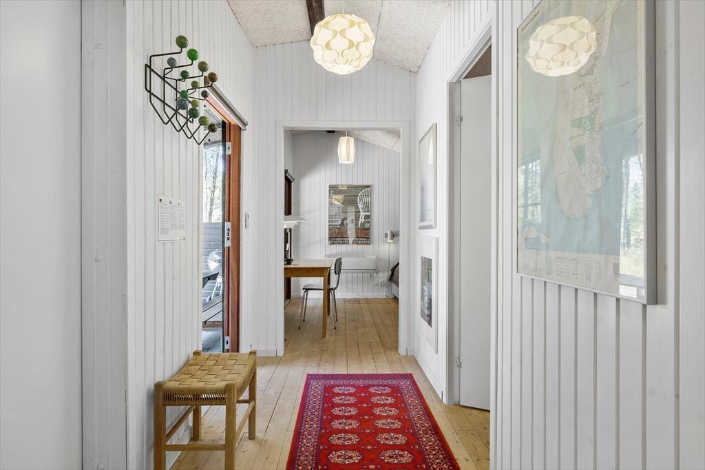 Das schwarz gestrichene Holzhaus steht seit 1961 mitten in der Natur und wurde 2017 erfolgreich modernisiert, sodass es innen hell und einladend ist, während die Räume eine klassische Sommerhausgemütlichkeit ausstrahlen. Selbst wenn du drinnen entspannst, hast du guten Kontakt zur Natur, denn durch die Fenster kannst du auf die hohen Bäume des Grundstücks blicken – und vielleicht siehst du sogar ein Reh oder anderes Wild, das vorsichtig vorbeitrippelt, während du deinen Morgenkaffee am Esstisch genießt. Im Wohnzimmer sorgen Dachfenster dafür, dass viel Sonne hereinkommt, und der Kaminofen trägt zu einer warmen und gemütlichen Atmosphäre bei, während die offene Küche dir einen funktionalen Rahmen für die Essenszubereitung bietet. Ein Duschbad und zwei schöne Schlafzimmer befinden sich ebenfalls im Ferienhaus, und wenn du und deine Lieben mehr Platz benötigen, gibt es ein zusätzliches Schlafzimmer mit Einzelbett und eine Gästetoilette im Nebengebäude.