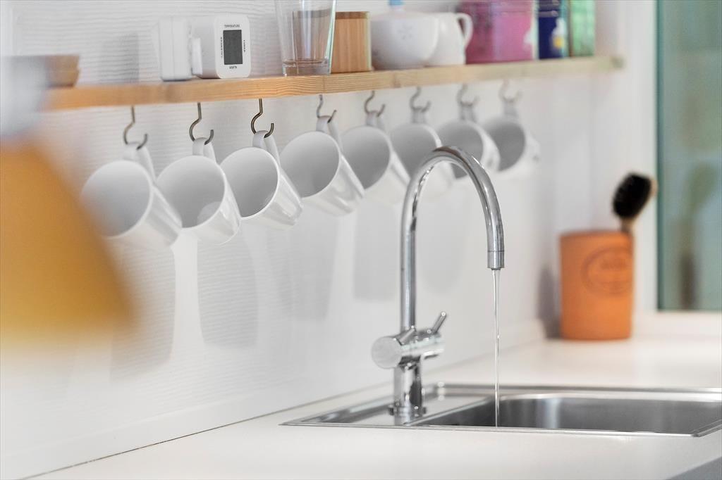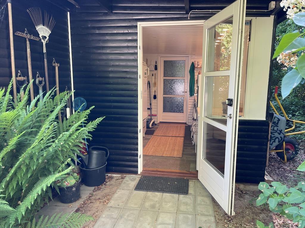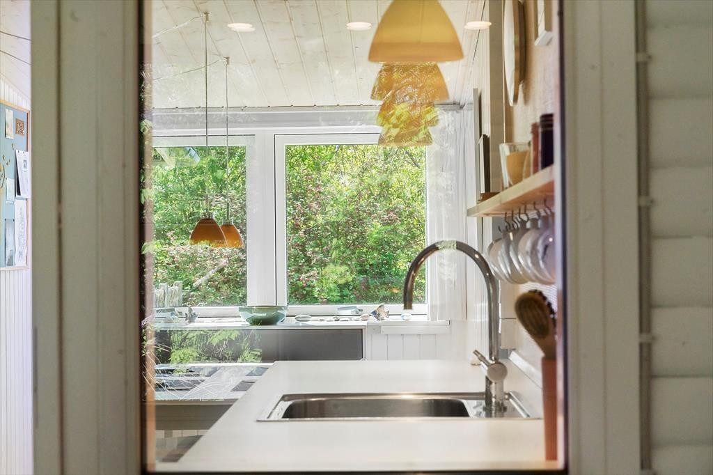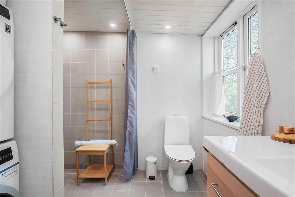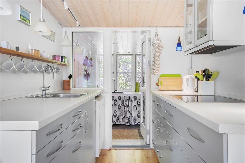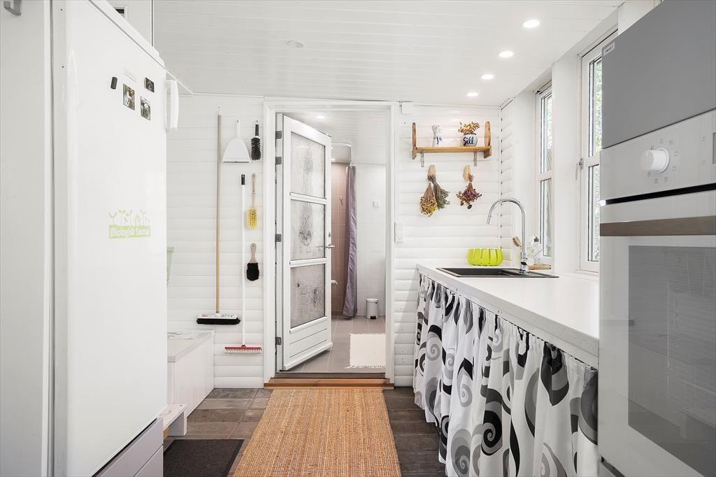 Vom Wohnraum aus gelangen Sie in die Küche. Diese ist recht eng, dafür aber gemütlich und funktionell eingerichtet. In Verlängerung der Küche treffen Sie auf einen schönen Essplatz am Fenster mit Blick in den grünen Garten. Ein paar Stufen führen von der Küche hinab in einen praktischen Hauswirtschaftsbereich mit Aufbewahrungsmöglichkeiten. Der Hauwirtschaftsbereich bietet Ihnen zusätzlichen Platz für die Zubereitung Ihrer Mahlzeiten und verfügt über einen Kühlschrank und einen Backofen. An den Hauswirtschaftsbereich schließt das neue Badezimmer, das einladend und geräumig ist. Es beinhaltet helle Fiesen, eine Fußbodenheizung, eine große Duschnische, eine Waschmaschine und einen Wäschetrockner. Vom Hauswirtschaftsbereich aus gelangen Sie zudem in den Garten, in dem eine Außendusche auf Sie wartet.
