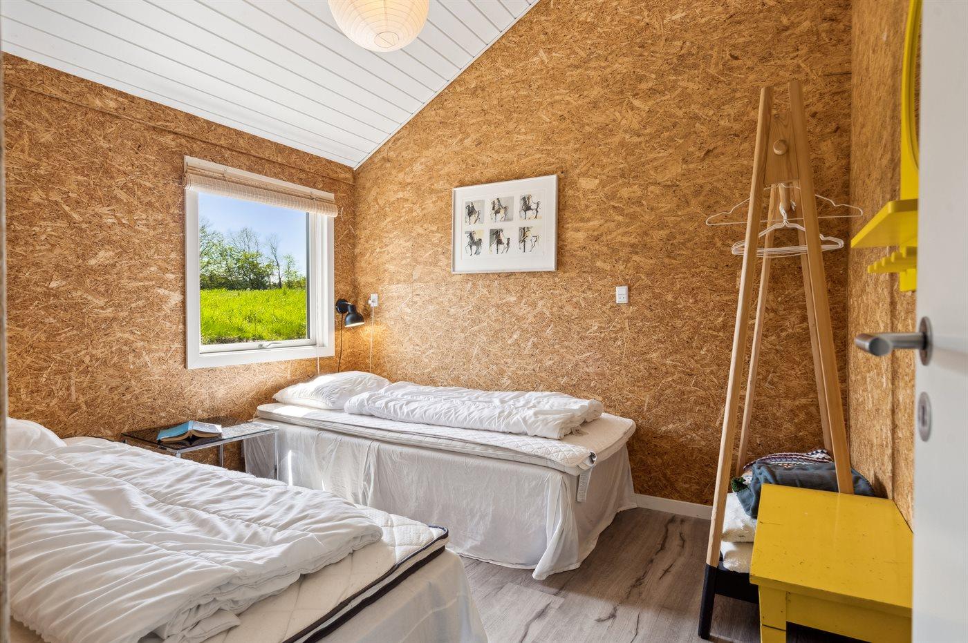 Die Schlafplätze verteilen sich auf 3 Schlafräume. 4 Schlafplätze in Doppelbetten. 2 Schlafplätze in Einzelbetten. 1 Schlafplatz auf einer Matratze. 1 von diesen Schlafplätzen befindet sich im offenen Obergeschoss.