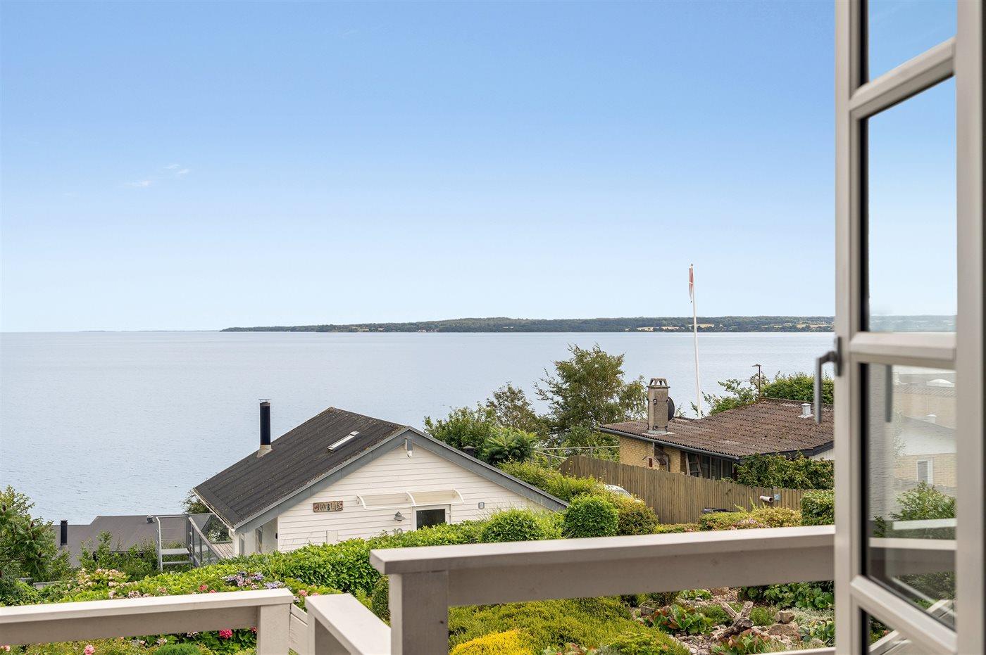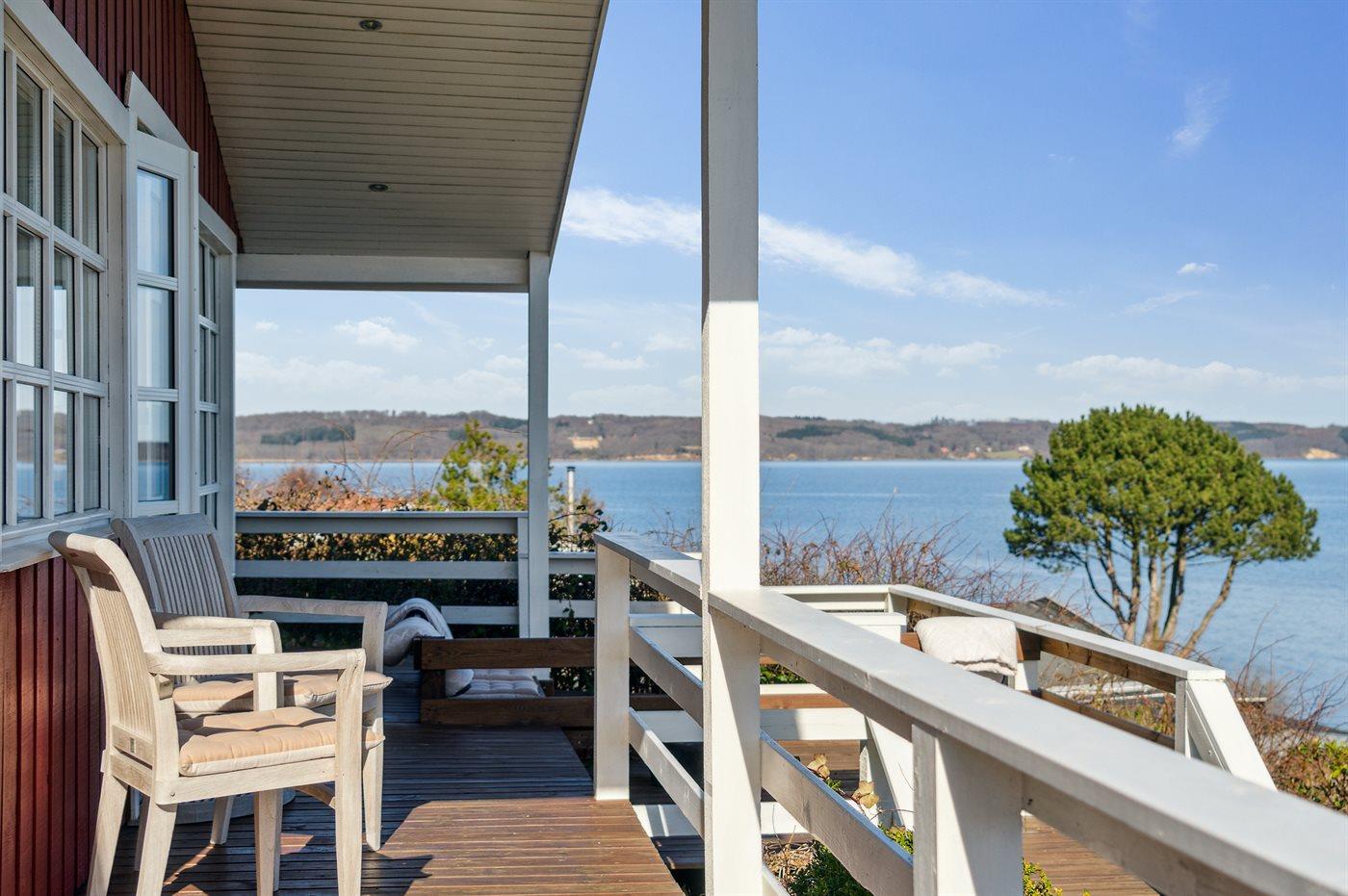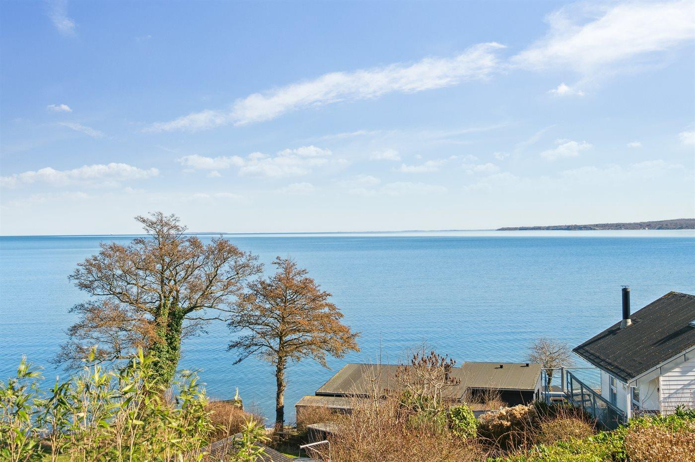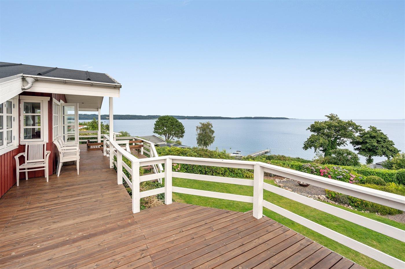 Charmantes Ferienhaus mit Panoramablick auf den Vejle Fjord, nur 50 Meter vom Wasser entfernt, mit Terrasse und moderner Ausstattung.