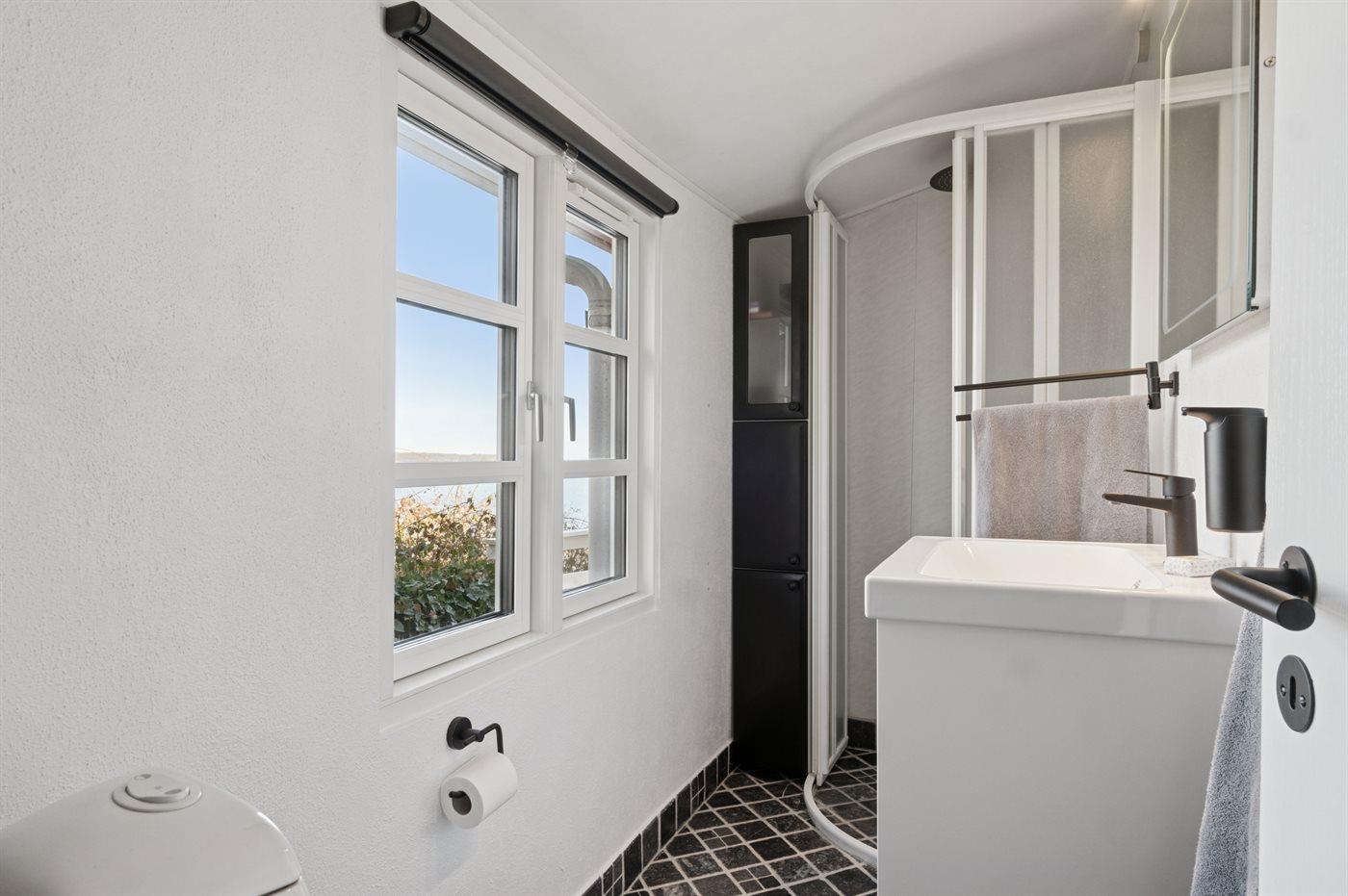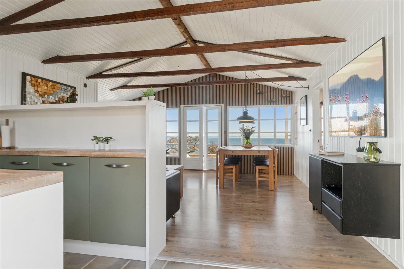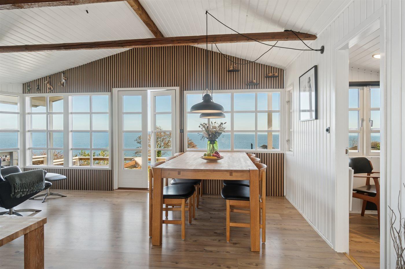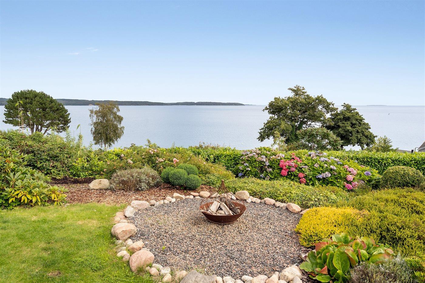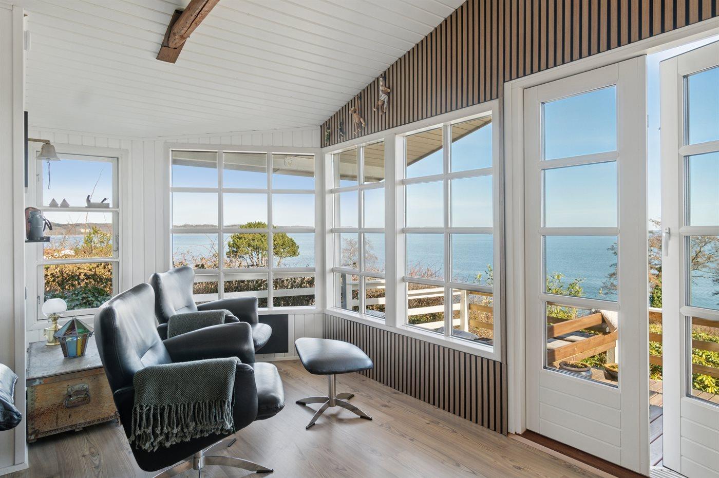 Charmantes Ferienhaus mit Panoramablick auf den Vejle Fjord, nur 50 Meter vom Wasser entfernt, mit Terrasse und moderner Ausstattung.