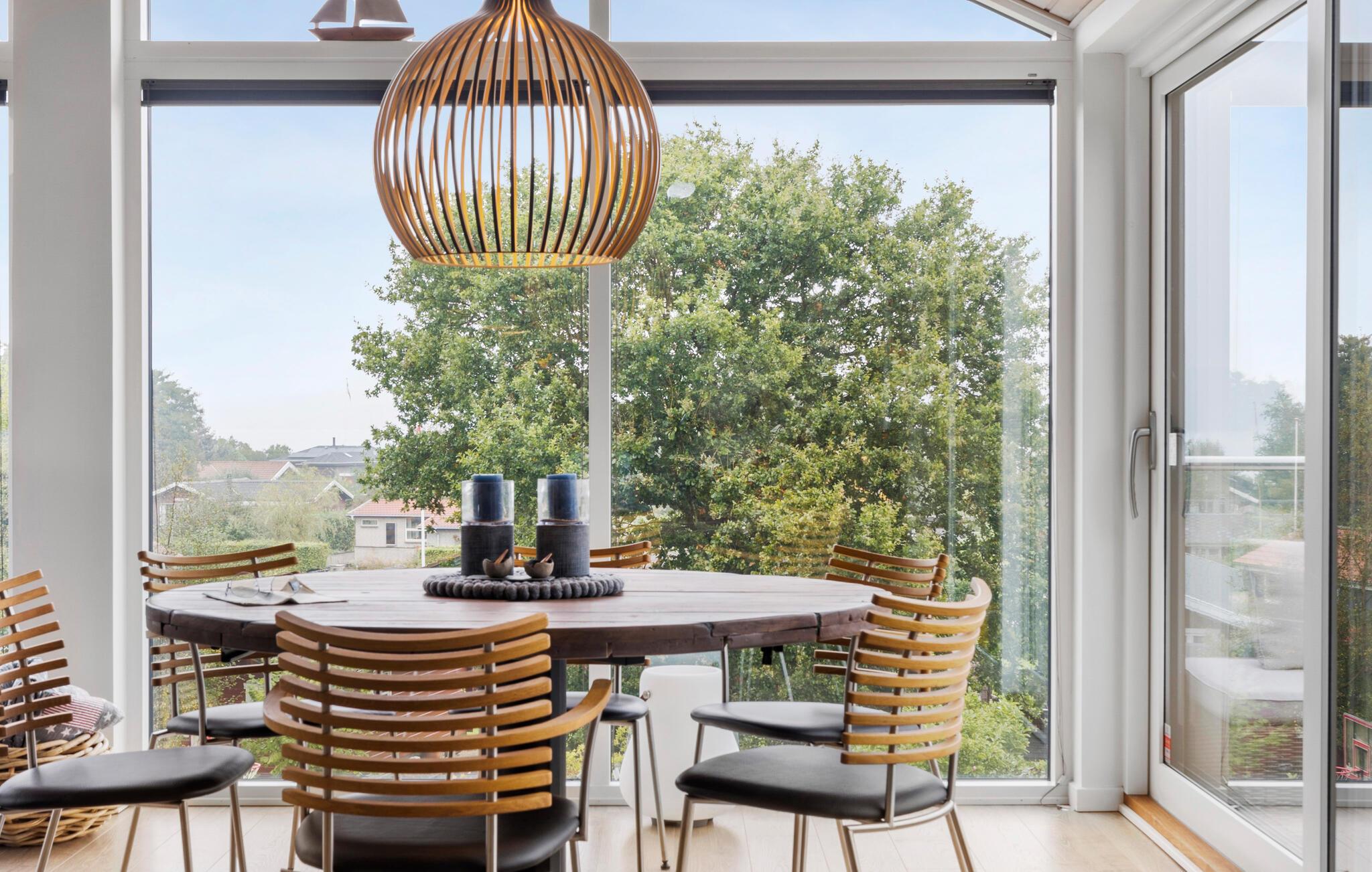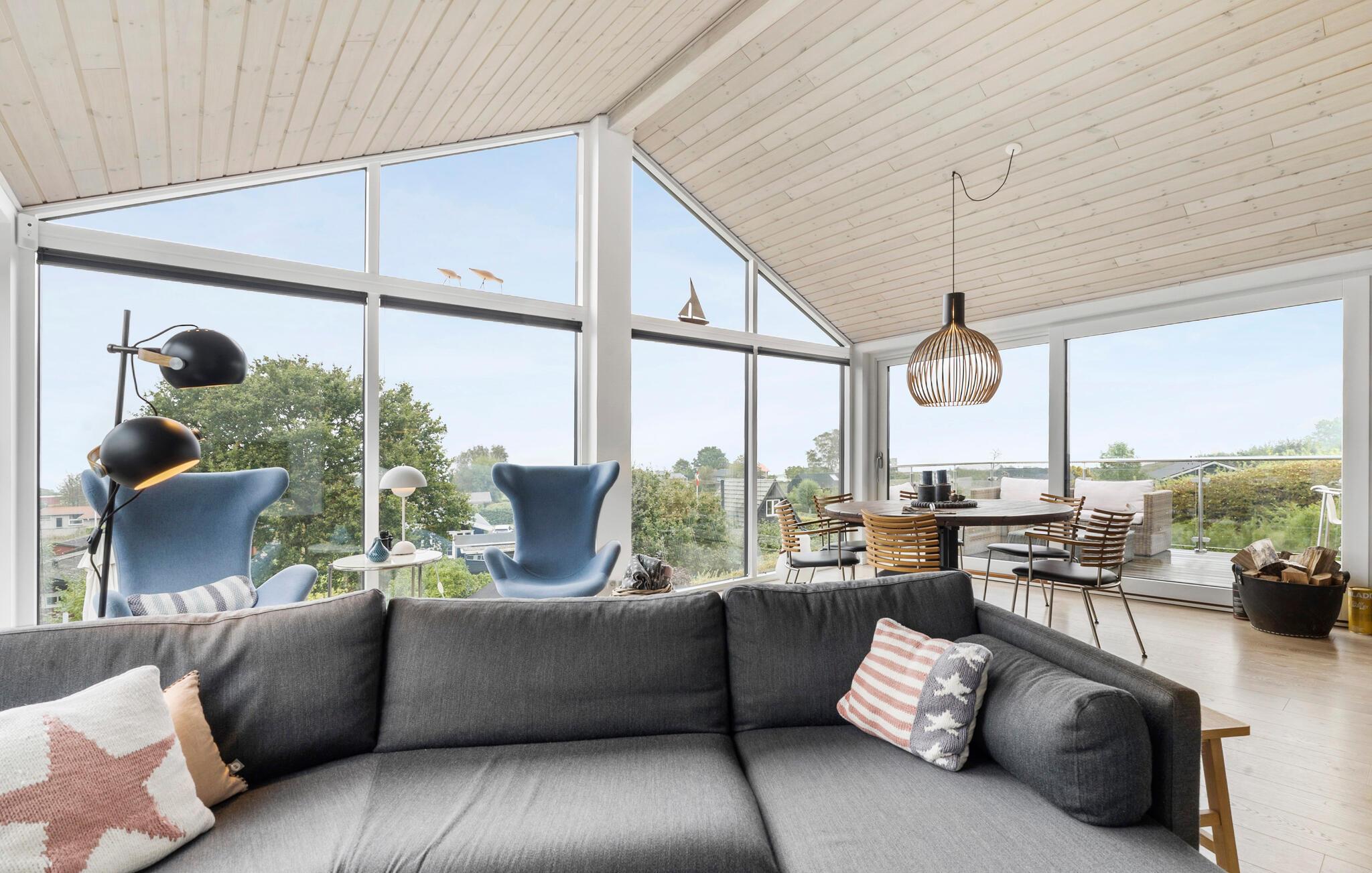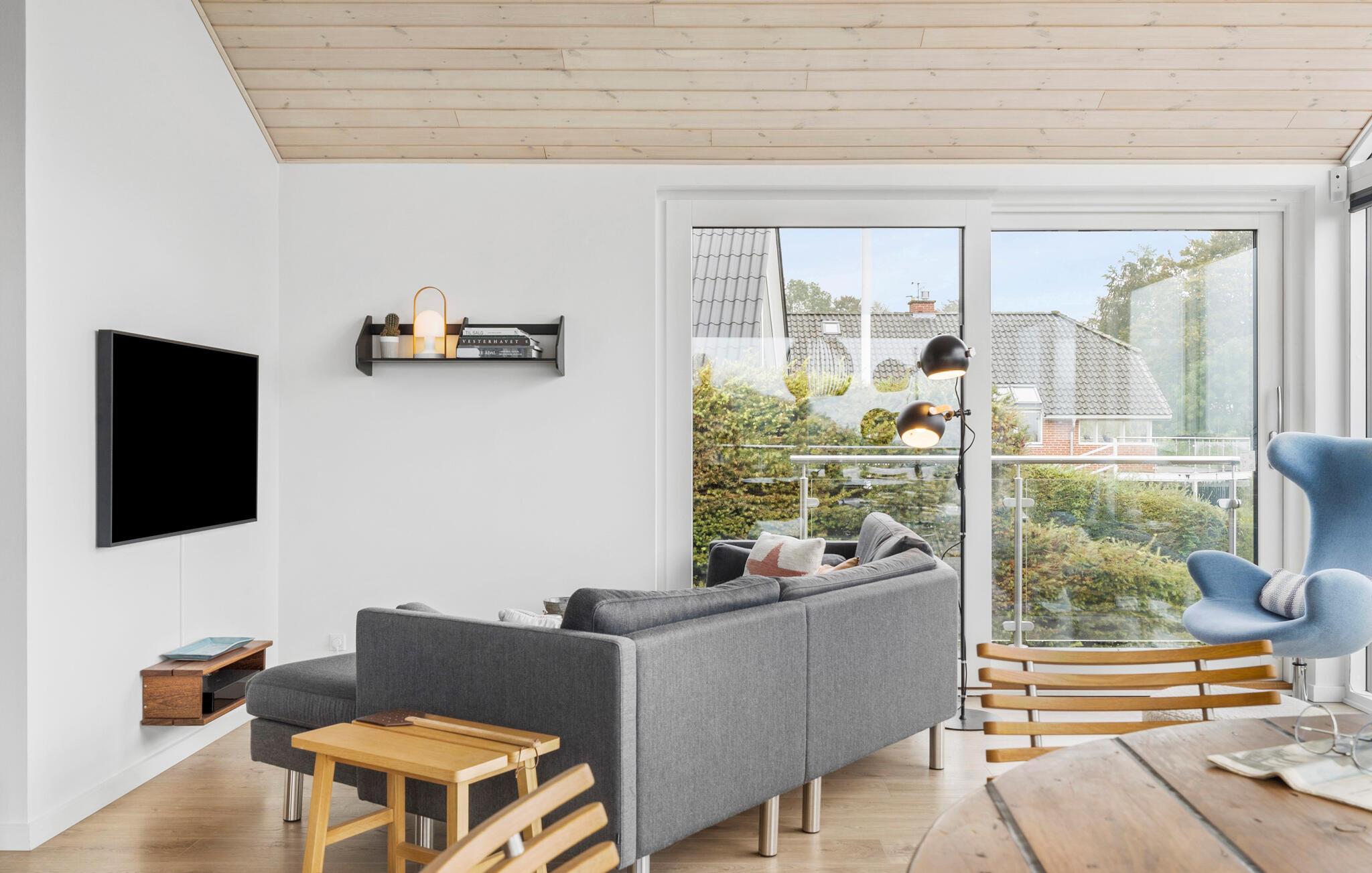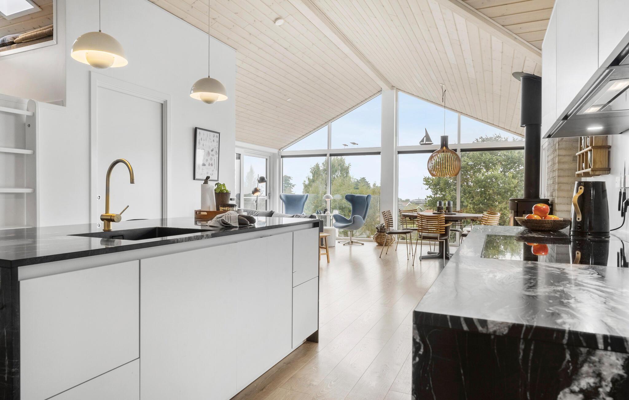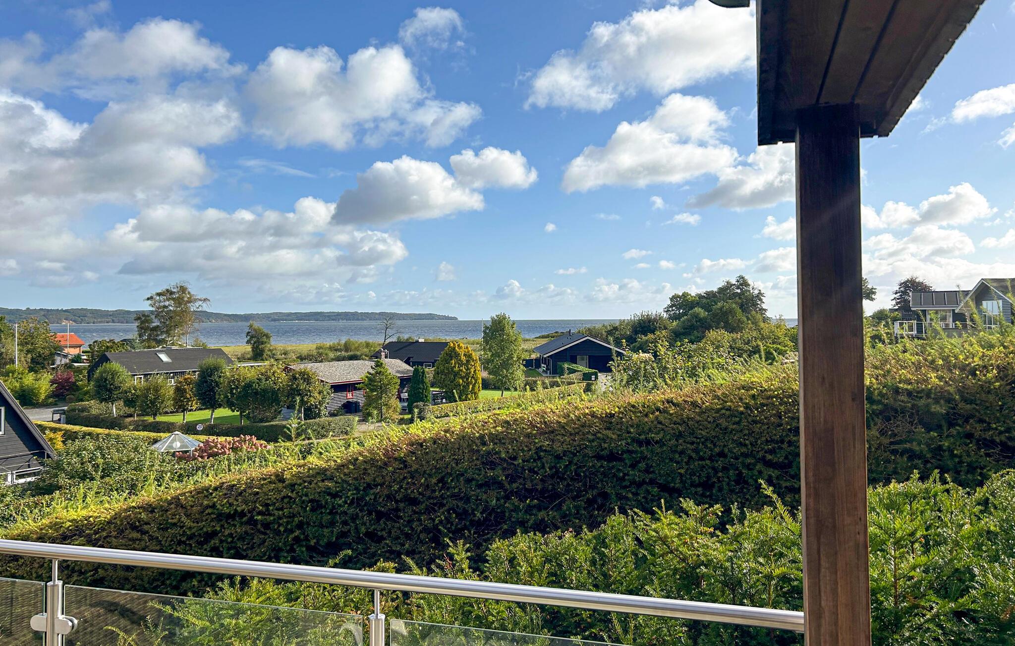 Modernes Ferienhaus mit Fjordblick, Kaminofen und großem Garten in Mørkholt, Dänemark.