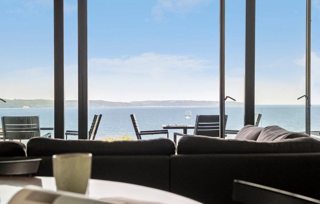 Vom Ferienhaus und der Terrasse mit dem Palju können Sie die Aussicht auf das Meer genießen. Dieses Ferienhaus ist exklusiv, sowohl in den verwendeten Materialien und in der Art der Ausstattung. Modern und stilsicher eingerichetet bietet es einen speziellen Rahmen für die Sommerhaushygge. Auf der obersten Etage gibt es zwei Schlafzimmer und eine Gästetoilette mit Waschmecken sowie ein Wohnzimmer Panroramablick auf die Einfahrt der Boote in den Vejle Fjord. Die Küche ist elegant und gut ausgestattet. Im Parterre, das Sie über eine steile Treppe mit Geländer erreichen,liegt das dritte Schlafzimmer, mit Platz für ein Kiderbaett, ein großes Badezimmer mit Doppeldusche, Massagewanne und Waschmaschine. Hier liegt auch ein Wohnraum mit Sitzkissen vor den TV. Die Terrasse zeigt nach Westen. Das Palju steht alleine auf einer weiteren Terrasse.