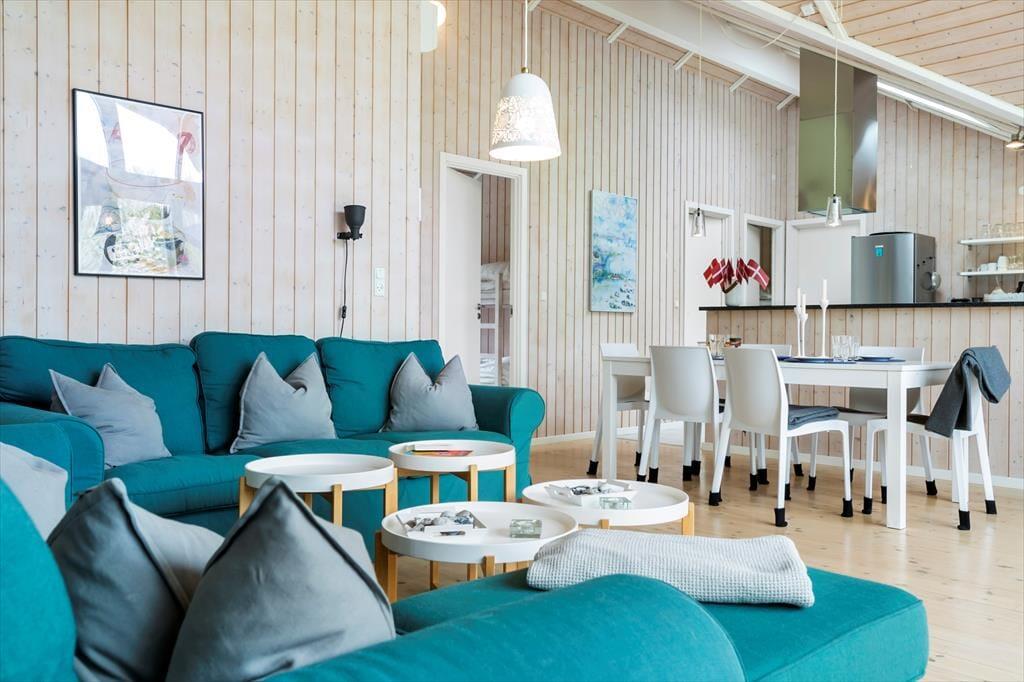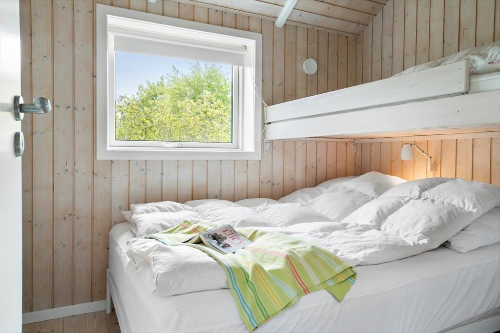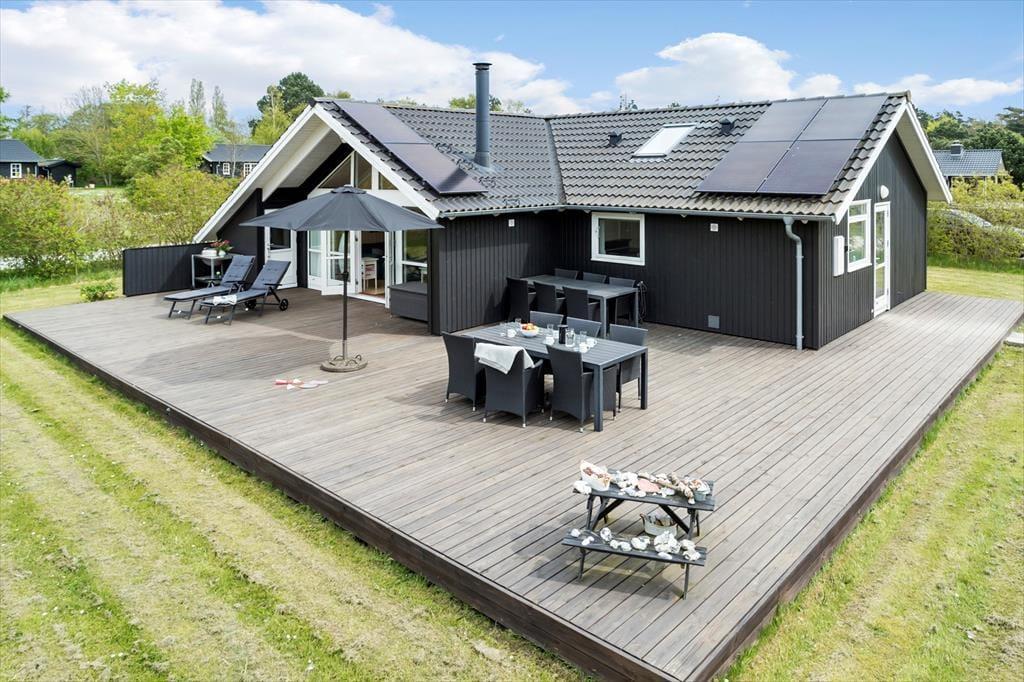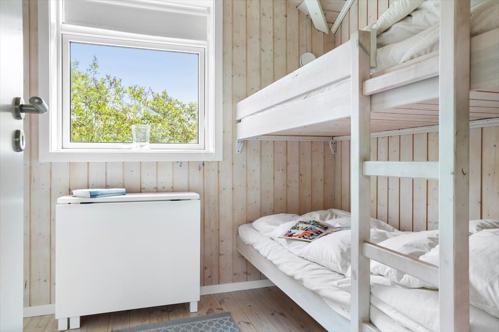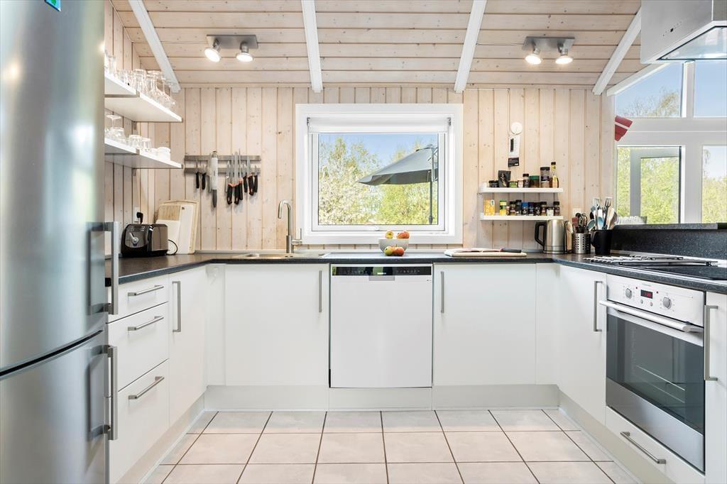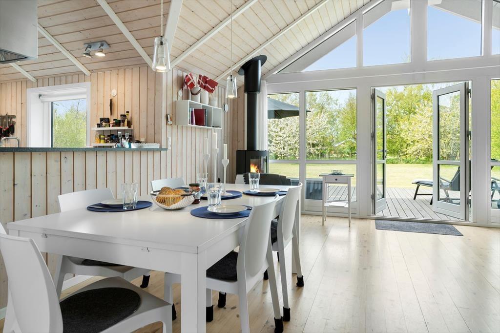 Bei deinem Ferienhaus handelt es sich um ein attraktives, funktionelles und von einem Architekten entworfenes Exemplar, bei dem die zahlreichen schönen Details und die Gemütlichkeit im Fokus stehen. Der Wohnraum fungiert als natürlicher Sammelpunkt aller Mitreisenden. Er ist offen mit dem Essbereich und der Küche kombiniert. Während du es dir in der Polstersitzgruppe mit einem spannenden Buch oder in Gesellschaft deiner Lieben gemütlich machst, sorgt der Kaminofen für behagliche Wärme und ein Maximum an klassischer Ferienhausatmosphäre. Falls du dich ein wenig zurückziehen und entspannen möchtest, oder dir der Sinn nach einem guten Film steht, kannst du dich ein wenig abseits in der geschlossenen Alkove niederlassen. Die großen Wohnraumfenster weisen gen Garten und Terrasse und verwöhnen mit einem reizvollen Tageslichteinfall. Die Terrasse ist vom Wohnraum aus zugänglich und stellt an schönen Sommertagen eine natürliche Erweiterung der Wohnfläche dar. Dank der offenen Wohnlösung genießt du selbst während der Zubereitung der Mahlzeiten in der offenen Küche die Nähe und Gesellschaft deiner Lieben, die beispielsweise am Esstisch Gesellschaftsspiele spielen. Die Küche ist gut ausgestattet und überzeugt mit angenehm viel Arbeitsfläche. Der Essplatz verwöhnt mit einem schönen Ausblick in den grünen Garten. Einer der drei Schlafräume begrüßt dich mit einem Doppelbett. Im zweiten Raum stehen ein Doppelbett und ein darüber angebrachtes Hochbett zur Verfügung. Ein Etagenbett steht im dritten Raum für euch bereit. Die drei Schlafräume präsentieren sich angenehm hell. Jeder Raum verfügt über ausreichend Schrankfläche. Dein Urlaubsdomizil besticht mit hellen Holzdecken und Holzwänden, die maßgeblich zur ausgesprochen schönen und gemütlichen Atmosphäre beitragen.