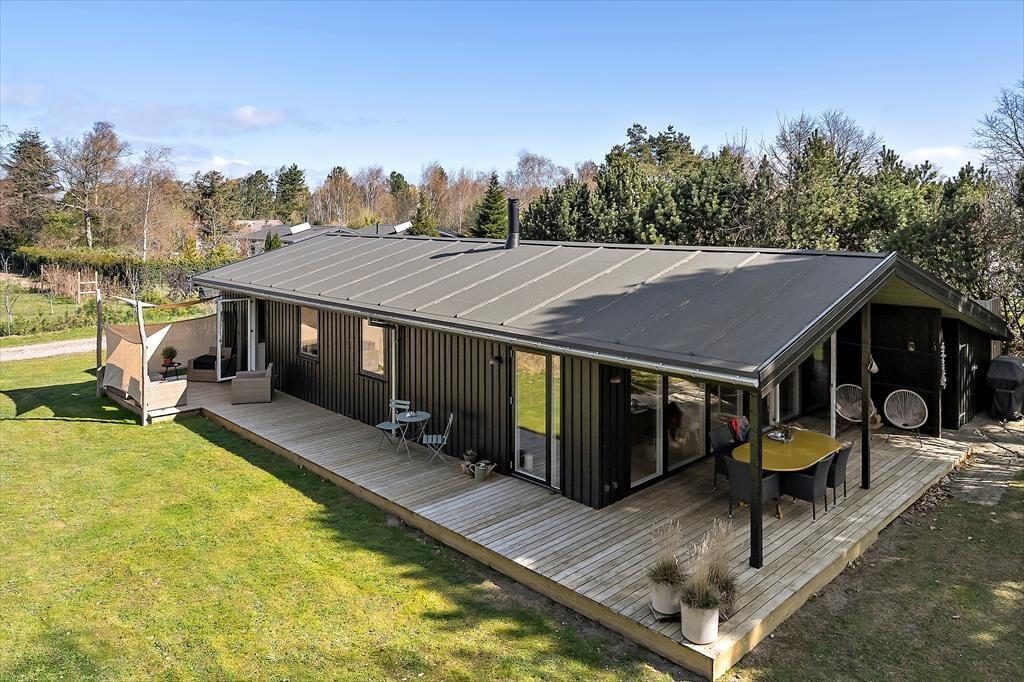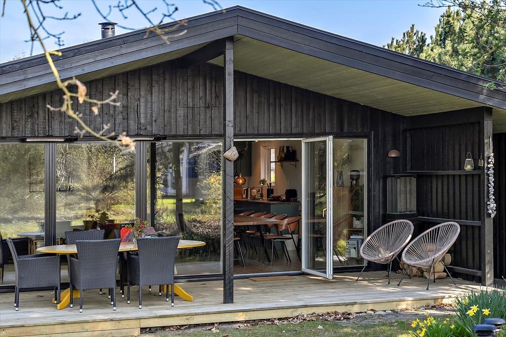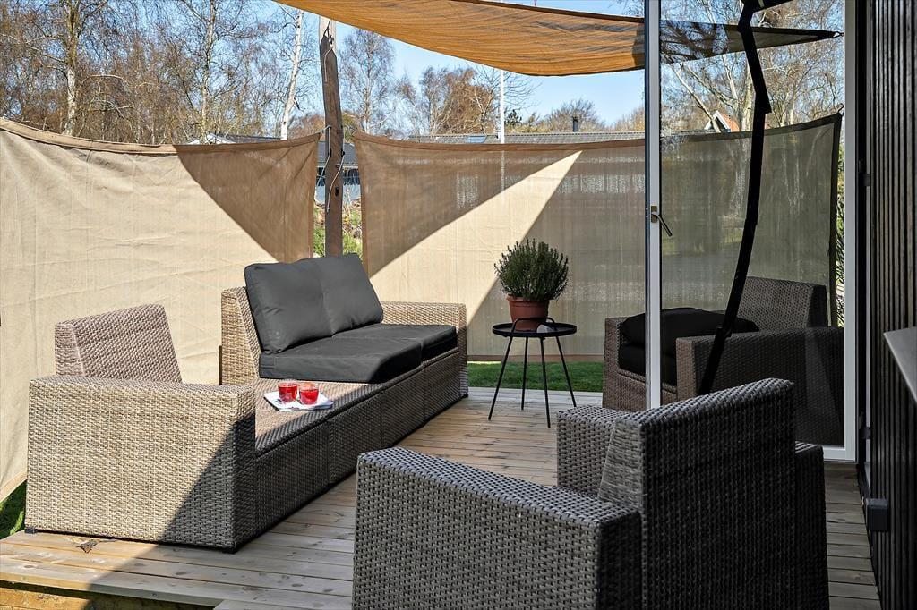 Die große, sonnige Terrasse lädt zum Urlaub unter freiem Himmel ein – hier können Sie auf dem Gasgrill grillen, Ihre Mahlzeiten genießen oder einfach mit einem guten Buch entspannen. Der Garten rund um das Haus ist grün und einladend, und nach einem Strandbesuch können Sie sich unter der Außendusche den Sand abspülen – ein wunderbares Sommer-Detail, das Freiheit und Urlaubsgefühl vermittelt.