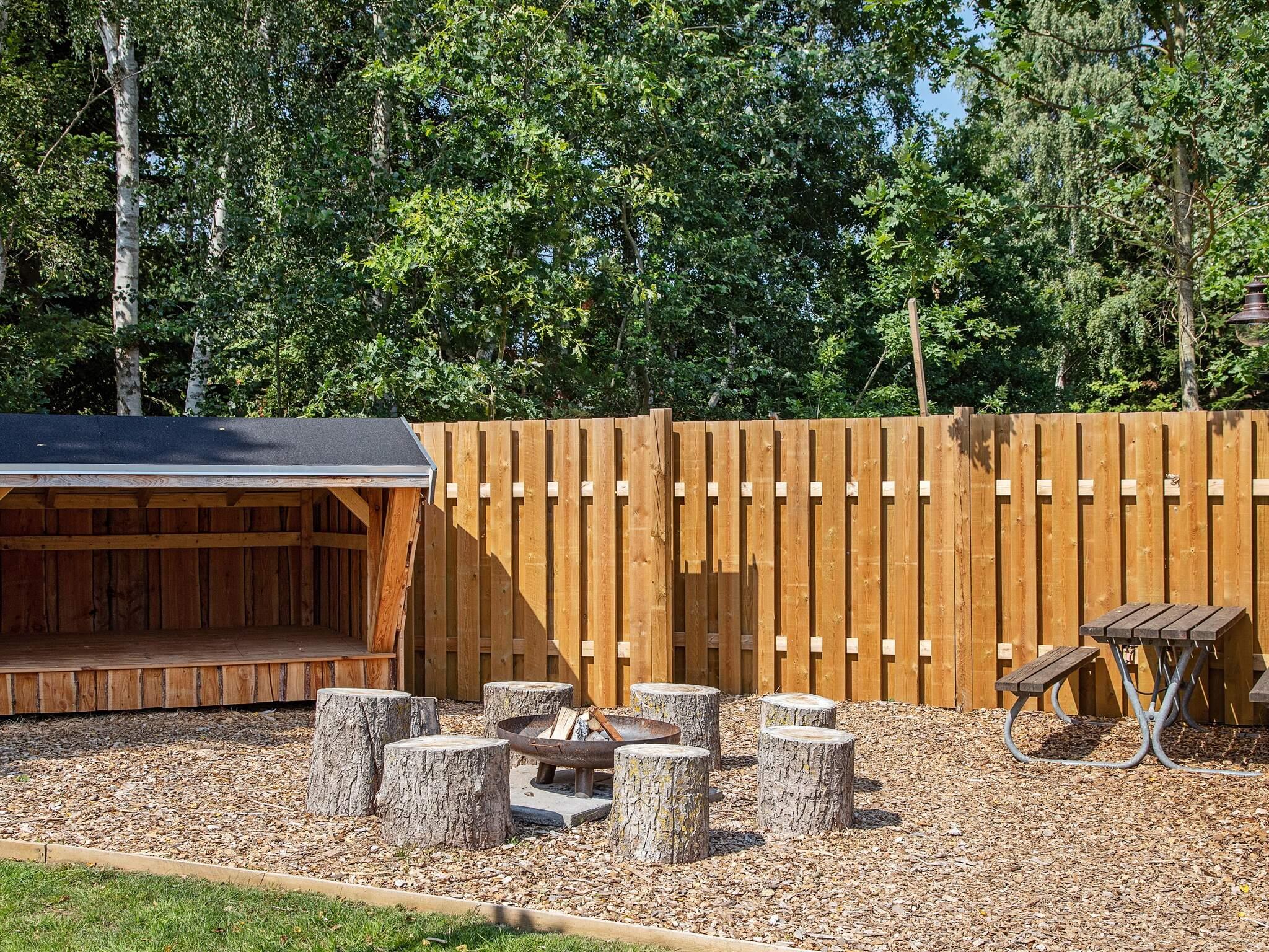 Auf dem Naturgrundstück findet man den großen Außen-Whirlpool für bis zu fünf Personen und eine praktische Außendusche, zudem ein Shelter sowie eine Feuerstelle für ein Lagerfeuer. Die Sauna ist in einem Nebengebäude untergebracht.