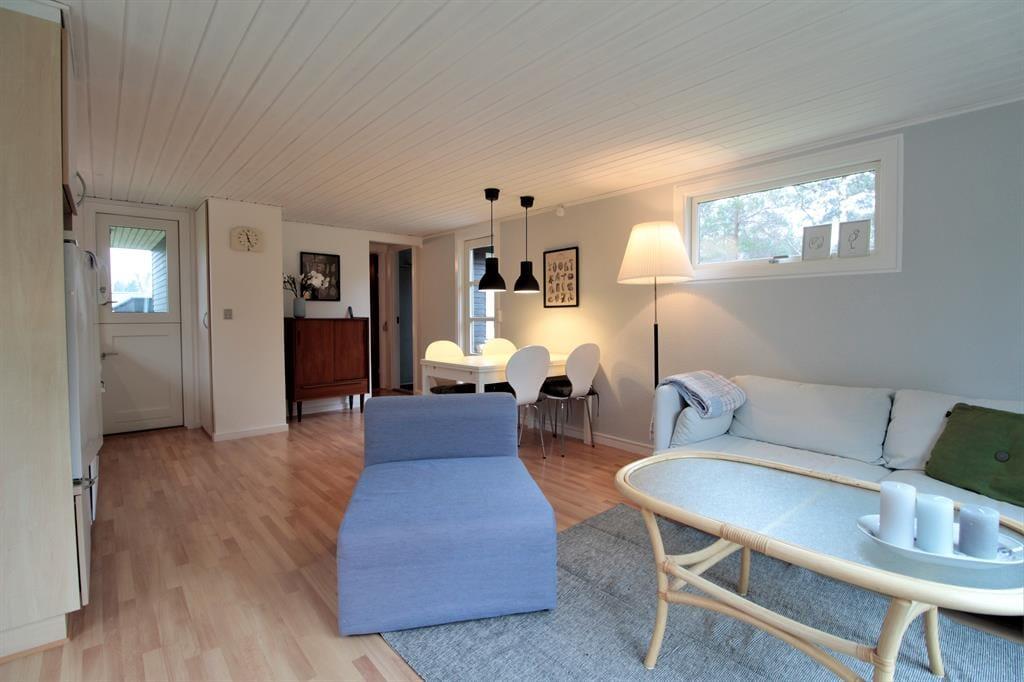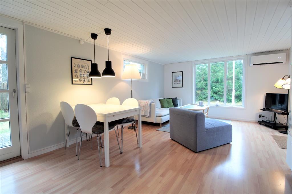 Modern renoviertes und gut ausgestattetes Ferienhaus mit offenem, einladendem Wohnkonzept. Der gemütliche Küchenbereich geht harmonisch in einen Essplatz über und wird durch ein behaglich eingerichtetes Fernsehzimmer mit Sofa und Sessel ergänzt. Von der Wohnküche aus gelangt man in ein separates Schlafzimmer mit Doppelbett und Stauraum sowie in ein Bad mit Dusche und WC.