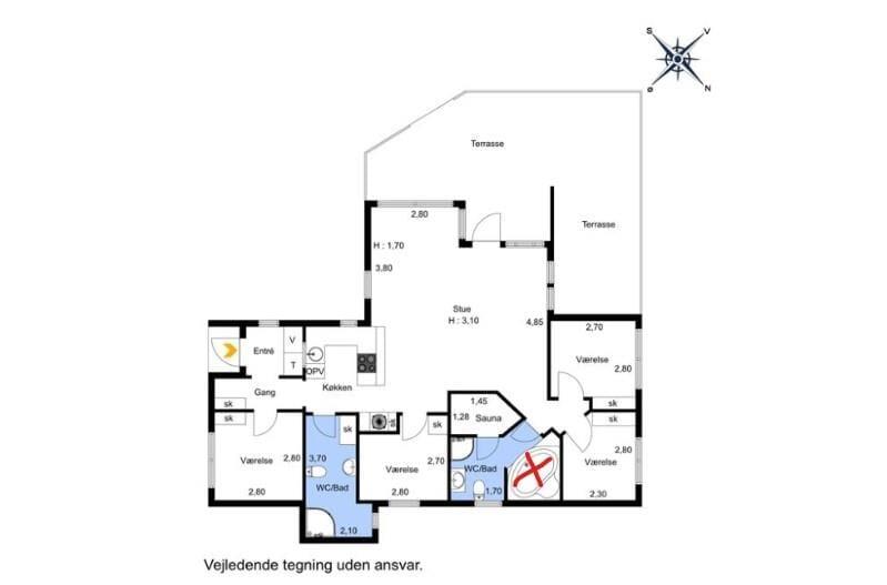 Vom Wohnzimmer gehen die drei weiteren Schlafzimmer ab, sowie ein weiteres Badezimmer, das WC und Dusche und eine Sauna enthält.