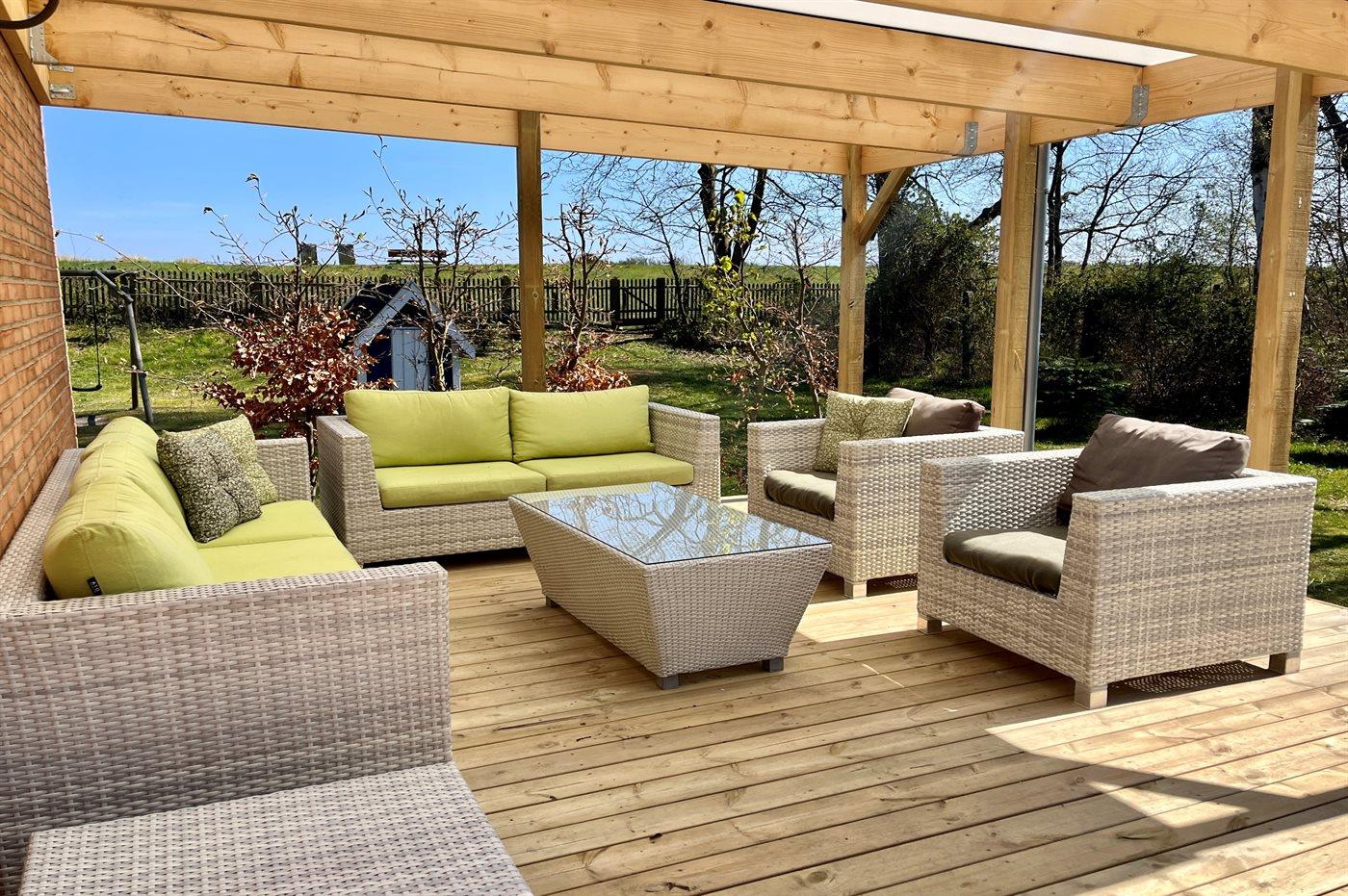 Es steht eine neue, überdachte Terrasse (2023) mit Loungemöbeln zur Verfügung, auf der du die schönen Sommerabende genießen kannst während du dem rauschen der Wellen lauscht.