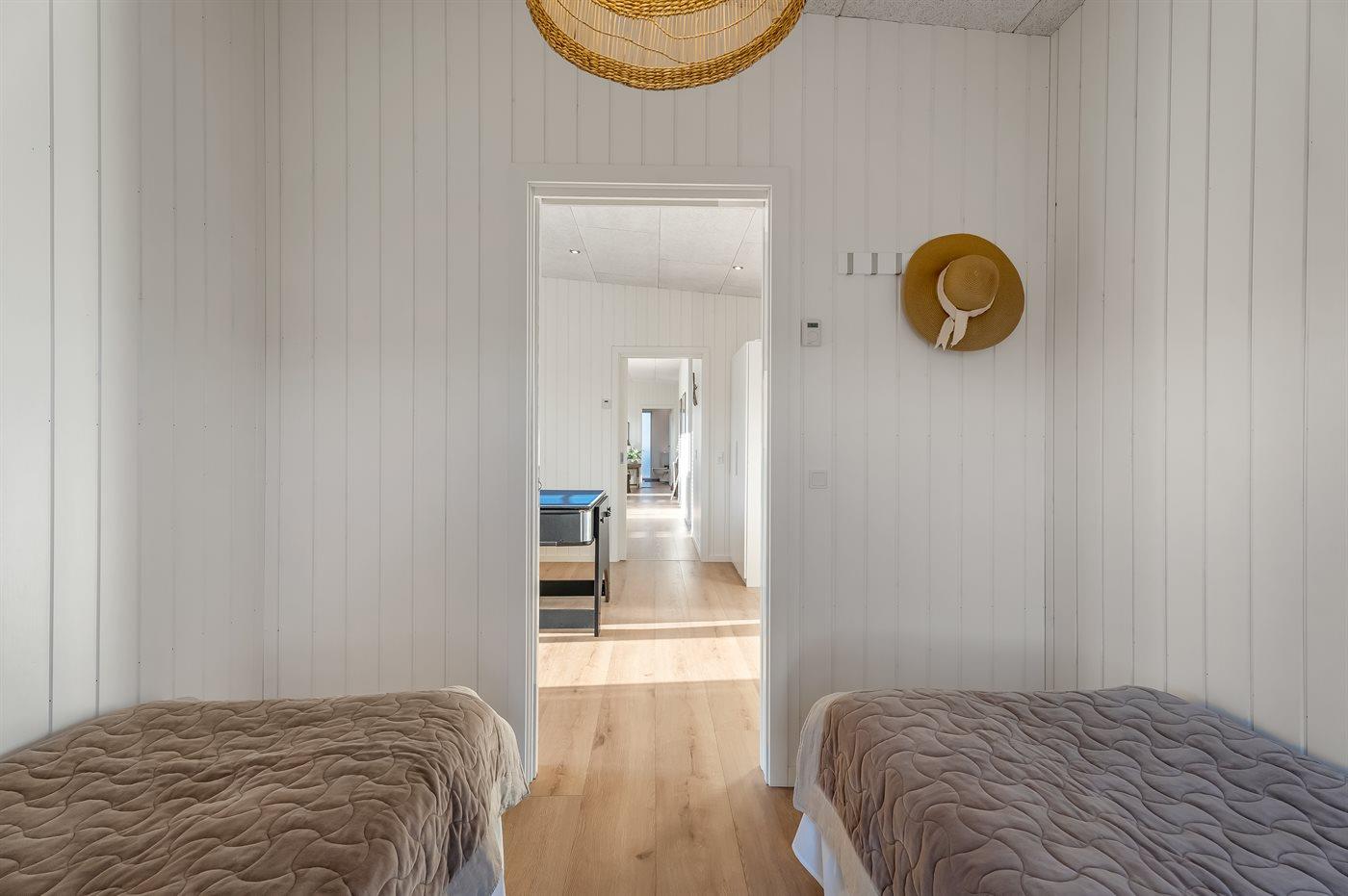 Das Haus verfügt über insgesamt 4 Schlafzimmer: zwei Zimmer mit Doppelbetten (jeweils zwei zusammengestellte Einzelbetten), ein Zimmer mit zwei Einzelbetten sowie ein Zimmer mit einem Etagenbett mit drei Schlafplätzen – ideal für Kinder und Erwachsene. In allen Schlafzimmern sind Verdunklungsvorhänge angebracht.