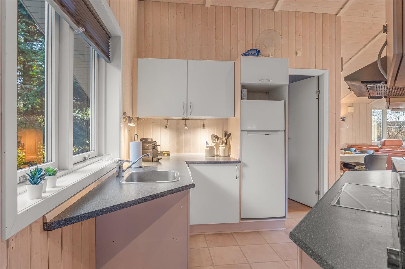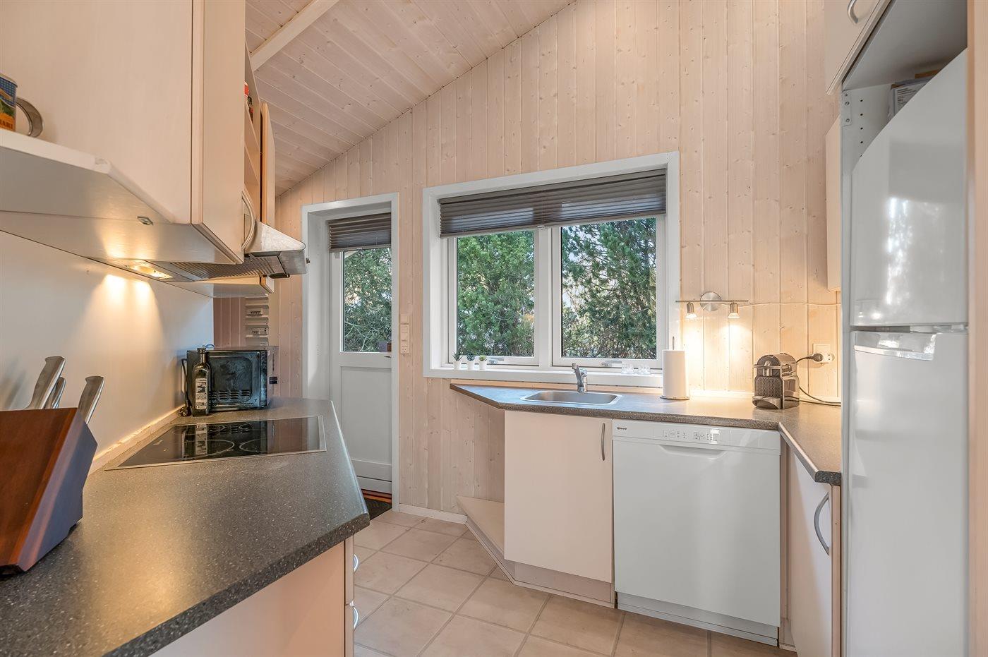 Die Küche ist mit Kühlschrank ausgestattet. Außerdem gibt es 4 Keramik-Kochfelder, Umluftofen sowie Geschirrspüler.