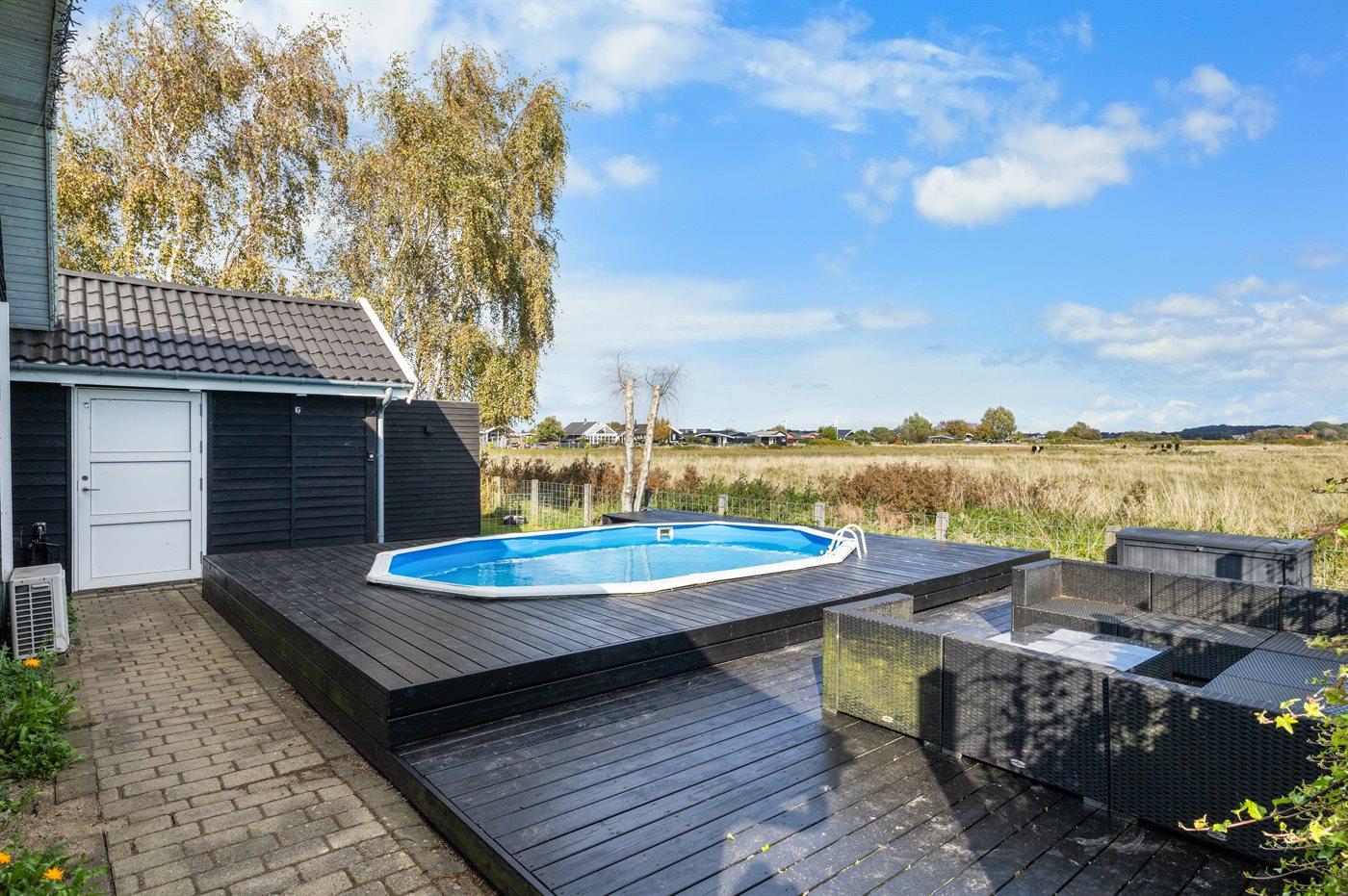 Modernes Ferienhaus mit Außenpool, Terrasse und Blick auf Wiesenlandschaft in Mesinge, Dänemark.